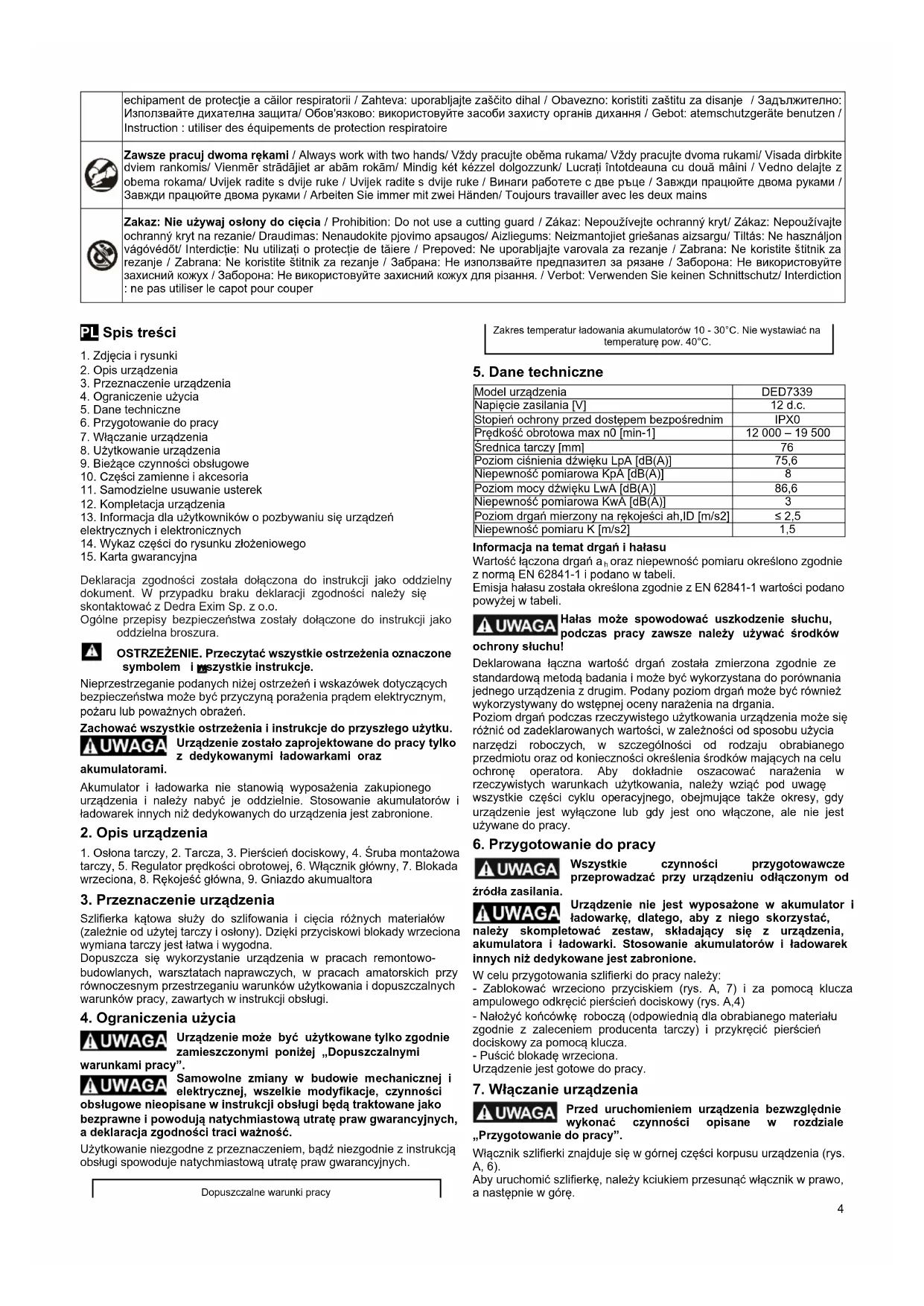 Deklaracja zgodności została dołączona do instrukcji jako oddzielny dokument. W przypadku braku deklaracji zgodności należy się skontaktować z Dedra Exim Sp. z o.o. Ogólne przepisy bezpieczeństwa zostały dołączone do instrukcji jako oddzielna broszura. OSTRZEŻENIE. Przeczytać wszystkie ostrzeżenia oznaczone symbolem i wszystkie instrukcje. Nieprzestrzeganie podanych niżej ostrzeżeń i wskazówek dotyczących bezpieczeństwa może być przyczyną porażenia prądem elektrycznym, pożaru lub poważnych obrażeń. Zachować wszystkie ostrzeżenia i instrukcje do przyszłego użytku. Urządzenie zostało zaprojektowane do pracy tylko z dedykowanymi ładowarkami oraz akumulatorami. Akumulator i ładowarka nie stanowią wyposażenia zakupionego urządzenia i należy nabyć je oddzielnie. Stosowanie akumulatorów i ładowarek innych niż dedykowanych do urządzenia jest zabronione.