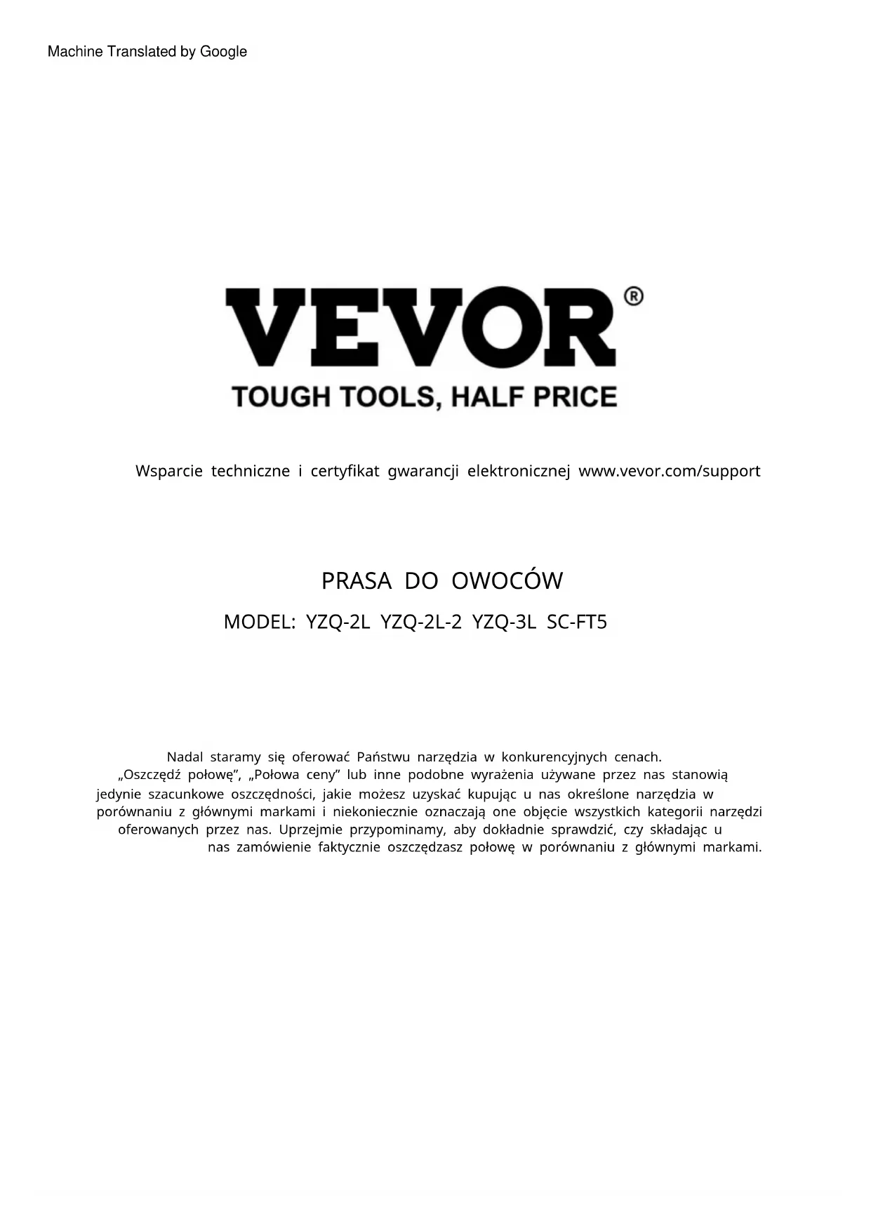 Wsparcie techniczne i certyfikat gwarancji elektronicznej www.vevor.com/support Machine Translated by GoogleMasz pytania dotyczące produktu? Potrzebujesz wsparcia technicznego? Skontaktuj się z nami: MODEL: YZQ-2L YZQ-2L-2 YZQ-3L SC-FT5 To jest oryginalna instrukcja, przed użyciem należy uważnie przeczytać wszystkie instrukcje. VEVOR zastrzega sobie jasną interpretację naszej instrukcji obsługi. Wygląd produktu będzie zależał od produktu, który otrzymałeś. Prosimy o wybaczenie, że nie poinformujemy Cię ponownie, jeśli w naszym produkcie pojawią się jakiekolwiek aktualizacje technologiczne lub oprogramowania. POTRZEBUJESZ POMOCY? SKONTAKTUJ SIĘ Z NAMI! Prasa do owoców Obsługa Klienta@vevor.com