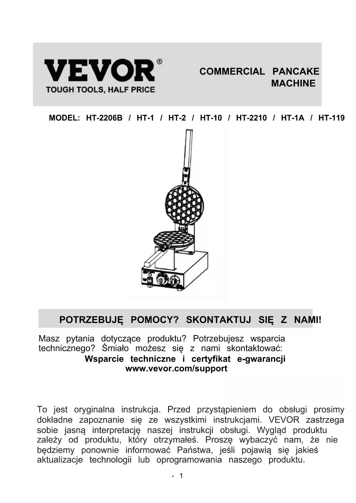 HT-2210 / HT-1A / HT-119 We continue to be committed to provide you tools with competitive price. "Save Half", "Half Price" or any other similar expressions used by us only represents an estimate of savings you might benefit from buying certain tools with us compared to the major top brands and does not necessarily mean to cover all categories of tools offered by us. You are kindly reminded to verify carefully when you are placing an order with us if you are actually saving half in comparison with the top major brands.- 4 -- 1 - MODEL: HT-2206B / HT-1 / HT-2 / HT-10 / HT-2210 / HT-1A / HT-119 POTRZEBUJĘ POMOCY? SKONTAKTUJ SIĘ Z NAMI! Masz pytania dotyczące produktu? Potrzebujesz wsparcia technicznego? Śmiało możesz się z nami skontaktować: Wsparcie techniczne i certyfikat e-gwarancji www.vevor.com/support To jest oryginalna instrukcja. Przed przystąpieniem do obsługi prosimy o dokładne zapoznanie się ze wszystkimi instrukcjami. VEVOR zastrzega sobie jasną interpretację naszej instrukcji obsługi. Wygląd produktu zależy od produktu, który otrzymałeś. Proszę wybaczyć nam, że nie będziemy ponownie informować Państwa, jeśli pojawią się jakieś aktualizacje technologii lub oprogramowania naszego produktu. COMMERCIAL PANCAKE MACHINE- 2 - Ostrzeżenie — aby zmniejszyć ryzyko obrażeń, użytkownik musi uważnie przeczytać instrukcję obsługi. Do użytku wewnątrz. Uważaj na wysokie temperatury, aby zapobiec poparzeniom.