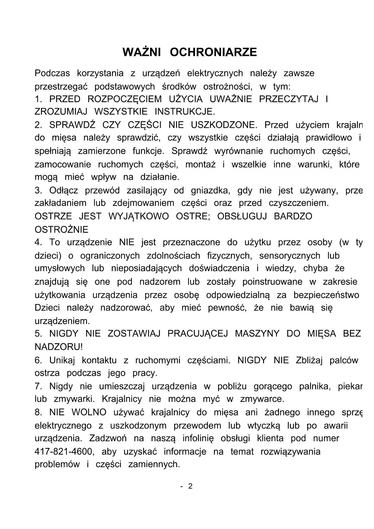 NIE WOLNO uzywać krajalnicy do mięsa aniźadnégo在内的 sprzę elektrycznégo z uszkodzonym przyzewodem lub wtyczka lub po awarii urzadzenia. Zadzwоń na nasza infolinię obstugiientsa pod numer 417-821-4600, aby uzyskać informacja na temat rozwȩzywania problemów i czȩci zamiennych.