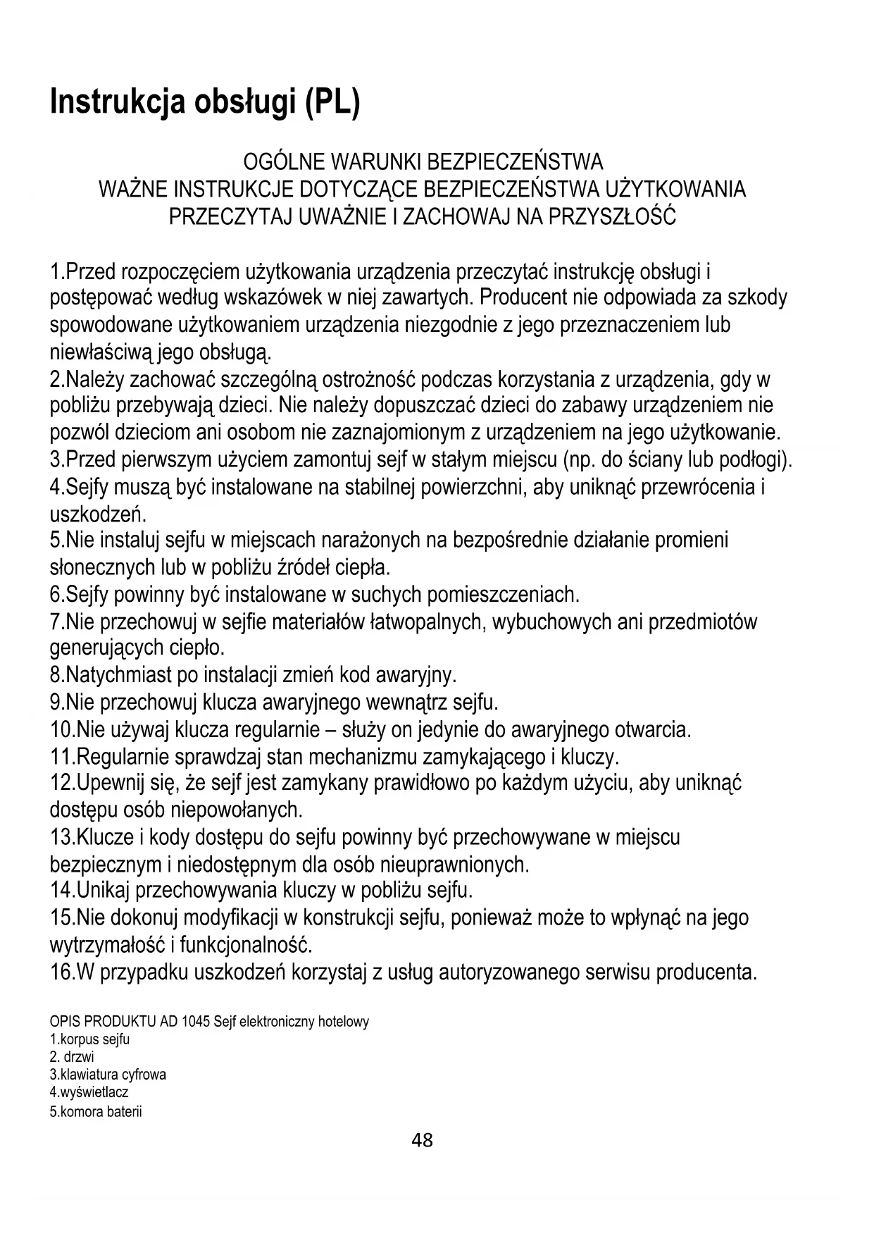 WAŻNE INSTRUKCJE DOTYCZĄCE BEZPIECZEŃSTWA UŻYTKOWANIA PRZECZYTAJ UWAŻNIE I ZACHOWAJ NA PRZYSZŁOŚĆ 1.Przed rozpoczęciem użytkowania urządzenia przeczytać instrukcję obsługi i postępować według wskazówek w niej zawartych. Producent nie odpowiada za szkody spowodowane użytkowaniem urządzenia niezgodnie z jego przeznaczeniem lub niewłaściwą jego obsługą. 2.Należy zachować szczególną ostrożność podczas korzystania z urządzenia, gdy w pobliżu przebywają dzieci. Nie należy dopuszczać dzieci do zabawy urządzeniem nie pozwól dzieciom ani osobom nie zaznajomionym z urządzeniem na jego użytkowanie. 3.Przed pierwszym użyciem zamontuj sejf w stałym miejscu (np. do ściany lub podłogi). 4.Sejfy muszą być instalowane na stabilnej powierzchni, aby uniknąć przewrócenia i uszkodzeń. 5.Nie instaluj sejfu w miejscach narażonych na bezpośrednie działanie promieni słonecznych lub w pobliżu źródeł ciepła. 6.Sejfy powinny być instalowane w suchych pomieszczeniach. 7.Nie przechowuj w sejfie materiałów łatwopalnych, wybuchowych ani przedmiotów generujących ciepło. 8.Natychmiast po instalacji zmień kod awaryjny. 9.Nie przechowuj klucza awaryjnego wewnątrz sejfu. 10.Nie używaj klucza regularnie – służy on jedynie do awaryjnego otwarcia. 11.Regularnie sprawdzaj stan mechanizmu zamykającego i kluczy. 12.Upewnij się, że sejf jest zamykany prawidłowo po każdym użyciu, aby uniknąć dostępu osób niepowołanych. 13.Klucze i kody dostępu do sejfu powinny być przechowywane w miejscu bezpiecznym i niedostępnym dla osób nieuprawnionych. 14.Unikaj przechowywania kluczy w pobliżu sejfu. 15.Nie dokonuj modyfikacji w konstrukcji sejfu, ponieważ może to wpłynąć na jego wytrzymałość i funkcjonalność. 16.W przypadku uszkodzeń korzystaj z usług autoryzowanego serwisu producenta. OPIS PRODUKTU AD 1045 Sejf elektroniczny hotelowy 1.korpus sejfu