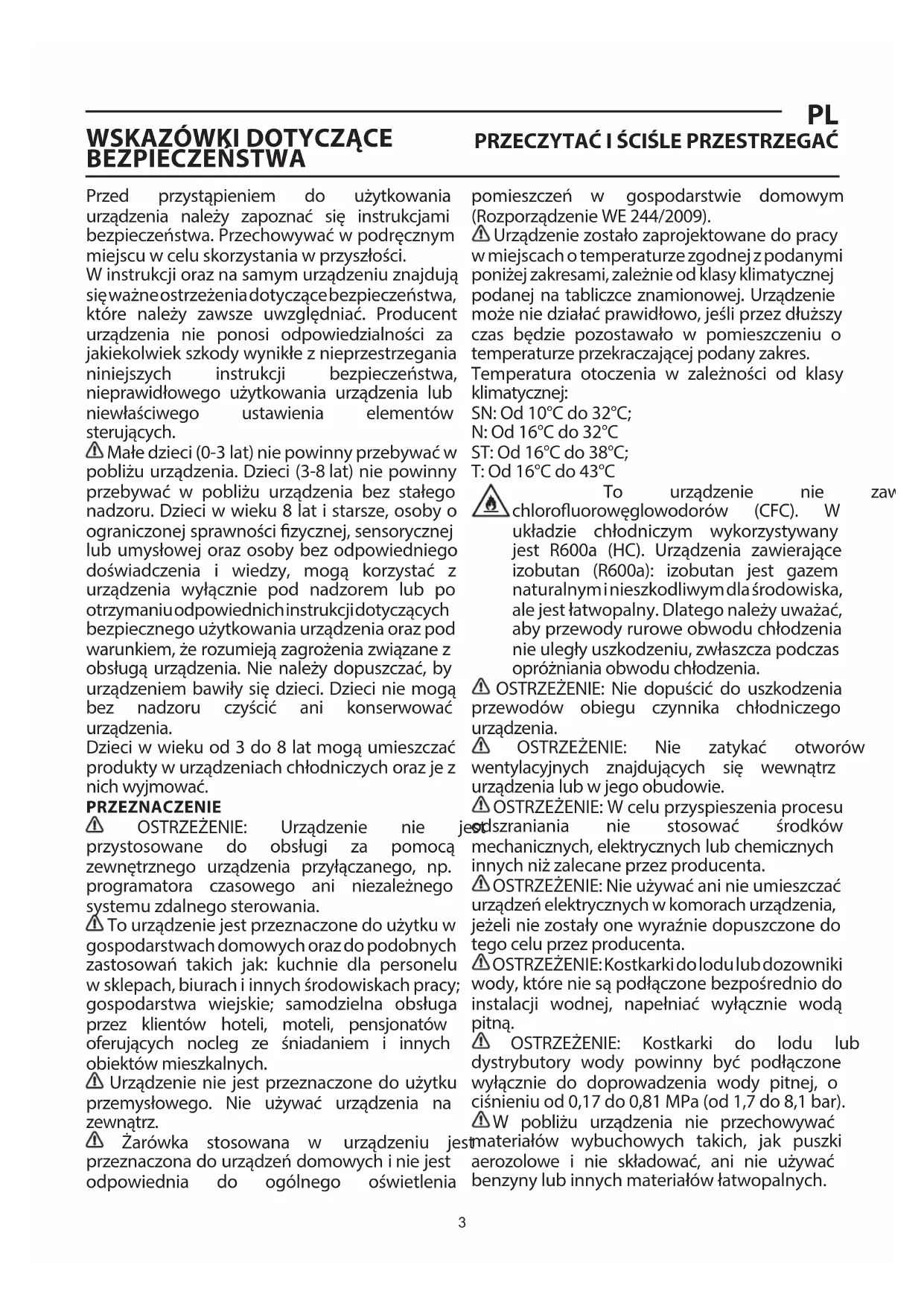 Przed przystąpieniem do użytkowania urządzenia należy zapoznać się instrukcjami bezpieczeństwa. Przechowywać w podręcznym miejscu w celu skorzystania w przyszłości. W instrukcji oraz na samym urządzeniu znajdują się ważne ostrzeżenia dotyczące bezpieczeństwa, które należy zawsze uwzględniać. Producent urządzenia nie ponosi odpowiedzialności za jakiekolwiek szkody wynikłe z nieprzestrzegania niniejszych instrukcji bezpieczeństwa, nieprawidłowego użytkowania urządzenia lub niewłaściwego ustawienia elementów sterujących. Małe dzieci (0-3lat) nie powinny przebywać w pobliżu urządzenia. Dzieci (3-8lat) nie powinny przebywać w pobliżu urządzenia bez stałego nadzoru. Dzieci w wieku 8 lat i starsze, osoby o ograniczonej sprawności zycznej, sensorycznej lub umysłowej oraz osoby bez odpowiedniego doświadczenia i wiedzy, mogą korzystać z urządzenia wyłącznie pod nadzorem lub po otrzymaniu odpowiednich instrukcji dotyczących bezpiecznego użytkowania urządzenia oraz pod warunkiem, że rozumieją zagrożenia związane z obsługą urządzenia. Nie należy dopuszczać, by urządzeniem bawiły się dzieci. Dzieci nie mogą bez nadzoru czyścić ani konserwować urządzenia. Dzieci w wieku od 3 do 8 lat mogą umieszczać produkty w urządzeniach chłodniczych oraz je z nich wyjmować. PRZEZNACZENIE OSTRZEŻENIE: Urządzenie nie jest przystosowane do obsługi za pomocą zewnętrznego urządzenia przyłączanego, np. programatora czasowego ani niezależnego systemu zdalnego sterowania. To urządzenie jest przeznaczone do użytku w gospodarstwach domowych oraz do podobnych zastosowań takich jak: kuchnie dla personelu wsklepach, biurach iinnych środowiskach pracy; gospodarstwa wiejskie; samodzielna obsługa przez klientów hoteli, moteli, pensjonatów oferujących nocleg ze śniadaniem i innych obiektów mieszkalnych. Urządzenie nie jest przeznaczone do użytku przemysłowego. Nie używać urządzenia na zewnątrz. Żarówka stosowana w urządzeniu jest przeznaczona do urządzeń domowych inie jest odpowiednia do ogólnego oświetlenia pomieszczeń w gospodarstwie domowym (Rozporządzenie WE 244/2009). Urządzenie zostało zaprojektowane do pracy w miejscach o temperaturze zgodnej z podanymi poniżej zakresami, zależnie od klasy klimatycznej podanej na tabliczce znamionowej. Urządzenie może nie działać prawidłowo, jeśli przez dłuższy czas będzie pozostawało w pomieszczeniu o temperaturze przekraczającej podany zakres. Temperatura otoczenia w zależności od klasy klimatycznej: SN: Od 10°C do 32°C; N: Od 16°C do 32°C ST: Od 16°C do 38°C; T: Od 16°C do 43°C To urządzenie nie zawiera chlorouorowęglowodorów (CFC). W układzie chłodniczym wykorzystywany jest R600a (HC). Urządzenia zawierające izobutan (R600a): izobutan jest gazem naturalnym i nieszkodliwym dla środowiska, ale jest łatwopalny. Dlatego należy uważać, aby przewody rurowe obwodu chłodzenia nie uległy uszkodzeniu, zwłaszcza podczas opróżniania obwodu chłodzenia. OSTRZEŻENIE: Nie dopuścić do uszkodzenia przewodów obiegu czynnika chłodniczego urządzenia. OSTRZEŻENIE: Nie zatykać otworów wentylacyjnych znajdujących się wewnątrz urządzenia lub w jego obudowie. OSTRZEŻENIE: W celu przyspieszenia procesu odszraniania nie stosować środków mechanicznych, elektrycznych lub chemicznych innych niż zalecane przez producenta. OSTRZEŻENIE: Nie używać ani nie umieszczać urządzeń elektrycznych w komorach urządzenia, jeżeli nie zostały one wyraźnie dopuszczone do tego celu przez producenta. OSTRZEŻENIE: Kostkarki do lodu lub dozowniki wody, które nie są podłączone bezpośrednio do instalacji wodnej, napełniać wyłącznie wodą pitną. OSTRZEŻENIE: Kostkarki do lodu lub dystrybutory wody powinny być podłączone wyłącznie do doprowadzenia wody pitnej, o ciśnieniu od 0,17 do 0,81MPa (od 1,7 do 8,1 bar). W pobliżu urządzenia nie przechowywać materiałów wybuchowych takich, jak puszki aerozolowe i nie składować, ani nie używać benzyny lub innych materiałów łatwopalnych.4 Płyn (nietoksyczny) znajdujący się we wkładach chłodzących (w niektórych modelach) nie nadaje się do picia. Nie spożywać kostek lodu ani lizaków lodowych zaraz po wyjęciu z zamrażarki, gdyż może to spowodować odmrożenia. W przypadku produktów, w których ltr znajduje się wewnątrz pokrywy wentylatora, musi on być zawsze na swoim miejscu podczas pracy chłodziarki. Nie przechowywać szklanych pojemników z płynami w komorze zamrażarki, ponieważ mogą pęknąć. Nie zasłaniać wentylatora (jeśli jest w wyposażeniu) produktami spożywczymi. Po włożeniu żywności sprawdzić, czy drzwiczki komór zamykają się prawidłowo, zwłaszcza drzwiczki zamrażarki. Uszkodzoną uszczelkę należy jak najszybciej wymienić. Komora chłodziarki powinna być używana wyłącznie do przechowywania świeżych produktów żywnościowych, natomiast komora zamrażarki wyłącznie do przechowywania mrożonek, zamrażania świeżych produktów oraz przygotowywania kostek lodu. Nie przechowywać nieopakowanej żywności w komorze chłodziarki lub komorze zamrażarki, aby unikać bezpośredniego kontaktu z ich powierzchniami wewnętrznymi. Urządzenie może być wyposażone wspecjalne komory (komora na świeżą żywność, komora „Zero Degree” itd.). Jeśli wbroszurze danego produktu nie określono inaczej, można je wyjąć, zachowując równoważne poziomy wydajności. C-pentan jest stosowany jako czynnik porotwórczy w piance izolacyjnej i jest gazem palnym. Najbardziej odpowiednie komory urządzenia, w których należy przechowywać określone rodzaje żywności, biorąc pod uwagę różny rozkład temperatur w różnych komorach urządzenia, są następujące: - Komora chłodziarki: