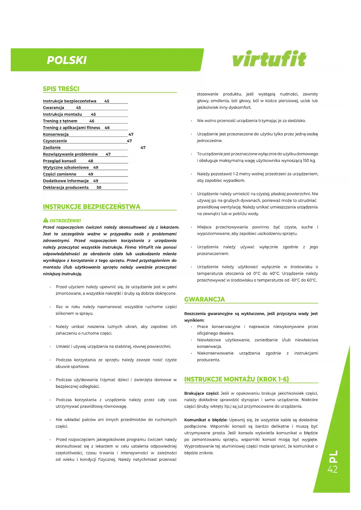 OSTRZEŻENIE! Przed rozpoczęciem ćwiczeń należy skonsultować się z lekarzem. Jest to szczególnie ważne w przypadku osób z problemami zdrowotnymi. Przed rozpoczęciem korzystania z urządzenia należy przeczytać wszystkie instrukcje. Firma VirtuFit nie ponosi odpowiedzialności za obrażenia ciała lub uszkodzenia mienia wynikające z korzystania z tego sprzętu. Przed przystąpieniem do montażu i/lub użytkowania sprzętu należy uważnie przeczytać niniejszą instrukcję.