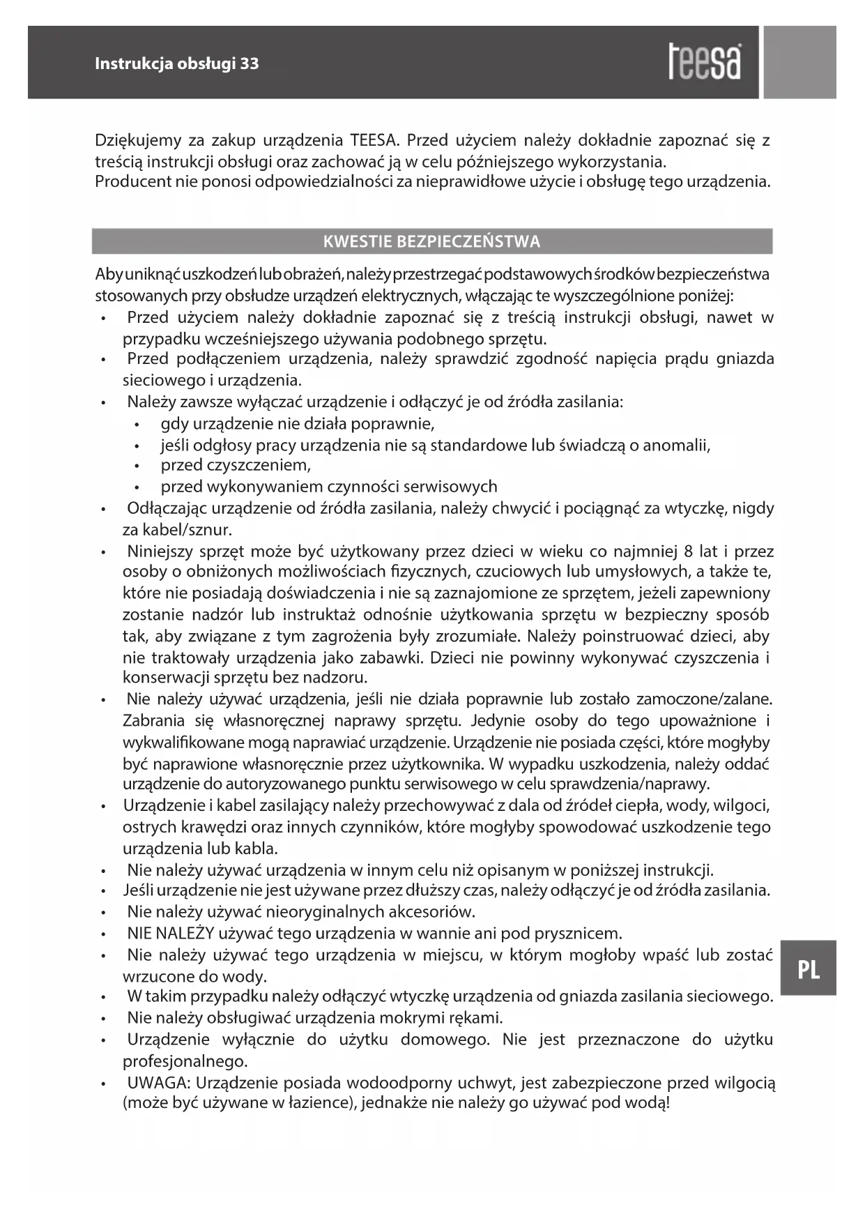 Dziękujemy za zakup urządzenia TEESA. Przed użyciem należy dokładnie zapoznać się z treścią instrukcji obsługi oraz zachować ją w celu późniejszego wykorzystania. Producent nie ponosi odpowiedzialności za nieprawidłowe użycie i obsługę tego urządzenia. Aby uniknąć uszkodzeń lub obrażeń, należy przestrzegać podstawowych środków bezpieczeństwa stosowanych przy obsłudze urządzeń elektrycznych, włączając te wyszczególnione poniżej: