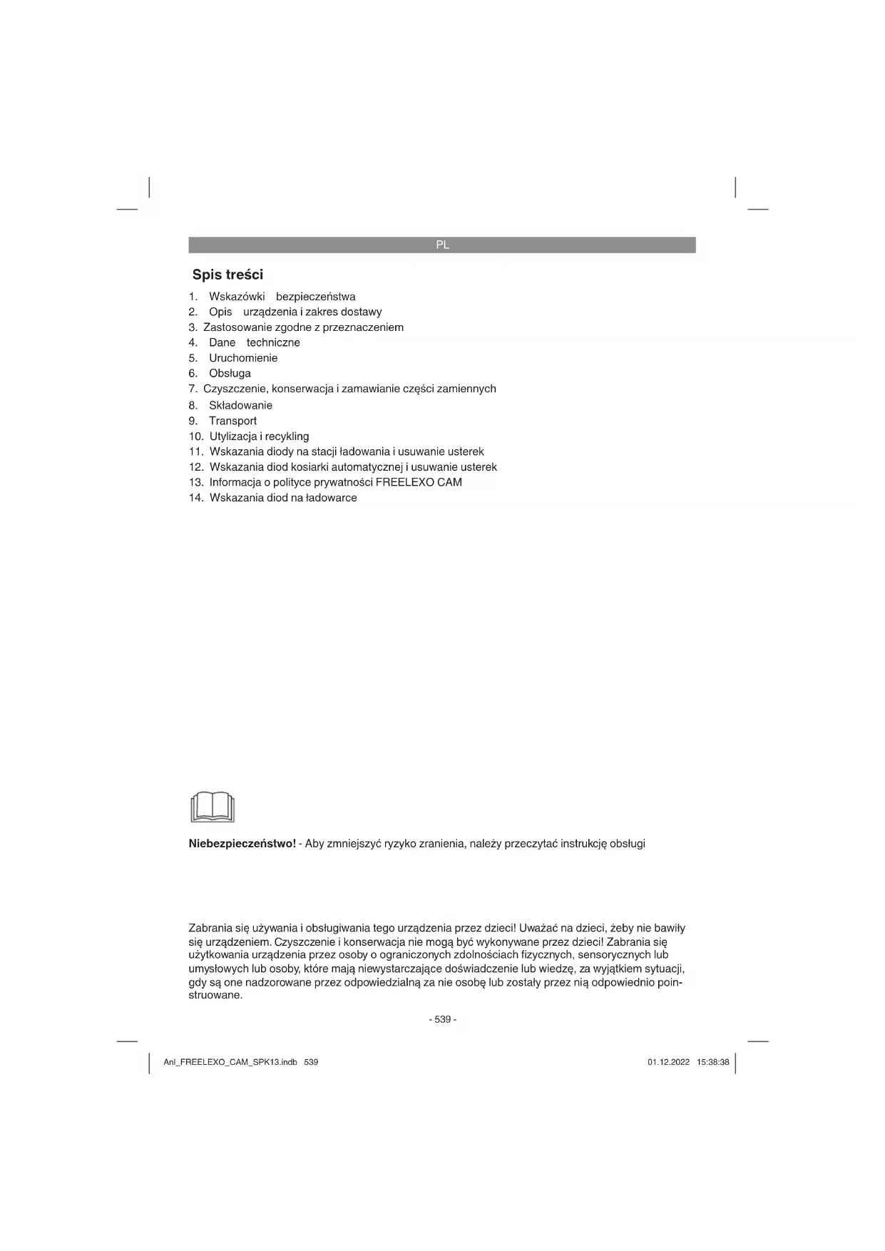 Niebezpieczeństwo! - Aby zmniejszyć ryzyko zranienia, należy przeczytać instrukcję obsługi Zabrania się używania i obsługiwania tego urządzenia przez dzieci! Uważać na dzieci, żeby nie bawiły się urządzeniem. Czyszczenie i konserwacja nie mogą być wykonywane przez dzieci! Zabrania się użytkowania urządzenia przez osoby o ograniczonych zdolnościach fi zycznych, sensorycznych lub umysłowych lub osoby, które mają niewystarczające doświadczenie lub wiedzę, za wyjątkiem sytuacji, gdy są one nadzorowane przez odpowiedzialną za nie osobę lub zostały przez ni ą odpowiednio poin- struowane. Anl_FREELEXO_CAM_SPK13.indb 539Anl_FREELEXO_CAM_SPK13.indb 539 01.12.2022 15:38:3801.12.2022 15:38:38PL