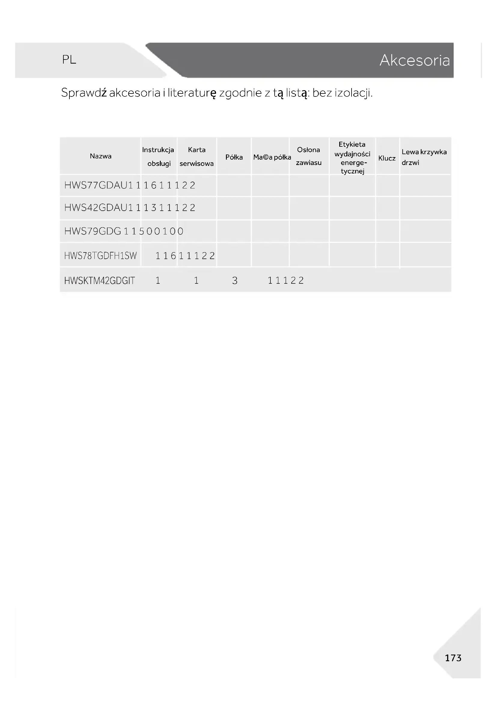 4-Akcesoria Sprawdź akcesoria i literaturę zgodnie z tą listą: bez izolacji. HWS77GDAU1 1 1 6 1 1 1 2 2 HWS42GDAU1 1 1 3 1 1 1 2 2 HWS79GDG 1 1 5 0 0 1 0 0
