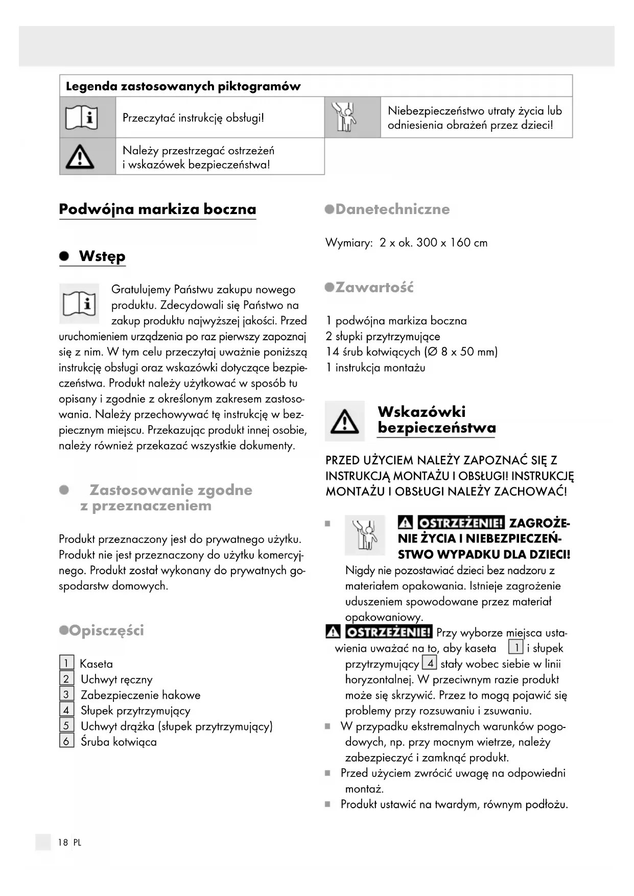 Śruba kotwiąca Dane techniczne Wymiary: 2 x ok. 300 x 160 cm Zawartość 1 podwójna markiza boczna 2 słupki przytrzymujące 14 śrub kotwiących (Ø 8 x 50 mm) 1 instrukcja montażu Wskazówki bezpieczeństwa PRZED UŻYCIEM NALEŻY ZAPOZNAĆ SIĘ Z INSTRUKCJĄ MONTAŻU I OBSŁUGI! INSTRUKCJĘ MONTAŻU I OBSŁUGI NALEŻY ZACHOWAĆ! ZAGROŻE-