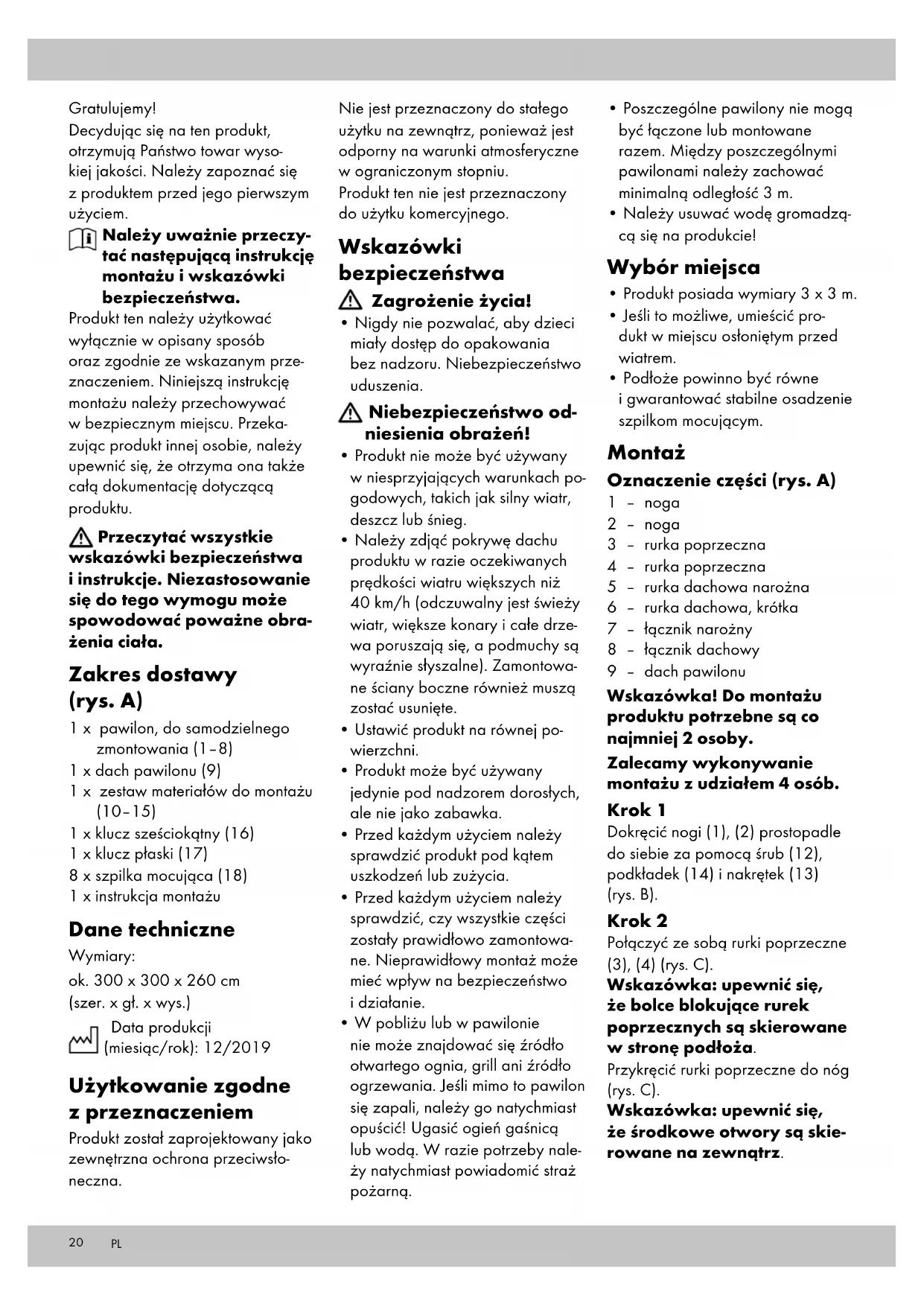 - Podłoże powinno być równe i gwarantować stabilne osadzenie szpilkom mocującym. Montaż Oznaczenie części (rys. A) 1 – noga 2 – noga 3 – rurka poprzeczna 4 – rurka poprzeczna 5 – rurka dachowa narożna 6 – rurka dachowa, krótka 7 – łącznik narożny 8 – łącznik dachowy 9 – dach pawilonu Wskazówka! Do montażu produktu potrzebne są co najmniej 2 osoby. Zalecamy wykonywanie montażu z udziałem 4 osób. Krok 1 Dokręcić nogi (1), (2) prostopadle do siebie za pomocą śrub (12), podkładek (14) i nakrętek (13) (rys. B). Krok 2 Połączyć ze sobą rurki poprzeczne (3), (4) (rys. C). Wskazówka: upewnić się, że bolce blokujące rurek poprzecznych są skierowane w stronę podłoża. Przykręcić rurki poprzeczne do nóg (rys. C). Wskazówka: upewnić się, że środkowe otwory są skie- rowane na zewnątrz. PL21 Krok 3 Przymocować łącznik narożny (7) do kątownika każdej nogi (rys. D). Wskazówka: łączniki naroż- ne muszą być lekko skiero- wane ku górze. Krok 4 Położyć łącznik dachowy (8) na podłodze i włożyć rurki dacho- we (5), (6) w łącznik dachowy (rys. E). Wskazówka: upewnić się, że narożne rurki dachowe za- trzasną się w długich bokach łącznika dachowego. Bolce blokujące muszą być skiero- wane w stronę podłoża, aby uniknąć cofania się wody. Krok 5 Wsunąć narożne rurki dachowe w narożne łączniki (rys. F). Przykręcić rurki dachowe do rurek poprzecznych (rys. F). Krok 6 Naciągnąć dach pawilonu (9) na zmontowany stelaż dachu (rys. G). Użyć pasków na rzepy na dachu pawilonu, aby przymoco- wać go do stelaża dachu. Krok 7 Zawiesić dach pawilonu na nogach (rys. H). Krok 8 Zabezpieczyć produkt za pomocą szpilek mocujących (18) (rys. H). Ostrzeżenie! Sprawdzić, czy szpilki mocujące są moc- no osadzone. Wskazówka: jeżeli stabilne osadzenie szpilek mocują- cych nie jest wystarczające ze względu na luźne warunki gruntowe, to szpilki mocujące muszą być dodatkowo zabez- pieczone lub należy dociążyć nogi pawilonu. Na twardym podłożu bez możliwości użycia szpilek mocujących, produkt musi zostać zakotwiczony. W specjalistycznym sklepie można zapytać o odpowied- ni materiał montażowy dla danego podłoża (brak w za- kresie dostawy). Składanie Krok 1 Wyjąć szpilki mocujące z podłoża. Krok 2 Odczepić haczyki i paski na rzepy oraz zdjąć dach pawilonu. Krok 3 Odkręcić śruby łączące stelaż da- chu i rurki poprzeczne. Odkręcić bolce blokujące z naroż- nych rurek dachowych i narożnych łączników. Ostrożnie! Niebezpieczeń- stwo zakleszczenia! Krok 4 Zdjąć stelaż dachu. Krok 5 Wcisnąć bolce blokujące na rurkach dachowych, aby wyciągnąć rurki dachowe z łącznika dachowego. Krok 6 Odkręcić śruby narożnych łączni- ków i usunąć łączniki. Krok 7 Odkręcić śruby na rurkach po- przecznych i wcisnąć bolce blokują- ce, aby rozdzielić rurki poprzeczne. Krok 8 Odkręcić i wyjąć śruby na nogach. Krok 9 Przechowywać suchy i czysty pro- dukt w temperaturze pokojowej. Przechowywanie, czyszczenie, pielęgnacja Przechowywanie Podczas nieużywania należy zawsze przechowywać produkt w suchym i czystym miejscu, w tem- peraturze pokojowej. Czyszczenie Produkt należy czyścić przy pomocy wilgotnej ściereczki i łagodnego środka czyszczącego. Nie używać benzyny, rozpuszczal- ników ani silnych detergentów. Wskazówka dotycząca pielęgnacji Dach pawilonu może być zabezpie- czany impregnatem w sprayu. Uwagi odnośnie recy- klingu Artykuł oraz materiały opakowanio- we należy usunąć zgodnie z aktu- alnymi przepisami obowiązującymi w danym miejscu. Materiały opa- kowaniowe, jak np. worki foliowe nie powinny znaleźć się w rękach dzieci. Materiał opakowaniowy należy przechowywać w miejscu niedostępnym dla dzieci. Zutylizować produkt i opako- wanie w sposób przyjazny dla środowiska. Kod materiału do recyklingu służy do oznaczenia różnych materiałów przeznaczonych do zwrotu do przetwórstwa wtórnego (recyklingu). Kod składa się z symbolu, który powinien odzwiercie- dlać cykl odzysku, oraz numeru oznaczającego materiał. Wskazówki dotyczące gwarancji i obsługi serwisowej Produkt został wyprodukowany bardzo starannie i podczas stałej kontroli. Państwo otrzymują na ten produkt trzy lata gwarancji od daty zakupu. Prosimy o zachowanie paragonu. Gwarancja obejmuje tylko błędy materiałowe lub fabryczne i traci ważność podczas używania pro- duktu nie właściwie i nie zgodnie z jego przeznaczeniem. Państwa prawa, w szczególności zasady od- powiedzialności z tytułu rękojmi, nie zostaną ograniczone tą gwarancję. PL22 W razie ewentualnych reklama- cji należy skontaktować się pod niżej podanym numerem infolinii lub poprzez pocztę elektroniczną. Nasi współpracownicy omówią z Państwem jak najszybciej dalszy przebieg sprawy. Z naszej strony gwarantujemy doradztwo. W przypadku wymiany części lub całego artykułu okres gwarancji przedłuża się o trzy lata zgodnie z art. 581 § 1 kodeksu cywilnego. Po upłynięciu czasu gwarancji powsta- łe naprawy są płatne. IAN: 332795_1907 Serwis Polska Tel.: 22 397 4996 E-Mail: deltasport@lidl.pl PL23 Srdečně blahopřejeme! Svým nákupem jste se rozhodli pro kvalitní výrobek. Před prvním po- užitím se prosím seznamte s tímto výrobkem. Pozorně si přečtete násle- dující návod k sestavení a bezpečnostní pokyny. Používejte tento výrobek pouze tak, jak je popsáno, a pro uvedené úče- ly. Dobře si tento návod k sestavení uschovejte. Pokud výrobek předáte třetí osobě, předejte jí i veškerou dokumentaci. Přečtěte si všechny bez- pečnostní pokyny a návody. Opomenutí jejich dodržování může zapříčinit vážná pora- nění. Obsah balení (obr. A) 1 x pavilon, rozložený (1–8) 1 x střecha pavilonu (9) 1 x montážní materiál (10–15) 1 x šestihranný klíč (16) 1 x klíč na šrouby (17) 8 x kotvící kolí
