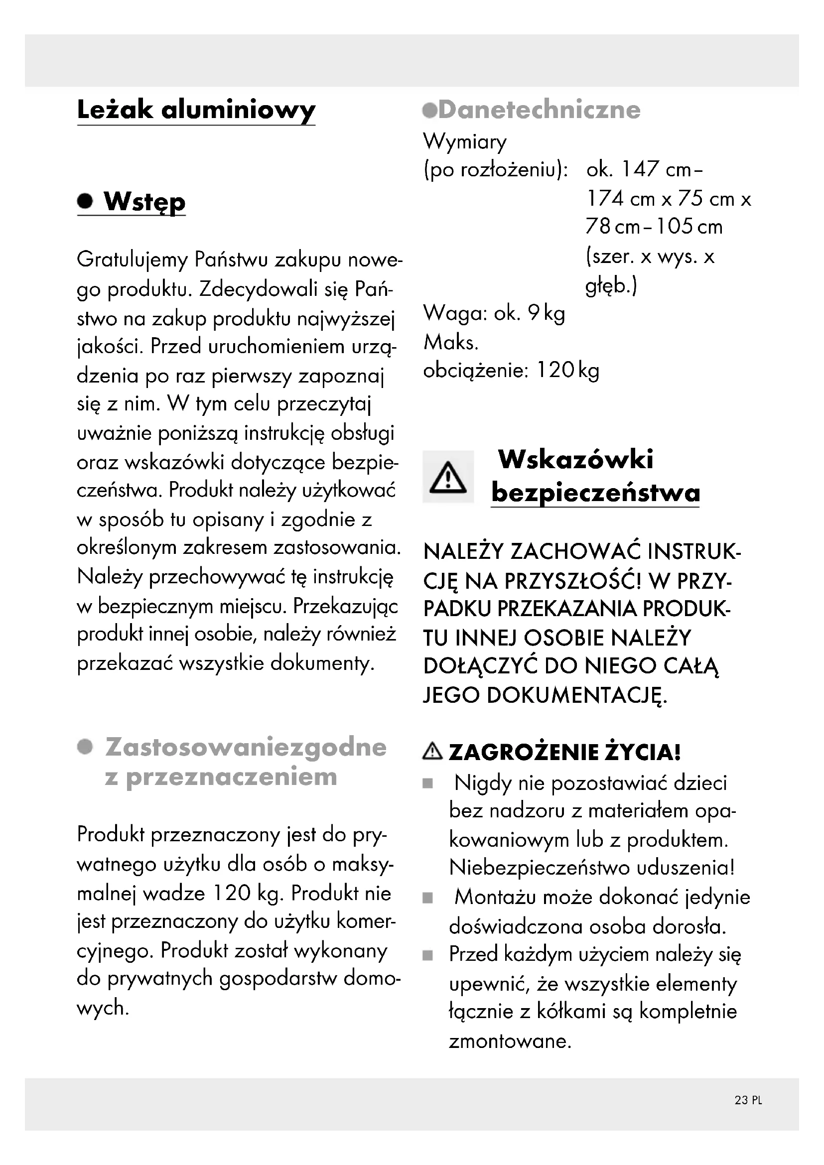 JEGO DOKUMENTACJĘ. ZAGROŻENIE ŻYCIA! Nigdy nie pozostawiać dzieci bez nadzoru z materiałem opa- kowaniowym lub z produktem. Niebezpieczeństwo uduszenia! Montażu może dokonać jedynie doświadczona osoba dorosła. Przed każdym użyciem należy się upewnić, że wszystkie elementy łącznie z kółkami są kompletnie zmontowane.24 PL Produkt mógłby utracić stabilność i przechylić się na bok lub prze- wrócić. Może to prowadzić do poważnych obrażeń ciała lub szkód rzeczowych. Nie używać produktu w pobliżu otwartego ognia. Przy rozpakowywaniu lub roz- kładaniu produktu należy za- chować ostrożność. Przed użyciem należy sprawdzić właściwą stabilność produktu. Należy uważać na to, aby arty- kuł stał na równym i stabilnym podłożu. Należy przestrzegać maksymal- nego obciążenia 120 kg. Jeśli zostanie przekroczona ta grani- ca wagi, może dojść do obrażeń ciała i/lub szkód rzeczowych. Ręce należy trzymać z dala od składanego mechanizmu, aby uniknąć obrażeń ciała. Przed użyciem produktu należy upewnić się, że mechanizm skła- dany jest poprawnie zablokowany. Przed użyciem należy się upewnić, że produkt jest całkowicie rozło- żony. Produkt może być używany wy- łącznie pod nadzorem dorosłych i nie jako zabawka. Produktu może używać tylko jedna osoba naraz. Produkt należy sprawdzić przed każdym użyciem pod kątem uszkodzenia lub zużycia. Pro- duktu należy używać tylko jeśli jest w nienagannym stanie. Nie używać produktu w razie stwier- dzenia widocznych uszkodzeń lub przypuszczenia, że takie mogą być. W przypadku ekstremalnych warunków pogodowych, np. przy mocnym wietrze, należy zabezpieczyć produkt. Produkt przechowywać w chronionym pomieszczeniu. Proszę nie stawać na produkcie. NIEBEZPIECZEŃSTWO