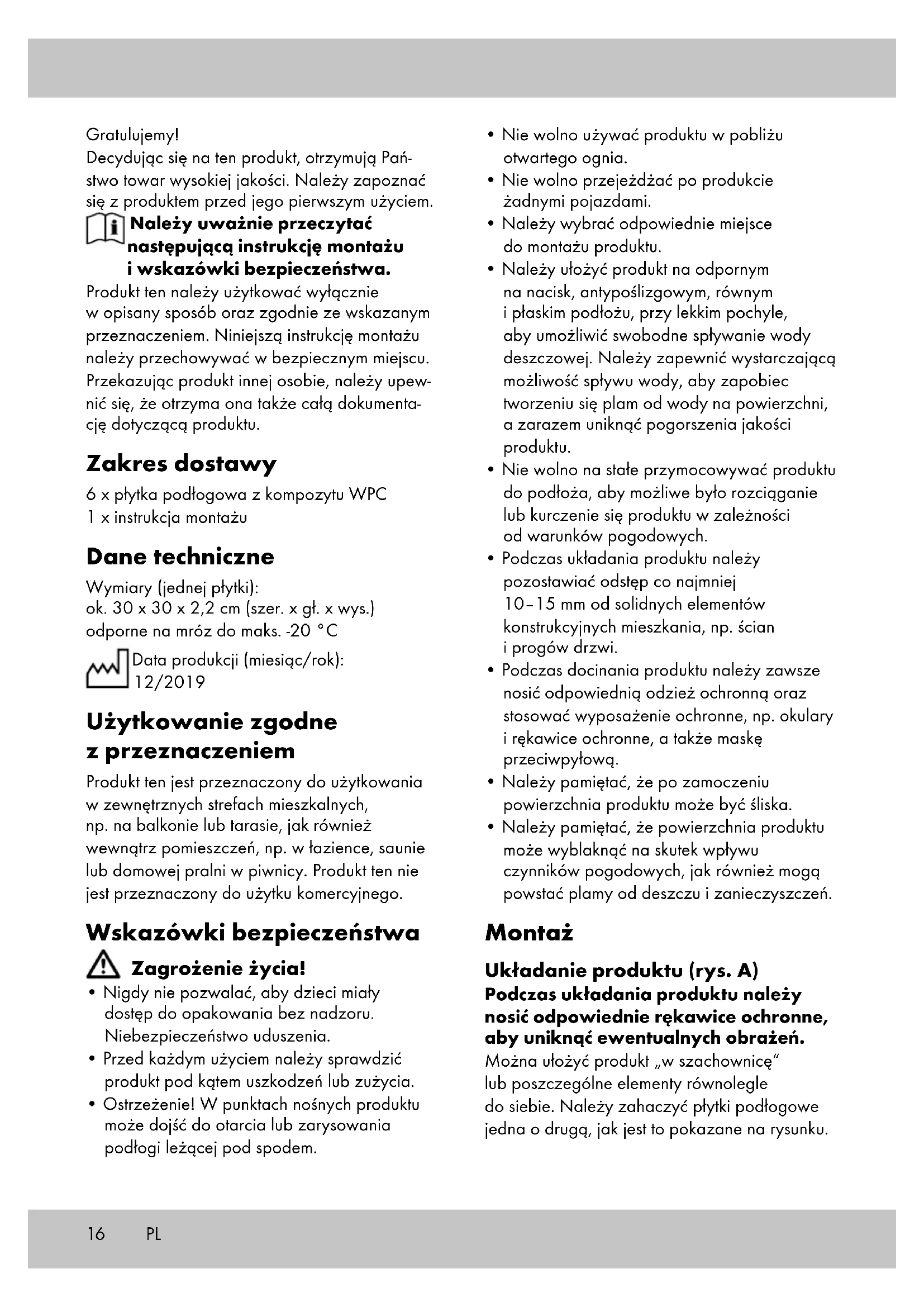 - Aby dodatkowo zabezpieczyć produkt przed plamami od wody, zalecamy usuwanie zalegającej wody z produktu za pomocą ściągacza. Uwagi odnośnie recyklingu Artykuł oraz materiały opakowaniowe nale- ży usunąć zgodnie z aktualnymi przepisami obowiązującymi w danym miejscu. Materiały opakowaniowe, jak np. worki foliowe nie powinny znaleźć się w rękach dzieci. Materiał opakowaniowy należy przechowywać w miej- scu niedostępnym dla dzieci. Zutylizować produkt i opakowanie w sposób przyjazny dla środowiska. Kod materiału do recyklingu służy do oznaczenia różnych materiałów przeznaczonych do zwrotu do przetwór- stwa wtórnego (recyklingu). Kod składa się z symbolu, który powinien odzwierciedlać cykl odzysku, oraz numeru oznaczającego materiał. Wskazówki dotyczące gwa- rancji i obsługi serwisowej Produkt został wyprodukowany bardzo starannie i podczas stałej kontroli. Państwo otrzymują na ten produkt trzy lata gwarancji od daty zakupu. Prosimy o zachowanie paragonu. Gwarancja obejmuje tylko błędy materiałowe lub fabryczne i traci ważność podczas używania produktu nie właściwie i nie zgodnie z jego prze- znaczeniem. Państwa prawa, w szczególności zasady odpowiedzialności z tytułu rękojmi, nie zostaną ograniczone tą gwarancję. PL18 W razie ewentualnych reklamacji należy skontaktować się pod niżej podanym numerem infolinii lub poprzez pocztę elektroniczną. Nasi współpracownicy omówią z Państwem jak naj- szybciej dalszy przebieg sprawy. Z naszej strony gwarantujemy doradztwo. W przypadku wymiany części lub całego artykułu okres gwarancji przedłuża się o trzy lata zgodnie z art. 581 § 1 kodeksu cywilnego. Po upłynięciu czasu gwarancji powstałe naprawy są płatne. IAN: 317233_1904 Serwis Polska Tel.: 22 397 4996 E-Mail: deltasport@lidl.pl PL19 Srdečně blahopřejeme! Svým nákupem jste se rozhodli pro kvalitní výro- bek. Před prvním použitím se prosím seznamte s tímto výrobkem. Pozorně si přečtete následující návod k sestavení a bezpečnostní pokyny. Používejte tento výrobek pouze tak, jak je popsá- no, a pro uvedené účely. Dobře si tento návod k sestavení uschovejte. Pokud výrobek předáte třetí osobě, předejte jí i veškerou dokumentaci. Obsah balení 6 x WPC dlaždice 1 x návod k sestavení Technické údaje Rozměry (jednoho kusu): cca 30 x 30 x 2,2 cm (š x h x v) odolné vůči mrazu do max. -20 °C Datum výroby (měsíc/rok): 12/2019 Použití dle určení Výrobek je určen k použití do venkovního obytného prostoru, např. na balkon či terasu, a interiéru, například do koupelny, sauny nebo prádelny. Výrobek není určen pro komerční použití. Bezpečnostní pokyny Nebezpečí ohrožení života!