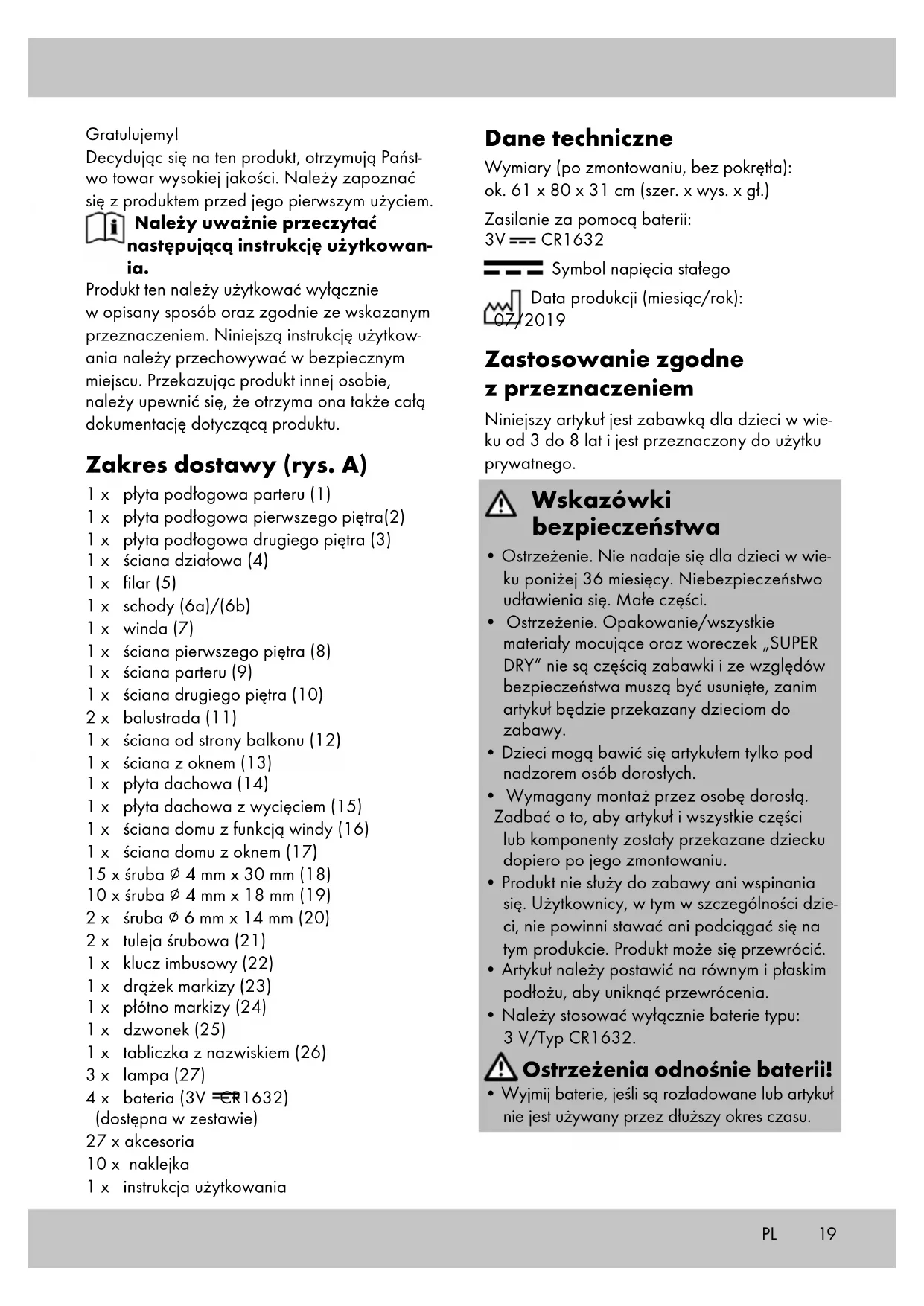 lub lampy (27) i przymocować dzwonek lub lampę do domku dla lalek. Przechowywanie, czyszcze- nie Podczas nieużywania należy zawsze przechowywać produkt w suchym i czystym miejscu, z wyjętymi bateriami, w temperaturze pokojowej. Wycierać do czysta jedynie suchą ściereczką. WAŻNE! Nie czyścić przy użyciu ostrych środków czyszczących. Uwagi odnośnie recyklingu Artykuł oraz materiały opakowaniowe należy usunąć zgodnie z aktualnymi przepisami obowiązującymi w danym miejscu. Materiały opakowaniowe, jak np. worki foliowe nie powinny znaleźć się w rękach dzieci. Materiał opakowaniowy należy przechowywać w miejs- cu niedostępnym dla dzieci. Zutylizować produkt i opakowanie w sposób przyjazny dla środowiska. Kod materiału do recyklingu służy do oznaczenia różnych materiałów przeznaczonych do zwrotu do przetwór- stwa wtórnego (recyklingu). Kod składa się z symbolu, który powinien odzwierciedlać cykl odzysku, oraz numeru oznaczającego materiał. Urządzeń oznakowanych znajdującym się obok symbolem nie wolno wyrzucać razem z odpadami z gospodarstwa domowego. Urządzenia elektryczne i elektroniczne muszą być zbierane i utylizowane oddzielnie. Należy uzyskać informacje w lokalnej gminie odnośnie utylizacji zgodnej z przepisami. Przed utylizacją należy wyjąć baterię z artykułu. Usuwanie baterii Należy zwrócić uwagę: Baterie są odpadami specjalnymi, które zgodnie z przepisami nie mogą być wyrzucane razem z odpadami z gospodarstwa domowego. Zużyte baterie można oddać bezpłatnie w gminnych punktach zbiorczych lub do sklepu. Udostępnia się tu odpowiednie pojemniki na odpady. Wskazówki dotyczące gwa- rancji i obsługi serwisowej Produkt został wyprodukowany bardzo staran- nie i podczas stałej kontroli. Państwo otrzymują na ten produkt trzy lata gwarancji od daty zakupu. Prosimy o zachowanie paragonu. Gwarancja obejmuje tylko błędy materiałowe lub fabryczne i traci ważność podczas używania produktu nie właściwie i nie zgod- nie z jego przeznaczeniem. Państwa prawa, w szczególności zasady odpowiedzialności z tytułu rękojmi, nie zostaną ograniczone tą gwarancję. W razie ewentualnych reklamacji należy skontaktować się pod niżej podanym numerem infolinii lub poprzez pocztę elektroniczną. Nasi współpracownicy omówią z Państwem jak najs- zybciej dalszy przebieg sprawy. Z naszej strony gwarantujemy doradztwo. W przypadku wymiany części lub całego artykułu okres gwarancji przedłuża się o trzy lata zgodnie z art. 581 § 1 kodeksu cywilnego. Po upłynięciu czasu gwarancji powstałe napra- wy są płatne. IAN: 321239_1901 Serwis Polska Tel.: 22 397 4996 E-Mail: deltasport@lidl.pl PL22 Srdečně blahopřejeme! Svým nákupem jste se rozhodli pro kvalitní výrobek. Před prvním použitím se prosím seznamte s tímto výrobkem. Pozorně si přečtete následující návod k použití. Používejte tento výrobek pouze tak, jak je popsáno, a pro uvedené účely. Uschovejte si tento návod k použití pro budoucí použití. Pokud výrobek předáte třetí osobě, předejte jí i vešker- ou dokumentaci. Rozsah dodávky (obr. A) 1 x základová deska přízemí (1) 1 x základová deska první patro (2) 1 x základová deska druhé patro (3) 1 x příčka (4) 1 x sloupek (5) 1 x schody (6a)/(6b) 1 x výtah (7) 1 x stěna první patro (8) 1 x stěna přízemí (9) 1 x stěna druhé patro (10) 2 x zábradlí (11) 1 x stěna k balkónu (12) 1 x stěna s oknem (13) 1 x deska střechy (14) 1 x deska střechy s výřezem (15) 1 x stěna domu s funkcí výtahu (16) 1 x stěna domu s oknem (17) 15 x šroub ∅ 4 mm x 30 mm (18) 10 x šroub ∅ 4 mm x 18 mm (19) 2 x šroub ∅ 6 mm x 14 mm (20) 2 x objímka šroubu (21) 1 x imbusový klíč (22) 1 x tyč markýzy (23) 1 x tkanina markýzy (24) 1 x zvonek (25) 1 x štítek se jménem (26) 3 x osvětlovací těleso (27) 4 x baterie (3V CR1632) (součást výrobku) 27 x příslušenství 10 x samolepka 1 x návod k použití Technická data Míry (sestaveno bez otočného knoflíku): cca 61 x 80 x 31 cm (š x v x hl.) Napájení baterie: