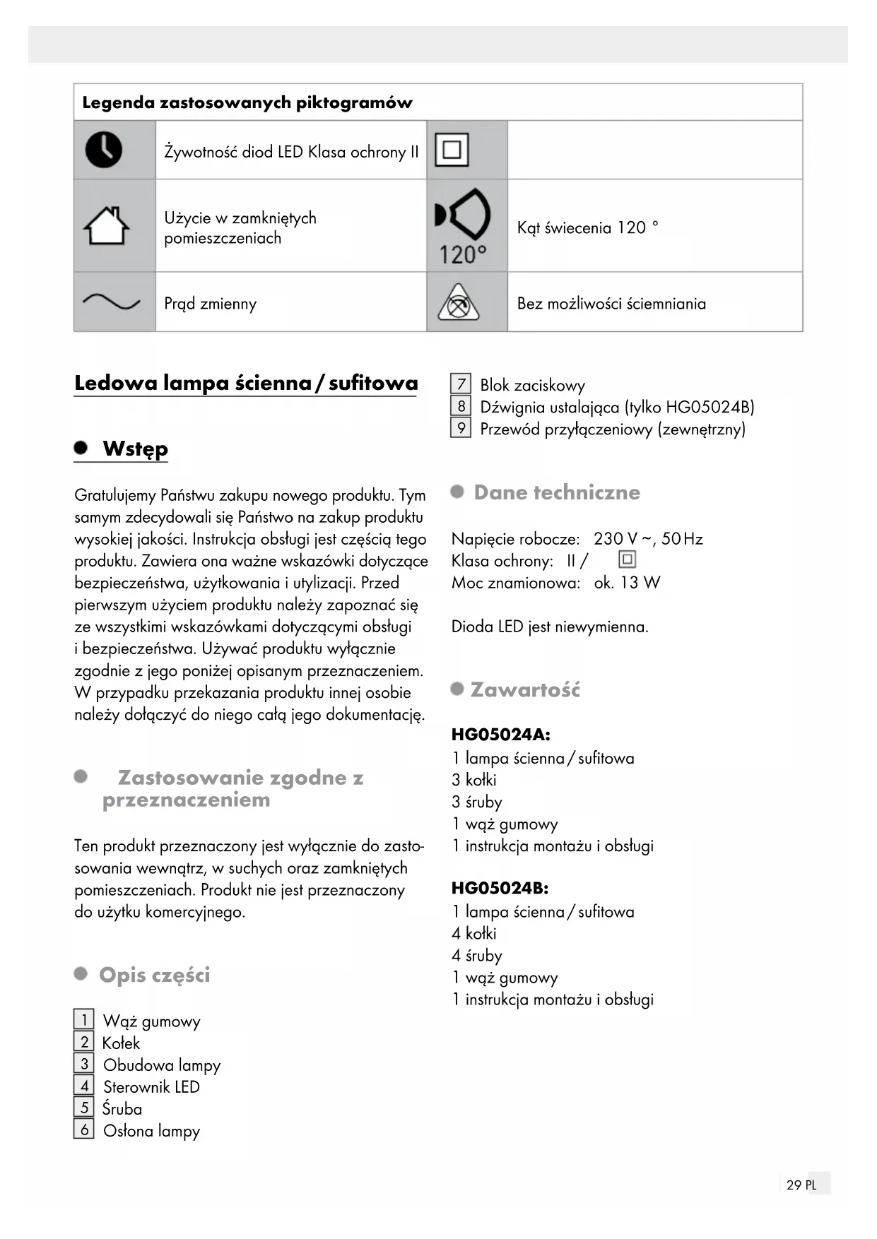 , 50 Hz Klasa ochrony: II / Moc znamionowa: ok. 13 W Dioda LED jest niewymienna. Zawartość HG05024A: 1 lampa ścienna / sufitowa 3 kołki 3 śruby 1 wąż gumowy 1 instrukcja montażu i obsługi HG05024B: 1 lampa ścienna / sufitowa 4 kołki 4 śruby 1 wąż gumowy 1 instrukcja montażu i obsługi30 PL Bezpieczeństwo Wskazówki bezpieczeństwa PRZED UŻYCIEM ARTYKUŁU NALEŻY PRZECZY- TAĆ INSTRUKCJĘ OBSŁUGI! PROSIMY O ZA-