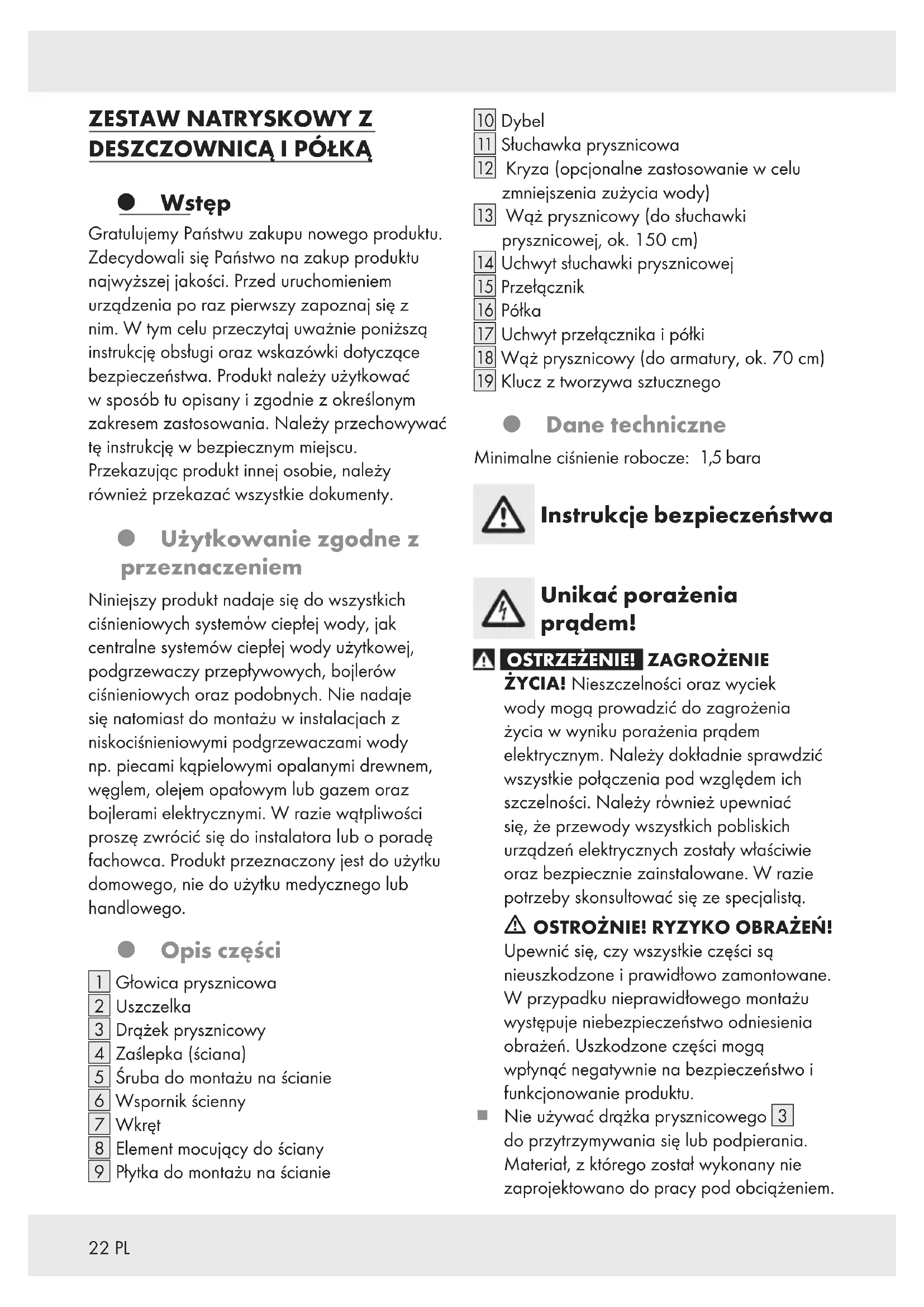 Wstęp Gratulujemy Państwu zakupu nowego produktu. Zdecydowali się Państwo na zakup produktu najwyższej jakości. Przed uruchomieniem urządzenia po raz pierwszy zapoznaj się z nim. W tym celu przeczytaj uważnie poniższą instrukcję obsługi oraz wskazówki dotyczące bezpieczeństwa. Produkt należy użytkować w sposób tu opisany i zgodnie z określonym zakresem zastosowania. Należy przechowywać tę instrukcję w bezpiecznym miejscu. Przekazując produkt innej osobie, należy również przekazać wszystkie dokumenty. Użytkowanie zgodne z przeznaczeniem Niniejszy produkt nadaje się do wszystkich ciśnieniowych systemόw ciepłej wody, jak centralne systemów ciepłej wody użytkowej, podgrzewaczy przepływowych, bojlerów ciśnieniowych oraz podobnych. Nie nadaje się natomiast do montażu w instalacjach z niskociśnieniowymi podgrzewaczami wody np. piecami kąpielowymi opalanymi drewnem, węglem, olejem opałowym lub gazem oraz bojlerami elektrycznymi. W razie wątpliwości proszę zwrócić się do instalatora lub o poradę fachowca. Produkt przeznaczony jest do użytku domowego, nie do użytku medycznego lub handlowego. Opis części [1] Głowica prysznicowa [2] Uszczelka [3] Drążek prysznicowy [4] Zaślepka (ściana) [5] Śruba do montażu na ścianie [6] Wspornik ścienny [7] Wkręt [8] Element mocujący do ściany [9] Płytka do montażu na ścianie [] Dybel [] Słuchawka prysznicowa [] Kryza (opcjonalne zastosowanie w celu zmniejszenia zużycia wody) [] Wąż prysznicowy (do słuchawki prysznicowej, ok. 150cm) [] Uchwyt słuchawki prysznicowej [] Przełącznik [] Półka [] Uchwyt przełącznika i półki [] Wąż prysznicowy (do armatury, ok. 70cm) [] Klucz z tworzywa sztucznego Dane techniczne Minimalne ciśnienie robocze: 1,5bara Instrukcje bezpieczeństwa Unikać porażenia prądem!