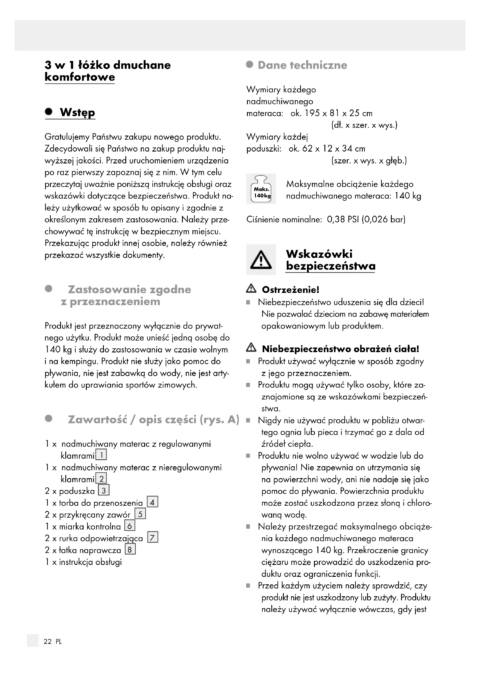 1 x instrukcja obsługi Dane techniczne Wymiary każdego nadmuchiwanego materaca: ok. 195 x 81 x 25 cm (dł. x szer. x wys.) Wymiary każdej poduszki: ok. 62 x 12 x 34 cm (szer. x wys. x głęb.) Maks. 140 kg Maksymalne obciążenie każdego nadmuchiwanego materaca: 140 kg Ciśnienie nominalne: 0,38 PSI (0,026 bar) Wskazówki bezpieczeństwa Ostrzeżenie! Niebezpieczeństwo uduszenia się dla dzieci! Nie pozwalać dzieciom na zabawę materiałem opakowaniowym lub produktem. Niebezpieczeństwo obrażeń ciała! Produkt używać wyłącznie w sposób zgodny z jego przeznaczeniem. Produktu mogą używać tylko osoby, które za- znajomione są ze wskazówkami bezpieczeń- stwa. Nigdy nie używać produktu w pobliżu otwar- tego ognia lub pieca i trzymać go z dala od źródeł ciepła. Produktu nie wolno używać w wodzie lub do pływania! Nie zapewnia on utrzymania się na powierzchni wody, ani nie nadaje się jako pomoc do pływania. Powierzchnia produktu może zostać uszkodzona przez słoną i chloro- waną wodę. Należy przestrzegać maksymalnego obciąże- nia każdego nadmuchiwanego materaca wynoszącego 140 kg. Przekroczenie granicy ciężaru może prowadzić do uszkodzenia pro- duktu oraz ograniczenia funkcji. Przed każdym użyciem należy sprawdzić, czy produkt nie jest uszkodzony lub zużyty. Produktu należy używać wyłącznie wówczas, gdy jest23 PL on w nienagannym stanie! Nie należy stosować produktu w przypadku stwierdzenia widocz- nych uszkodzeń lub jeśli się je przypuszcza. Nie używać produktu, jeżeli nie może on utrzymać powietrza. Należy przestrzegać maksymalnego napeł- nienia powietrzem. W innym razie produkt może pęknąć. Należy zwrócić uwagę na to, aby z produktu korzystały tylko osoby, które zapoznały się z jego działaniem i obsługą. Uwaga: istnieje ryzyko, jeśli produkt stosuje się na dworze i/lub jako pojazd wodny. Unikanie szkód rzeczowych Unikać kontaktu produktu z ostrymi, gorącymi, szpiczastymi lub niebezpiecznymi przedmiotami. Produktu nie stosować w wodzie i uważać na to, aby flokowana powierzchnia nie zrobiła się wilgotna. Zawory stosować wyłącznie z odpowiednimi adapterami. W przeciwnym razie może dojść do uszkodzeń zaworów. Produkt reaguje na mocne zimno i gorąco. Produktu nie należy używać, jeśli temperatura otoczenia jest niższa niż 15 °C lub wyższa niż 40 °C. W przeciwnym razie może dojść do uszkodzenia produktu. Po napompowaniu dobrze zamknąć zawory. Montowanie przykręcanych zaworów (rys. B) Każdy z nadmuchiwanych materacy