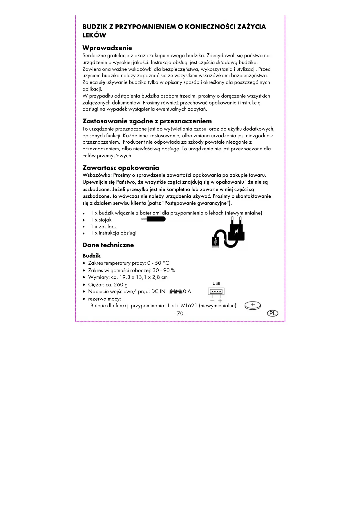 Leverancier NB: het onderstaande adres is géén serviceadres. Neem eerst contact op met de bovengenoemde klantenservice! digi-tech gmbh Valterweg 27A 65817 Eppstein DUITSLAND- 68 - Wskazówki obsługi i bezpieczęństwa Spis treści Spis treści ........................................................................................................................... - 68 - Wprowadzenie ................................................................................................................. - 70 - Zastosowanie zgodne z przeznaczeniem ...................................................................... - 70 - Zawartosc opakowania.................................................................................................... - 70 - Dane techniczne ................................................................................................................ - 70 - Budzik .......................................................................................................................... - 70 - Zasilacz ........................................................................................................................ - 71 - Objaśnienie symboli ......................................................................................................... - 71 - Symbole opakowania ....................................................................................................... - 72 - Ważne Wskazówki bezpieczęństwa Ważne Wskazówki bezpieczęństwaWażne Wskazówki bezpieczęństwa Ważne Wskazówki bezpieczęństwa .......................................................................... - 72 - Wskazówki bezpieczęństwa dla użytkownika ........................................................ - 72 - Wskazówki bezpieczeństwa dla baterii/akumulatory ........................................... - 72 - Zagrożenie elektryczne .............................................................................................. - 73 - Bezpieczne postawienie lub powieszenie budzika ....................................................... - 74 - Monitor i pola obsługi ...................................................................................................... - 74 - Uruchomienie ..................................................................................................................... - 75 - Ustawienie ......................................................................................................................... - 75 - Szybkie ustawienie...................................................................................................... - 76 - Ustawienia podstawowe ............................................................................................ - 76 - Ustawienie języka ....................................................................................................... - 76 - Ustawienie formatu monitora ..................................................................................... - 76 - Ustawienie daty ........................................................................................................... - 77 - Ustawienie trybu daty ................................................................................................. - 77 - Ustawienie formatu czasu .......................................................................................... - 77 - Ustawienie czasu ........................................................................................................ - 77 - Ustawienie kontrolki pory dnia .................................................................................. - 77 - Ustawienie alarmu 1 i 2 ............................................................................................. - 78 - Ustawienie przypominania o lekach rano-/w południe-/wieczorem................... - 78 - Ustawienie głośności alarmu...................................................................................... - 79 - Ustawienie jasności ..................................................................................................... - 79 - Funkcja drzemki (SNOOZE) ............................................................................................ - 79 - Resetowanie (RESET) ........................................................................................................ - 79 - Pielegnacja ........................................................................................................................ - 79 - Przechowywanie ............................................................................................................... - 80 - Uproszczona deklaracja zgodności UE ......................................................................... - 80 -- 69 - Usuwanie odpadów.......................................................................................................... - 80 - Utylizacja urządzenia elektrycznego ....................................................................... - 80 - Utylizacja baterii ......................................................................................................... - 81 - Recykling ...................................................................................................................... - 81 - Utylizacja odpadów ................................................................................................... - 81 - Gwarancja digi-tech gmbh .............................................................................................. - 81 - Warunki gwarancji ..................................................................................................... - 81 - Okres gwarancji i ustawowe roszczenia gwarancyjne ........................................... - 82 - Zakres gwarancji ........................................................................................................ - 82 - Przebieg zalatwiania reklamacji objętych gwarancją ............................................ - 82 - Servi