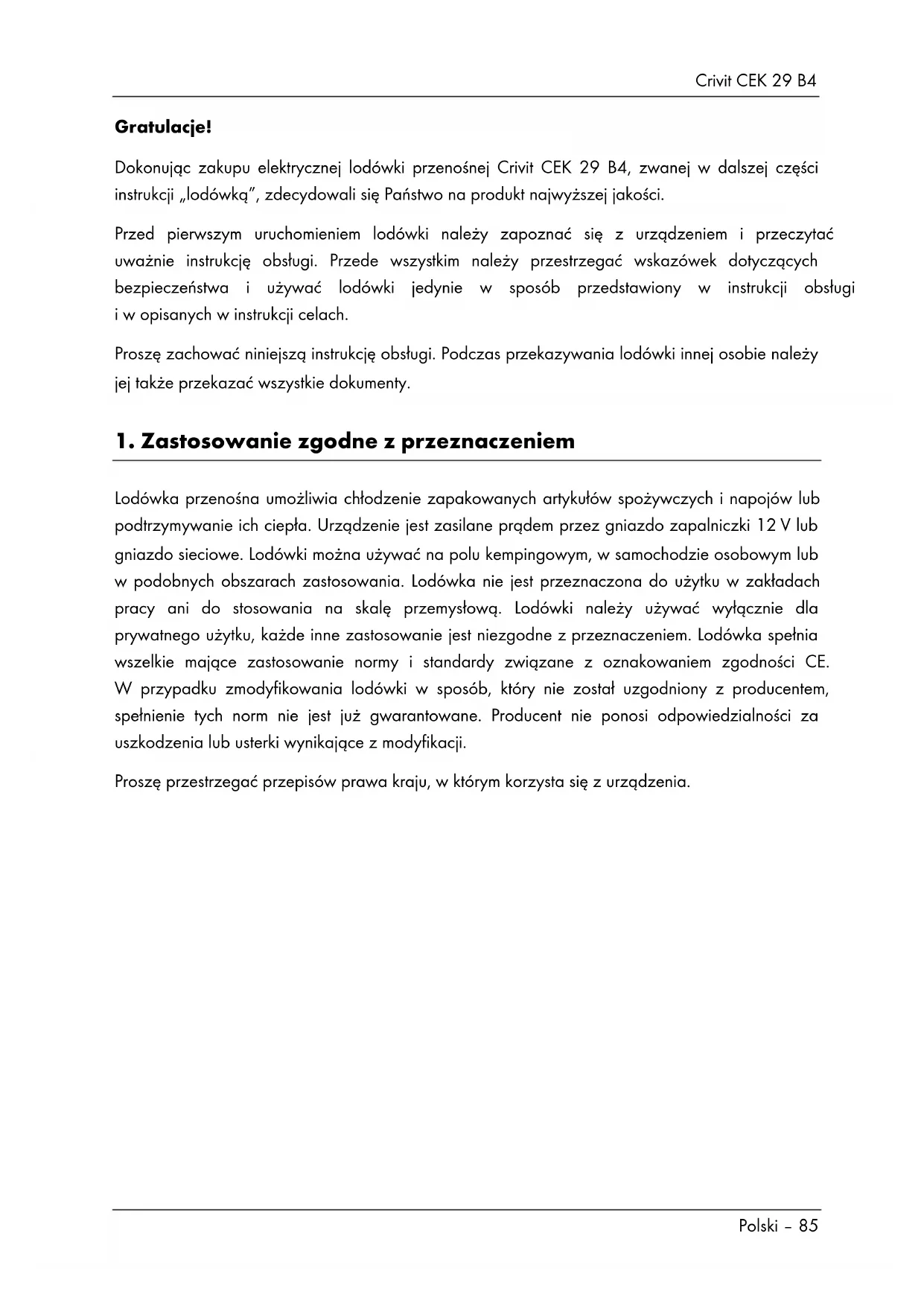 Lodówka przenośna umożliwia chłodzenie zapakowanych artykułów spożywczych i napojów lub podtrzymywanie ich ciepła. Urządzenie jest zasilane prądem przez gniazdo zapalniczki 12 V lub gniazdo sieciowe. Lodówki można używać na polu kempingowym, w samochodzie osobowym lub w podobnych obszarach zastosowania. Lodówka nie jest przeznaczona do użytku w zakładach pracy ani do stosowania na skalę przemysłową. Lodówki należy używać wyłącznie dla prywatnego użytku, każde inne zastosowanie jest niezgodne z przeznaczeniem. Lodówka spełnia wszelkie mające zastosowanie normy i standardy związane z oznakowaniem zgodności CE. W przypadku zmodyfikowania lodówki w sposób, który nie został uzgodniony z producentem, spełnienie tych norm nie jest już gwarantowane. Producent nie ponosi odpowiedzialności za uszkodzenia lub usterki wynikające z modyfikacji. Proszę przestrzegać przepisów prawa kraju, w którym korzysta się z urządzenia.Crivit CEK 29 B4 86 – Polski