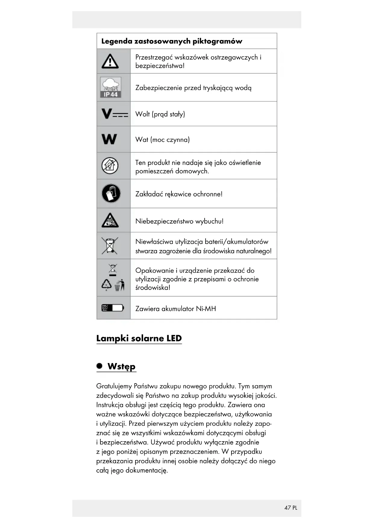 Opakowanie i urządzenie przekazać do utylizacji zgodnie z przepisami o ochronie środowiska! Zawiera akumulator Ni-MH Lampki solarne LED Wstęp Gratulujemy Państwu zakupu nowego produktu. Tym samym zdecydowali się Państwo na zakup produktu wysokiej jakości. Instrukcja obsługi jest częścią tego produktu. Zawiera ona ważne wskazówki dotyczące bezpieczeństwa, użytkowania iutylizacji. Przed pierwszym użyciem produktu należy zapo- znać się ze wszystkimi wskazówkami dotyczącymi obsługi ibezpieczeństwa. Używać produktu wyłącznie zgodnie zjego poniżej opisanym przeznaczeniem. Wprzypadku przekazania produktu innej osobie należy dołączyć do niego całą jego dokumentację.48 PL Zastosowanie zgodne z przeznaczeniem Produkt służy jako oświetlenie na zewnątrz. Produkt nie jest przeznaczony do użytku komercyjnego lub innych rodzajów zastosowań. Ten produkt nie nadaje się jako oświetlenie pomieszczeń domowych. Produkt ten nadaje się do ekstremalnych temperatur do -21°C. Opis części