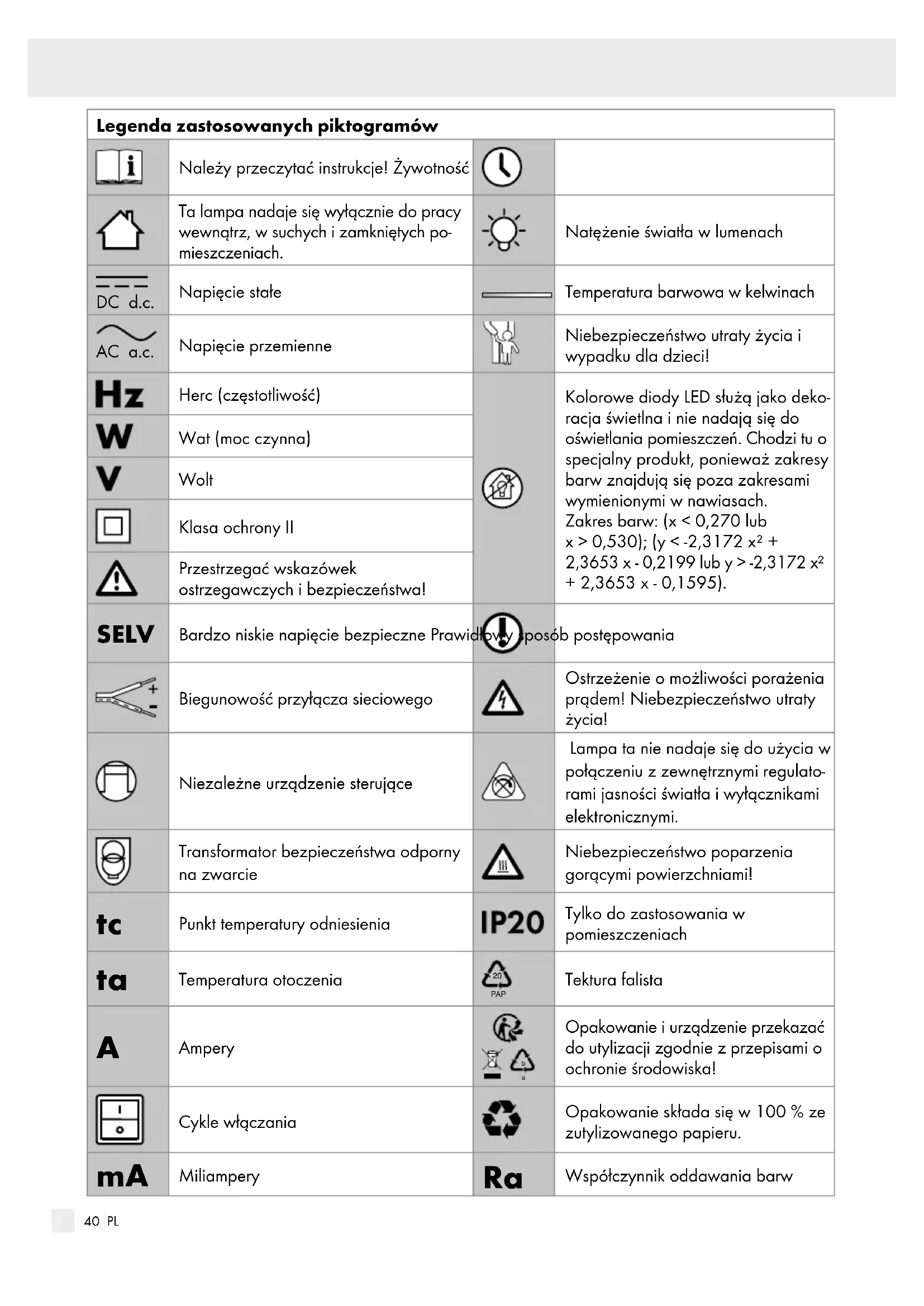 Współczynnik oddawania barw41 PL Legenda zastosowanych piktogramówLegenda zastosowanych piktogramów Listwa oświetleniowa LED Instrukcja Proszę dokładnie przeczytać całą niniej- szą instrukcję obsługi. Niniejsza instrukcja obsługi należy do produktu. Zawiera ona ważne wskazówki dotyczące uruchamiania i posługiwania się produktem. Zawsze należy prze- strzegać wszystkich wskazówek dotyczących bez- pieczeństwa. Przed uruchomieniem proszę sprawdzić, czy występuje prawidłowe napięcie, i czy wszystkie części są prawidłowo zamontowane. W przypadku zapytań lub niepewności odnośnie obchodzenia się z urządzeniem, prosimy o kontakt ze sprzedawcą lub punktem serwisowym. Proszę starannie przecho- wywać niniejszą instrukcję obsługi, a w razie oddania urządzenia osobom trzecim przekazać ją wraz z nim. Zastosowanie zgodne z przeznaczeniem Niniejsza lampa nadaje się wyłącznie do pracy wewnątrz, w suchych i zamknię- tych pomieszczeniach. Lampa przeznaczona jest do zastosowania jedynie w prywatnych gospodarstwach domowych, a nie w celach komercyjnych. Inne zastosowanie niż opisa