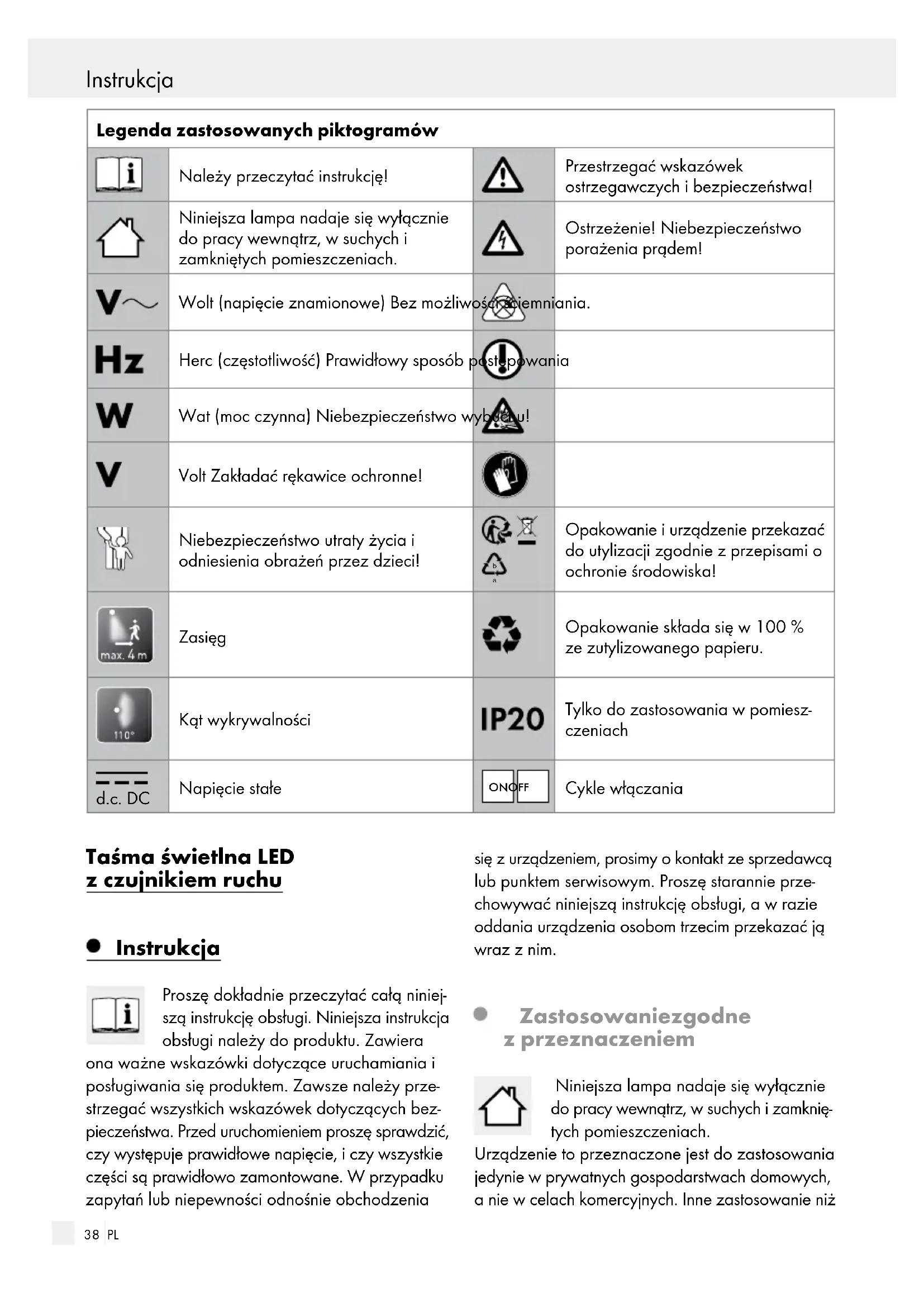 Opakowanie i urządzenie przekazać do utylizacji zgodnie z przepisami o ochronie środowiska! Zasięg Opakowanie składa się w 100 % ze zutylizowanego papieru. Kąt wykrywalności Tylko do zastosowania w pomiesz- czeniach d.c. DC Napięcie stałe ON OFF Cykle włączania Taśma świetlna LED z czujnikiem ruchu Instrukcja Proszę dokładnie przeczytać całą niniej- szą instrukcję obsługi. Niniejsza instrukcja obsługi należy do produktu. Zawiera ona ważne wskazówki dotyczące uruchamiania i posługiwania się produktem. Zawsze należy prze- strzegać wszystkich wskazówek dotyczących bez- pieczeństwa. Przed uruchomieniem proszę sprawdzić, czy występuje prawidłowe napięcie, i czy wszystkie części są prawidłowo zamontowane. W przypadku zapytań lub niepewności odnośnie obchodzenia się z urządzeniem, prosimy o kontakt ze sprzedawcą lub punktem serwisowym. Proszę starannie prze- chowywać niniejszą instrukcję obsługi, a w razie oddania urządzenia osobom trzecim przekazać ją wraz z nim. Zastosowanie zgodne z przeznaczeniem Niniejsza lampa nadaje się wyłącznie do pracy wewnątrz, w suchych i zamknię- tych pomieszczeniach. Urządzenie to przeznaczone jest do zastosowania jedynie w prywatnych gospodarstwach domowych, a nie w celach komercyjnych. Inne zastosowanie niż Instrukcja / Bezpieczeństwo39 PL Instrukcja Instrukcja / Bezpieczeństwo opisane powyżej jest niedozwolone i prowadzi do uszkodzenia produktu. Ponadto łączy się to z ryzy- kiem, takim jak np. spięcie, pożar, porażenie prądem itp. Nie należy stosować lampy jako lampki nocnej. Zawartość Bezpośrednio po wypakowaniu należy sprawdzić, czy zestaw jest kompletny oraz czy urządzenie znajduje się w nienagannym stanie. 1 taśma świetlna LED 1 pasek taśmy klejącej 4 baterie 1,5 V AAA 1 instrukcja obsługi Opis części