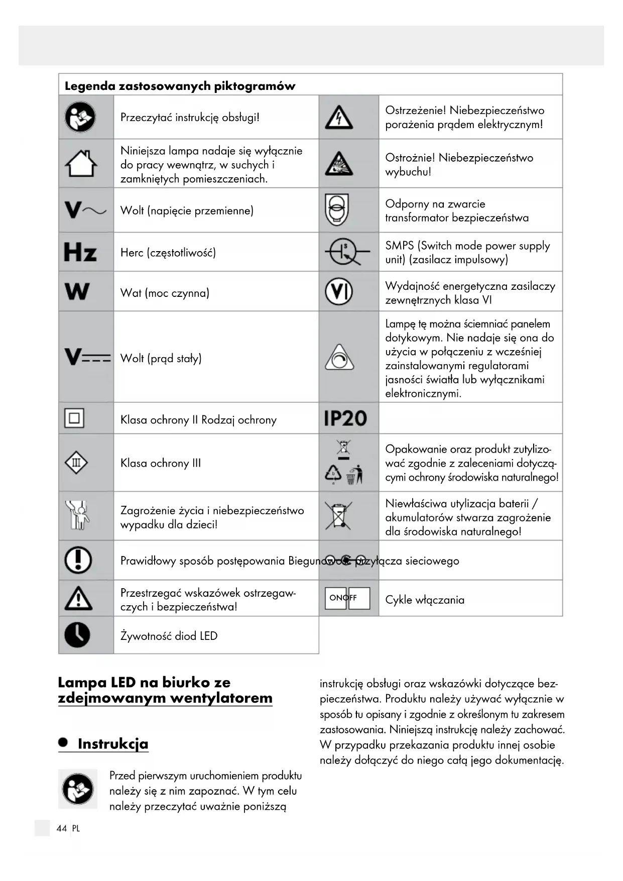 Opakowanie oraz produkt zutylizo- wać zgodnie z zaleceniami dotyczą- cymi ochrony środowiska naturalnego! Zagrożenie życia i niebezpieczeństwo wypadku dla dzieci! Niewłaściwa utylizacja baterii / akumulatorów stwarza zagrożenie dla środowiska naturalnego! Prawidłowy sposób postępowania Biegunowość przyłącza sieciowego Przestrzegać wskazówek ostrzegaw- czych i bezpieczeństwa! ON OFF Cykle włączania Żywotność diod LED Lampa LED na biurko ze zdejmowanym wentylatorem Instrukcja Przed pierwszym uruchomieniem produktu należy się z nim zapoznać. W tym celu należy przeczytać uważnie poniższą instrukcję obsługi oraz wskazówki dotyczące bez- pieczeństwa. Produktu należy używać wyłącznie w sposób tu opisany i zgodnie z określonym tu zakresem zastosowania. Niniejszą instrukcję należy zachować. W przypadku przekazania produktu innej osobie należy dołączyć do niego całą jego dokumentację.45 PL Zastosowanie zgodne z przeznaczeniem Niniejsza lampa nadaje się wyłącznie do pracy wewnątrz, w suchych i zamkniętych pomieszczeniach. Lampy należy używać wyłącznie w sposób opisany w niniejszej instrukcji obsługi. Każde inne zastoso- wanie uznawane jest za niezgodne z przeznacze- niem i może prowadzić do szkód rzeczowych, a nawet szkód osobowych. Lampa nie jest zabawką dla dzieci. Producent lub sprzedawca nie bierze żadnej odpowiedzialności za szkody spowodowane niezgodnym z przeznaczeniem lub niewłaściwym użyciem. Zawartość 1 lampa biurkowa LED z odczepianym wentylatorem, model 55399 1 zasilacz 1 kabel mikro-USB 1 instrukcja obsługi Opis części