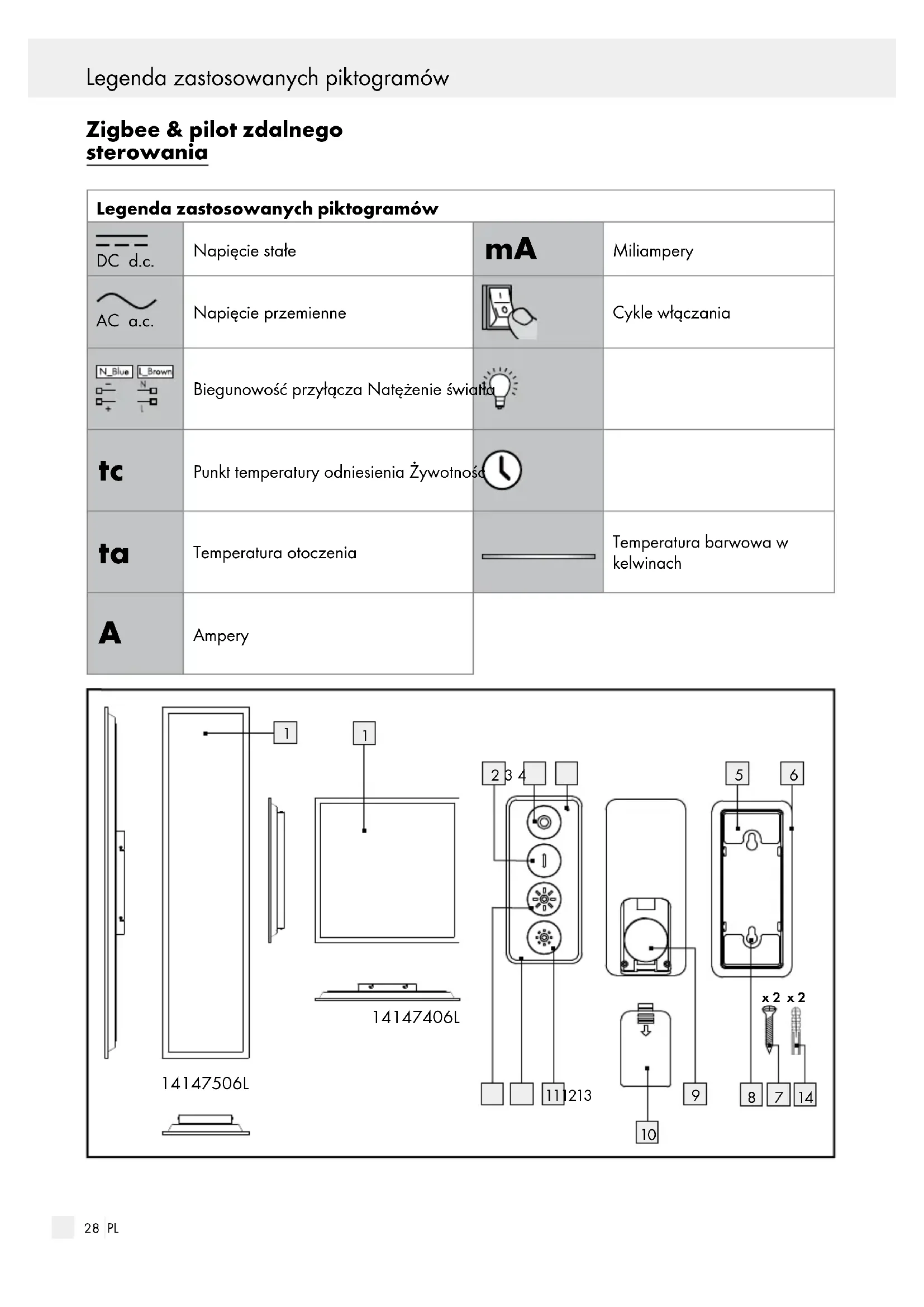 14147406L 14147506L 1429 PL Legenda zastosowanych piktogramów Opis części / Dane techniczne / Resetowanie lampy / Połączenie pilota ... Opis części