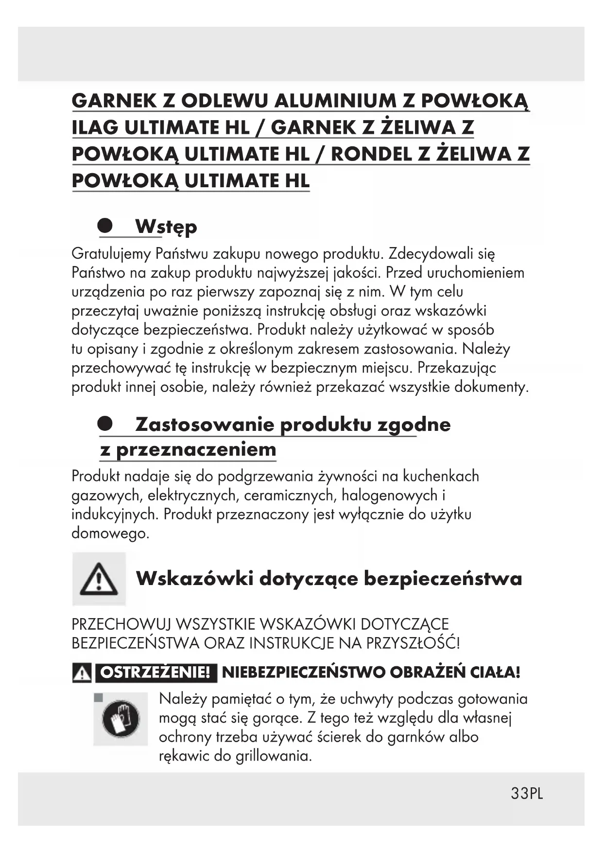 Należy pamiętać o tym, że uchwyty podczas gotowania mogą stać się gorące. Z tego też względu dla własnej ochrony trzeba używać ścierek do garnków albo rękawic do grillowania.34 PL Nie używać pokrywki, jeżeli uchwyt jest luźny. Nigdy nie używać produktu, jeśli uchwyty są luźne. Ponownie dokręcić złącze śrubowe uchwytów, jeśli jest to konieczne.