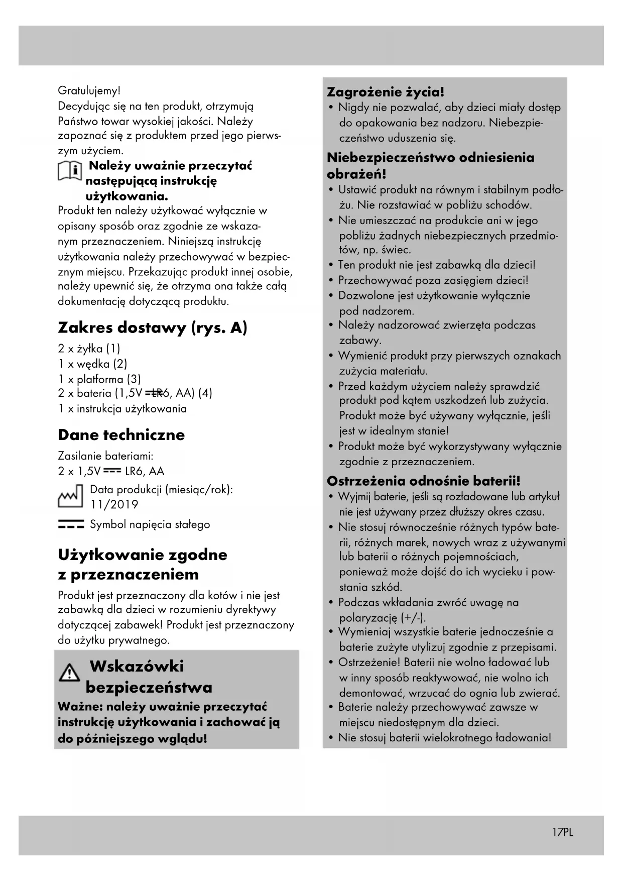ton/80 - 98: composietmaterialen. Het artikel en de verpakkingsmaterialen zijn recyclebaar; voer ze gescheiden af voor een be- tere afvalbehandeling. Het Triman-logo is alleen van toepassing voor Frankrijk. Informatie over de mogelijkheden om het afgedankte artikel af te voeren, wordt verstrekt door de gemeentelijke overheid. Opmerkingen over garantie en serviceafhandeling Het product is geproduceerd met grote zorg en onder voortdurende controle. U ontvangt een garantie van drie jaar op dit product, vanaf de datum van aankoop. Bewaar alstublieft uw aankoopbewijs. De garantie geldt alleen voor materiaal- en fa- bricagefouten en vervalt bij foutief of oneigenlijk gebruik. Uw wettelijke rechten, met name het garantierecht, worden niet beïnvloed door deze garantie. In geval van reclamaties dient u zich aan de beneden genoemde service-hotline te wenden of zich per e-mail met ons in verbinding te zetten. Onze servicemedewerkers zullen de verdere han- delswijze zo snel mogelijk met u afspreken. Wij zullen u in ieder geval persoonlijk te woord staan. De garantieperiode wordt na eventuele repa- raties en op basis van de garantie, wettelijke garantie of coulance niet verlengd. Dit geldt ook voor vervangen en gerepareerde delen. Na afloop van de garantieperiode dienen eventuele reparaties te worden betaald. IAN: 307316_1904 Service België Tel.: 070 270 171 (0,15 EUR/Min.) E-Mail: deltasport@lidl.be Service Nederland Tel.: 0900 0400223 (0,10 EUR/Min.) E-Mail: deltasport@lidl.nl17PL Gratulujemy! Decydując się na ten produkt, otrzymują Państwo towar wysokiej jakości. Należy zapoznać się z produktem przed jego pierws- zym użyciem. Należy uważnie przeczytać następującą instrukcję użytkowania. Produkt ten należy użytkować wyłącznie w opisany sposób oraz zgodnie ze wskaza- nym przeznaczeniem. Niniejszą instrukcję użytkowania należy przechowywać w bezpiec- znym miejscu. Przekazując produkt innej osobie, należy upewnić się, że otrzyma ona także całą dokumentację dotyczącą produktu. Zakres dostawy (rys. A) 2 x żyłka (1) 1 x wędka (2) 1 x platforma (3) 2 x bateria (1,5V LR6, AA) (4) 1 x instrukcja użytkowania Dane techniczne Zasilanie bateriami: 2 x 1,5V LR6, AA Data produkcji (miesiąc/rok): 11/2019 Symbol napięcia stałego Użytkowanie zgodne z przeznaczeniem Produkt jest przeznaczony dla kotów i nie jest zabawką dla dzieci w rozumieniu dyrektywy dotyczącej zabawek! Produkt jest przeznaczony do użytku prywatnego. Wskazówki bezpieczeństwa Ważne: należy uważnie przeczytać instrukcję użytkowania i zachować ją do późniejszego wglądu! Zagrożenie życia!