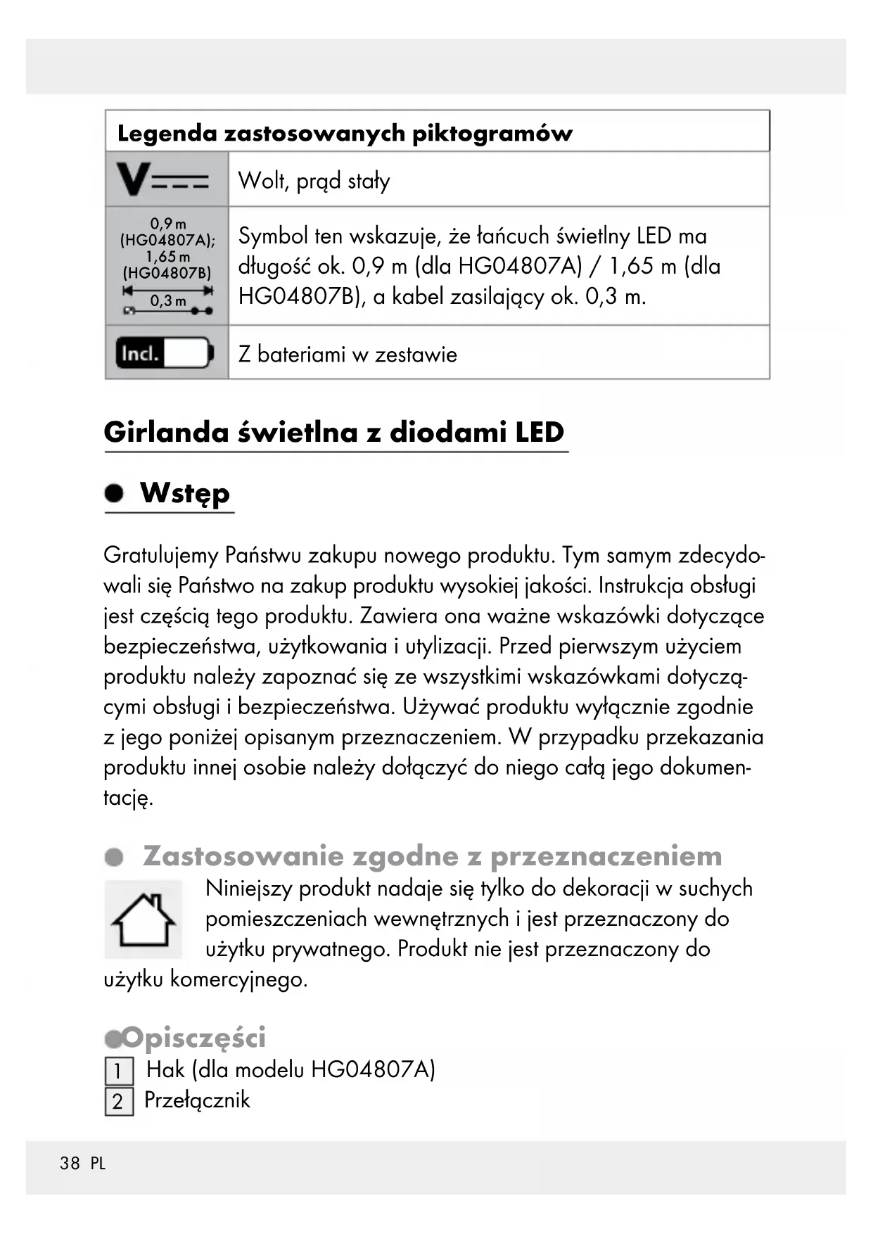 Łańcuch świetlny Dane techniczne LED: 8 x 0,06 W dla HG04807A 10 x 0,06 W dla HG04807B Typ baterii: 3 x 1,5 V bateria AA Zawartość 1 Łańcuch świetlny LED 3 baterie 1 instrukcja obsługi Wskazówki bezpieczeństwa PROSIMY O ZACHOWANIE WSZYSTKICH WSKAZÓWEK BEZ- PIECZEŃŚTWA I INSTRUKCJI OBSŁUGI!