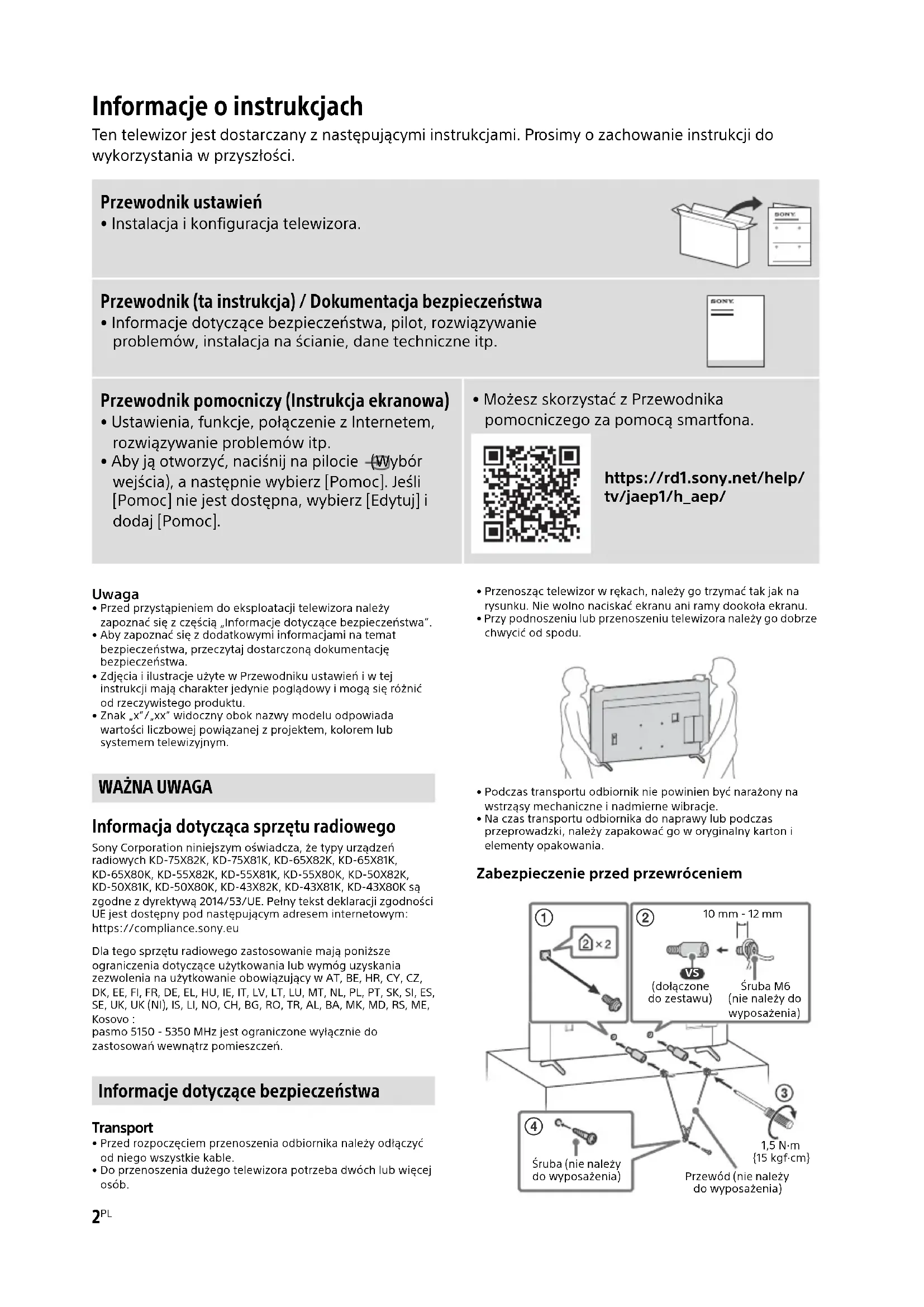 - Przed przystąpieniem do eksploatacji telewizora należy zapoznać się z częścią „Informacje dotyczące bezpieczeństwa”.• Aby zapoznać się z dodatkowymi informacjami na temat bezpieczeństwa, przeczytaj dostarczoną dokumentację bezpieczeństwa. • Zdjęcia i ilustracje użyte w Przewodniku ustawień i w tej instrukcji mają charakter jedynie poglądowy i mogą się różnić od rzeczywistego produktu.• Znak „x”/„xx” widoczny obok nazwy modelu odpowiada wartości liczbowej powiązanej z projektem, kolorem lub systemem telewizyjnym. Informacja dotycząca sprzętu radiowego Sony Corporation niniejszym oświadcza, że typy urządzeń radiowych KD-75X82K, KD-75X81K, KD-65X82K, KD-65X81K, KD-65X80K, KD-55X82K, KD-55X81K, KD-55X80K, KD-50X82K, KD-50X81K, KD-50X80K, KD-43X82K, KD-43X81K, KD-43X80K są zgodne z dyrektywą 2014/53/UE. Pełny tekst deklaracji zgodności UE jest dostępny pod następującym adresem internetowym: https://compliance.sony.euDla tego sprzętu radiowego zastosowanie mają poniższe ograniczenia dotyczące użytkowania lub wymóg uzyskania zezwolenia na użytkowanie obowiązujący w AT, BE, HR, CY, CZ, DK, EE, FI, FR, DE, EL, HU, IE, IT, LV, LT, LU, MT, NL, PL, PT, SK, SI, ES, SE, UK, UK (NI), IS, LI, NO, CH, BG, RO, TR, AL, BA, MK, MD, RS, ME, Kosovo :pasmo 5150 - 5350 MHz jest ograniczone wyłącznie do zastosowań wewnątrz pomieszczeń. Transport