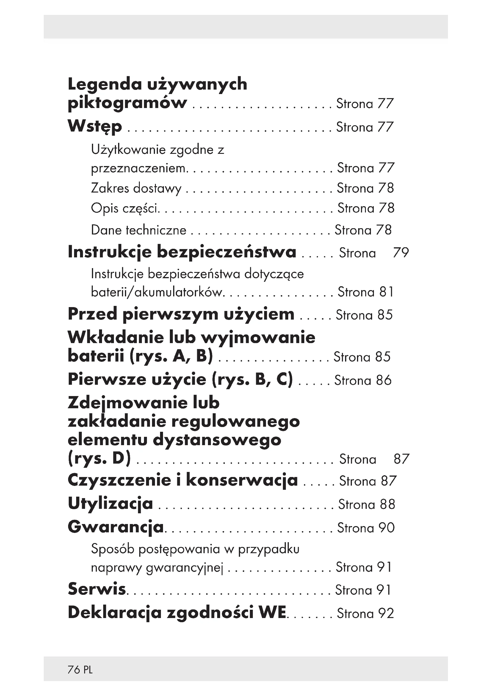 ŚMIERTELNE NIEBEZPIECZEŃSTWO! Baterie/ akumulatorki należy trzymać poza zasięgiem dzieci. W razie połknięcia należy niezwłocznie poszukać pomocy lekarza! Połknięcie może spowodować oparzenia, perforację tkanek miękkich i śmierć. W ciągu 2godzin od spożycia mogą wystąpić poważne oparzenia. ZAGROŻENIE WYBUCHEM! Nigdy nie ładować zwykłych baterii nieprzeznaczonych do ładowania. Baterii/ akumulatorków nie zwierać ani ich nie otwierać. Może to spowodować przegrzanie, pożar lub pęknięcie.82 PL Baterii/akumulatorków nie wolno wrzucać do ognia lub wody. Nie wywierać obciążeń mechanicznych na baterie/ akumulatorki. Nie wolno zwierać zacisków przyłączeniowych. Ryzyko wycieku z baterii/ akumulatorków Unikać ekstremalnych warunków otoczenia oraz temperatur, które mogłyby mieć wpływ na baterie lub akumulatorki, np. grzejników lub bezpośredniego światła słonecznego. Jeśli baterie/akumulatorki wylały się, unikać kontaktu chemikaliów ze skórą, oczami i błonami śluzowymi! Miejsca kontaktu natychmiast przepłukać czystą wodą i skonsultować się z lekarzem!83PL