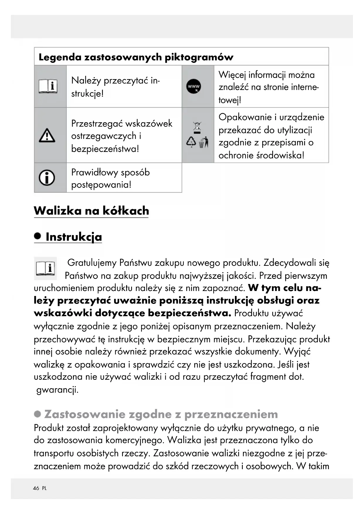 Opakowanie i urządzenie przekazać do utylizacji zgodnie z przepisami o ochronie środowiska! Prawidłowy sposób postępowania! Walizka na kółkach Instrukcja Gratulujemy Państwu zakupu nowego produktu. Zdecydowali się Państwo na zakup produktu najwyższej jakości. Przed pierwszym uruchomieniem produktu należy się z nim zapoznać. W tym celu na- leży przeczytać uważnie poniższą instrukcję obsługi oraz wskazówki dotyczące bezpieczeństwa. Produktu używać wyłącznie zgodnie z jego poniżej opisanym przeznaczeniem. Należy przechowywać tę instrukcję w bezpiecznym miejscu. Przekazując produkt innej osobie należy również przekazać wszystkie dokumenty. Wyjąć walizkę z opakowania i sprawdzić czy nie jest uszkodzona. Jeśli jest uszkodzona nie używać walizki i od razu przeczytać fragment dot. gwarancji. Zastosowanie zgodne z przeznaczeniem Produkt został zaprojektowany wyłącznie do użytku prywatnego, a nie do zastosowania komercyjnego. Walizka jest przeznaczona tylko do transportu osobistych rzeczy. Zastosowanie walizki niezgodne z jej prze- znaczeniem może prowadzić do szkód rzeczowych i osobowych. W takim47 PL przypadku producent lub dystrybutor nie ponosi odpowiedzialności za powstałe szkody. Walizka nie jest zabawką. Opis części