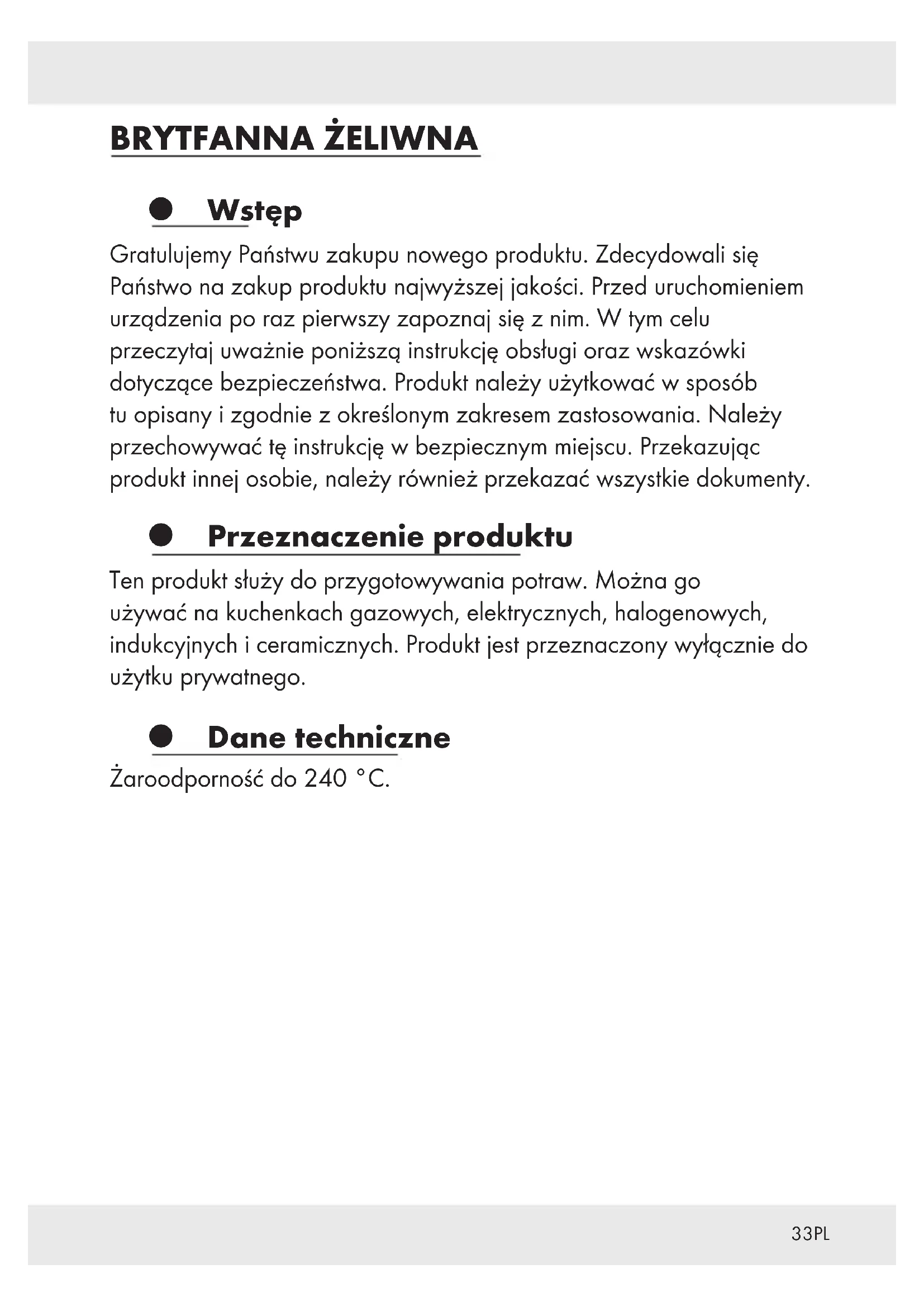 PRZESTROGA! Należy pamiętać, że emalia może zostać uszkodzona, jeśli produkt upadnie lub zostanie uderzony. Utylizacja Opakowanie wykonane jest z materiałów przyjaznych dla środowiska, które można przekazać do utylizacji w lokalnym punkcie przetwarzania surowców wtórnych. Informacji na temat możliwości utylizacji wyeksploatowanego produktu udziela urząd gminy lub miasta.38 PL Gwarancja Produkt wyprodukowano według wysokich standardów jakości i poddano skrupulatnej kontroli przed wysyłką. W przypadku wad produktu nabywcy przysługują ustawowe prawa. Gwarancja nie ogranicza ustawowych praw nabywcy produktu. Produkt objęte jest 3 gwarancją, licząc od daty zakupu. Gwarancja wygasa w razie zawinionego przez użytkownika uszkodzenia produktu, niewłaściwego użycia lub konserwacji. W przypadku wystąpienia w ciągu 3 lat od daty zakupu wad materiałowych lub fabrycznych, dokonujemy – według własnej oceny – bezpłatnej naprawy lub wymiany produktu. Świadczenie gwarancyjne obejmuje wady materiałowe i fabryczne. Gwarancja nie obejmuje części produktu ulegających normalnemu zużyciu, uznawanych za części zużywalne (np. baterie) oraz uszkodzeń części łamliwych, np. przełączników, akumulatorów lub wykonanych ze szkła. Zgodnie z Kodeksem Cywilnym art. 581 §1 wraz z wymianą urządzenia lub ważnej części czas gwarancji rozpoczyna się na nowo.39PL Sposób postępowania w przypadku naprawy gwarancyjnej Aby zapewnić szybkie rozpatrzenie Państwa wniosku, prosimy stosować się do następujących wskazówek: Przed skontaktowaniem się z działem serwisowym należy przygotować paragon i numer artykułu (np. IAN 123456_7890) jako dowód zakupu. Numery artykułów można znaleźć na tabliczce znamionowe, na grawerunku, na stronie tytułowej jego instrukcji (na dole po lewej stronie) lub jako naklejkę na stronie odwrotnej lub spodniej. W razie wystąpienia błędów w działaniu lub innych wad, należy skontaktować się najpierw z wymienionym poniżej działem serwisowym telefonicznie lub pocztą elektroniczną. Produkt uznany za uszkodzony można następnie z dołączeniem dowodu zakupu (paragonu) i podaniem, na czym polega wada i kiedy wystąpiła, przesłać bezpłatnie na podany Państwu adres serwisu. Serwis Serwis Polska Tel.: 22 397 4996 E-Mail: owim@lidl.pl40 CZ LITINOVÝ HRNEC Úvod Blahopřejeme Vám ke koupi nového výrobku. Rozhodli jste se pro kvalitní výrobek. Před prvním uvedením do provozu se seznamte s výrobkem. K tomu si pozorně přečtěte následující návod k obsluze a bezpečnostní pokyny. Používejte výrobek jen popsaným způsobem a pouze pro uvedené oblasti použití. Uschovejte si tento návod na bezpečném místě. Všechny podklady vydejte při předání výrobku i třetí osobě. Určené použití Tento výrobek je navržen pouze pro přípravu jídla. Je vhodný pro použití se sporáky na zemní plyn, elektrickými, halogenovými, indukčními a sklokeramickými plotýnkami Výrobek je určen výhradně pro soukromé používání. Specifikace Žáruvzdorný do 240 °C.41CZ Bezpečnostní pokyny ULOŽTE VŠECHNY BEZPEČNOSTNÍ POKYNY A POKYNY PRO POUŽITÍ PRO BUDOUCÍ NAHLÉDNUTÍ!