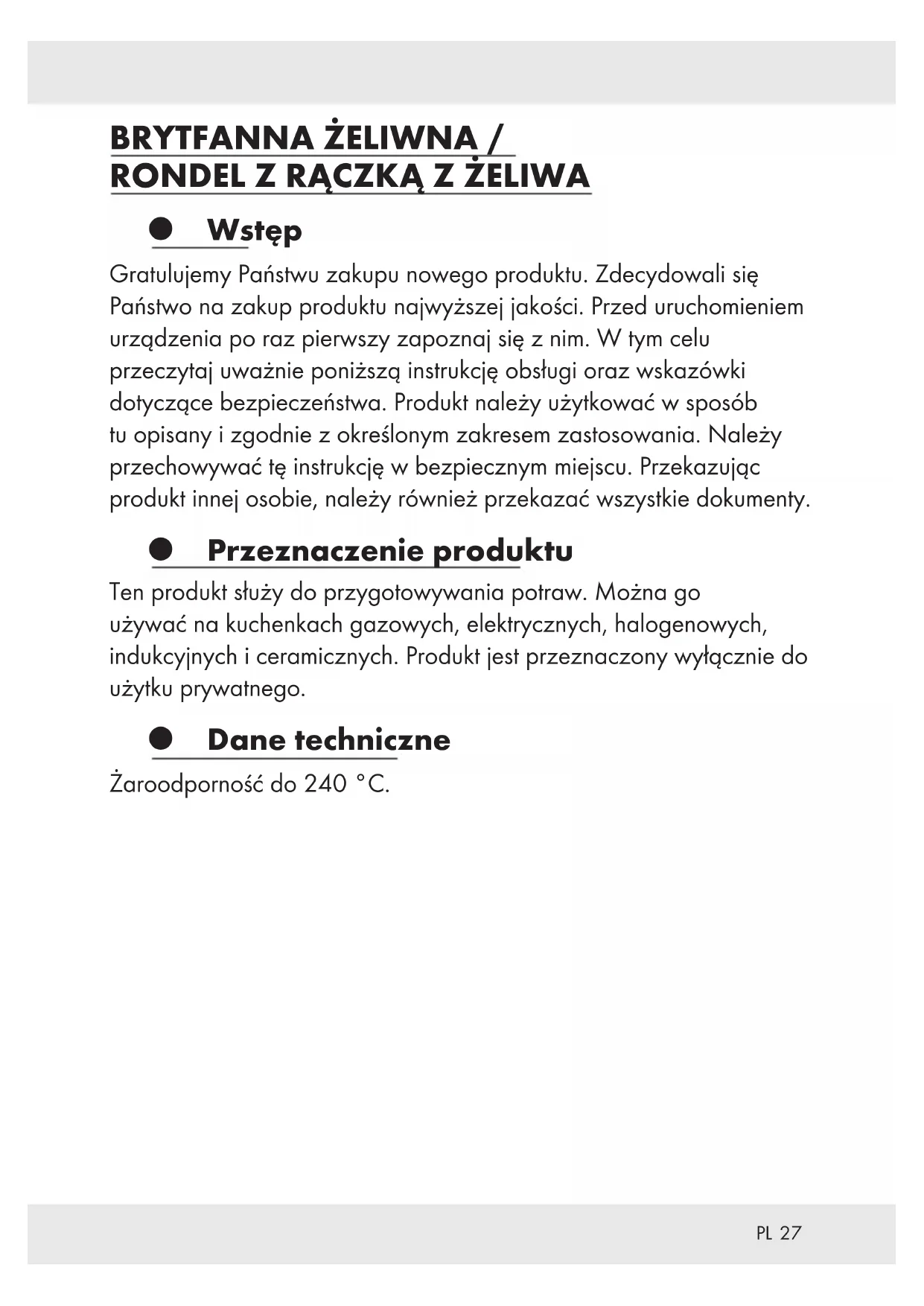 Wstęp Gratulujemy Państwu zakupu nowego produktu. Zdecydowali się Państwo na zakup produktu najwyższej jakości. Przed uruchomieniem urządzenia po raz pierwszy zapoznaj się z nim. W tym celu przeczytaj uważnie poniższą instrukcję obsługi oraz wskazówki dotyczące bezpieczeństwa. Produkt należy użytkować w sposób tu opisany i zgodnie z określonym zakresem zastosowania. Należy przechowywać tę instrukcję w bezpiecznym miejscu. Przekazując produkt innej osobie, należy również przekazać wszystkie dokumenty. Przeznaczenie produktu Ten produkt służy do przygotowywania potraw. Można go używać na kuchenkach gazowych, elektrycznych, halogenowych, indukcyjnych i ceramicznych. Produkt jest przeznaczony wyłącznie do użytku prywatnego. Dane techniczne Żaroodporność do 240 °C.28