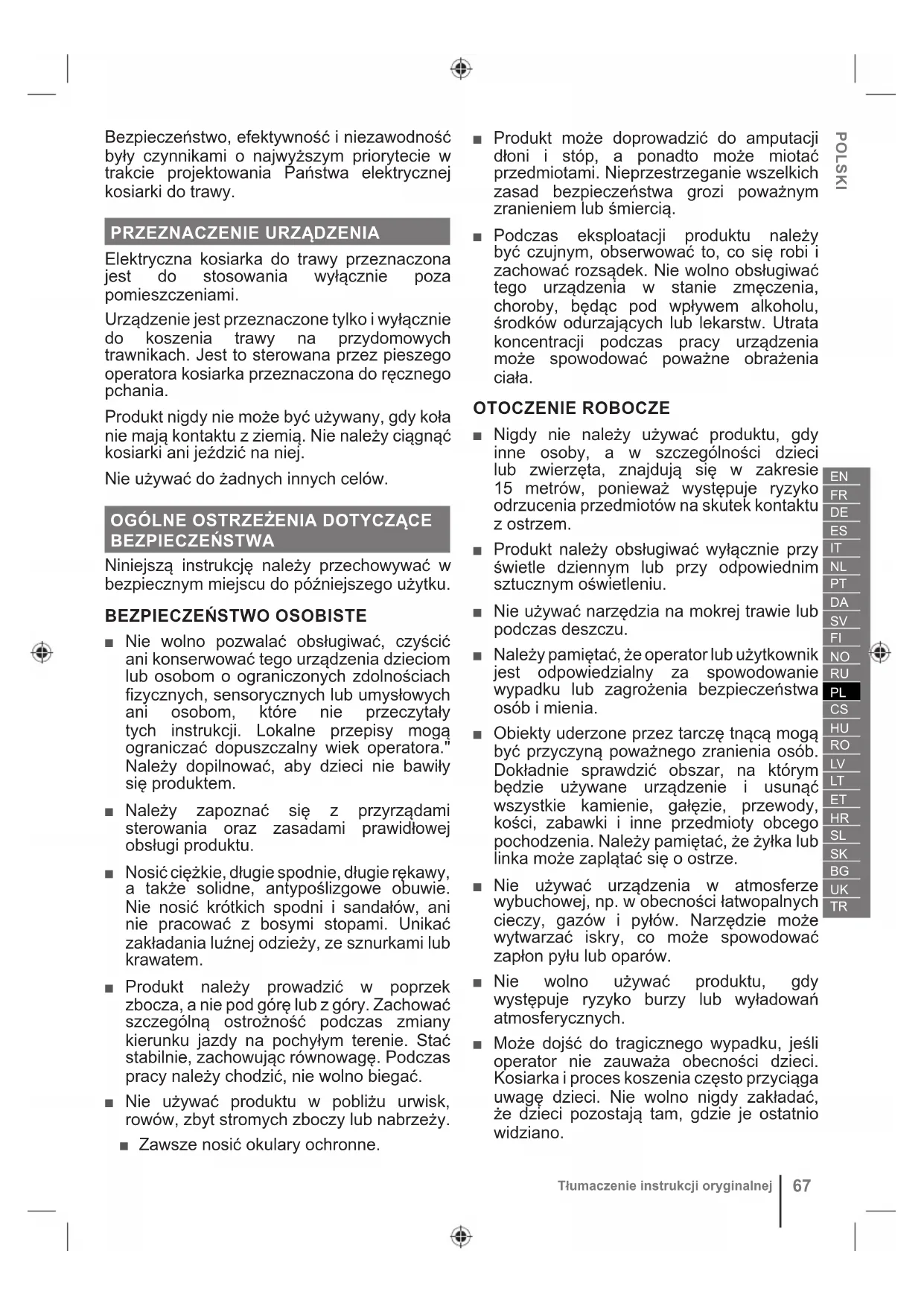 ■ Ostrze tnące powinno obracać się mniej więcej równolegle do podłoża, nad którym przejeżdża. ■ Ostrze produktu jest ostre. Przy montażu, wymianie, czyszczeniu lub kontroli dokręcenia śrub należy zachować szczególną ostrożność i nosić grube rękawice ochronne. ■ Nigdy nie wolno obsługiwać produktu, jeśli włącznik/wyłącznik na uchwycie nie działa prawidłowo i nie zapewnia prawidłowego uruchamiania i zatrzymywania produktu. ■ Nigdy nie wolno blokować włączników/ wyłączników w położeniu włączenia (ON). Jest to bardzo niebezpieczne. ■ Nie przeciążać urządzenia. Urządzenie będzie najwydajniejsze i najbezpieczniejsze w obsłudze, jeśli będzie używane zgodnie z zamierzonymi parametrami pracy. ■ Przed przejechaniem przez podłoże żwirowe zatrzymać ostrze. ■ Unikać dziur, korzeni, skał, wybrzuszeń terenu i innych ukrytych w trawie obiektów. Nierówny teren grozi poślizgiem i upadkiem. ■ Podczas montażu lub składania uchwytu zawsze należy upewnić się, że kabel sterowania silnika nie jest przytrzaśnięty, zakleszczony lub uszkodzony w inny sposób. Nigdy nie należy podłączać produktu do zasilania, jeśli przewód jest uszkodzony. Serwisowanie należy powierzać wyłącznie autoryzowanemu serwisowi. ■ Długotrwałe użytkowanie narzędzia może spowodować obrażenia ciała lub nasilić dolegliwości zdrowotne. W przypadku długotrwałego użytkowania jakiegokolwiek produktu należy robić regularne przerwy.70 Tłumaczenie instrukcji oryginalnej ZABEZPIECZENIE PRZED PRZECIĄŻENIEM Produkt posiada urządzenie zabezpieczające przed przeciążeniem. W przypadku wykrycia przeciążenia produkt automatycznie się wyłączy. W przypadku wyzwolenia zabezpieczenia przed przeciążeniem należy poczekać od 5 do 10 minut, aż silnik ostygnie. Wyłączyć produkt i odłączyć go od źródła zasilania. Ostrza są ostre — przed dotknięciem założyć wytrzymałe rękawice. Upewnić się, że nóż może się swobodnie obracać i nie jest zakleszczony lub zbyt mocno dokręcony. Gdy silnik ostygnie, podłączyć wtyczkę do źródła zasilania i włączyć produkt. Nacisnąć przycisk uruchamiania i ścisnąć dźwignię włą cznika/wyłącznika, aby uruchomić produkt. Jeśli produkt nie uruchamia się, serwisowanie należy powierzać wyłącznie autoryzowanemu serwisowi.