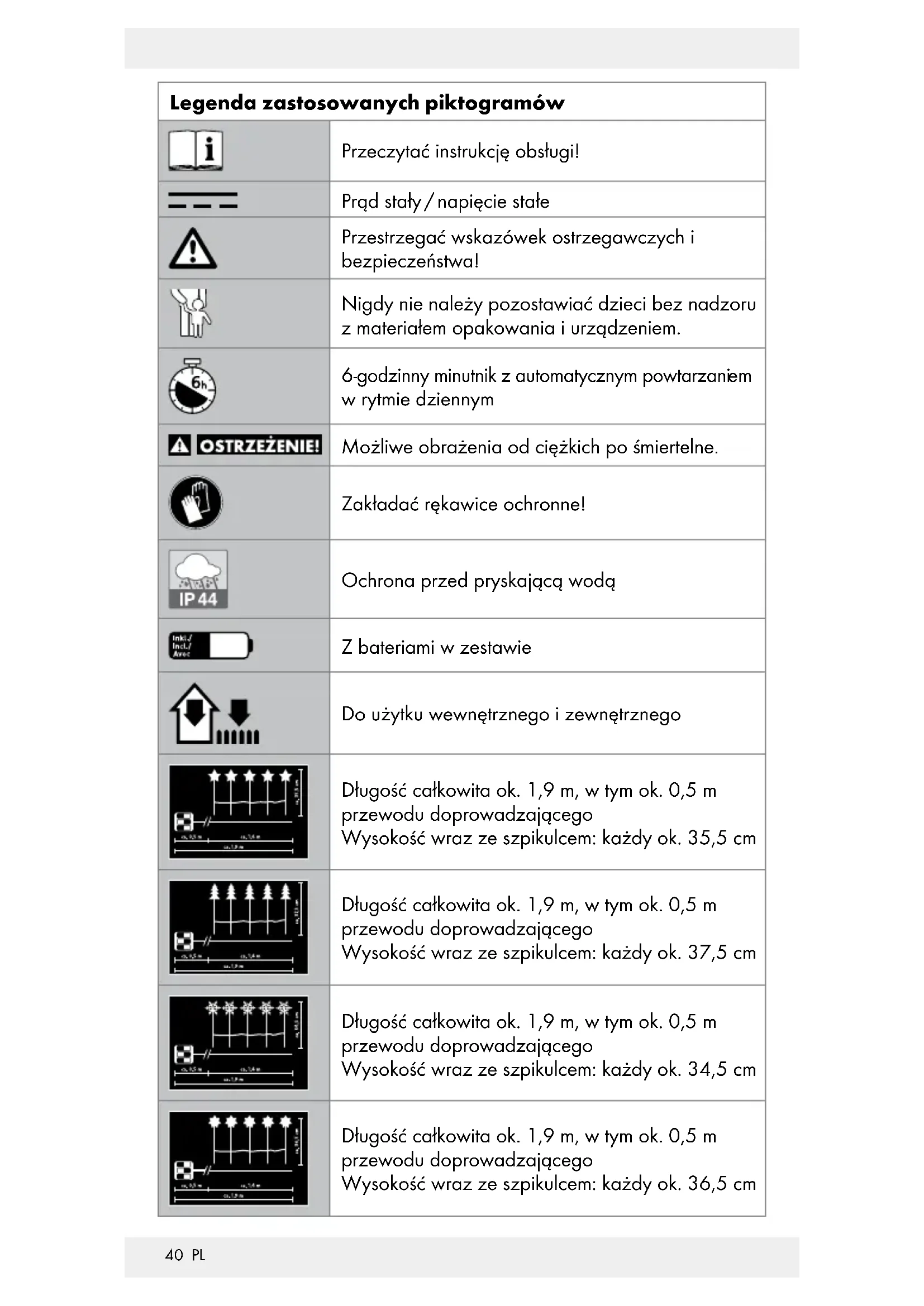 w rytmie dziennym Możliwe obrażenia od ciężkich po śmiertelne. Zakładać rękawice ochronne! Ochrona przed pryskającą wodą Z bateriami w zestawie Do użytku wewnętrznego i zewnętrznego Długość całkowita ok. 1,9 m, w tym ok. 0,5 m przewodu doprowadzającego Wysokość wraz ze szpikulcem: każdy ok. 35,5 cm Długość całkowita ok. 1,9 m, w tym ok. 0,5 m przewodu doprowadzającego Wysokość wraz ze szpikulcem: każdy ok. 37,5 cm Długość całkowita ok. 1,9 m, w tym ok. 0,5 m przewodu doprowadzającego Wysokość wraz ze szpikulcem: każdy ok. 34,5 cm Długość całkowita ok. 1,9 m, w tym ok. 0,5 m przewodu doprowadzającego Wysokość wraz ze szpikulcem: każdy ok. 36,5 cm41 PL Niewłaściwa utylizacja baterii / akumulatorów stwarza zagrożenie dla środowiska naturalnego!