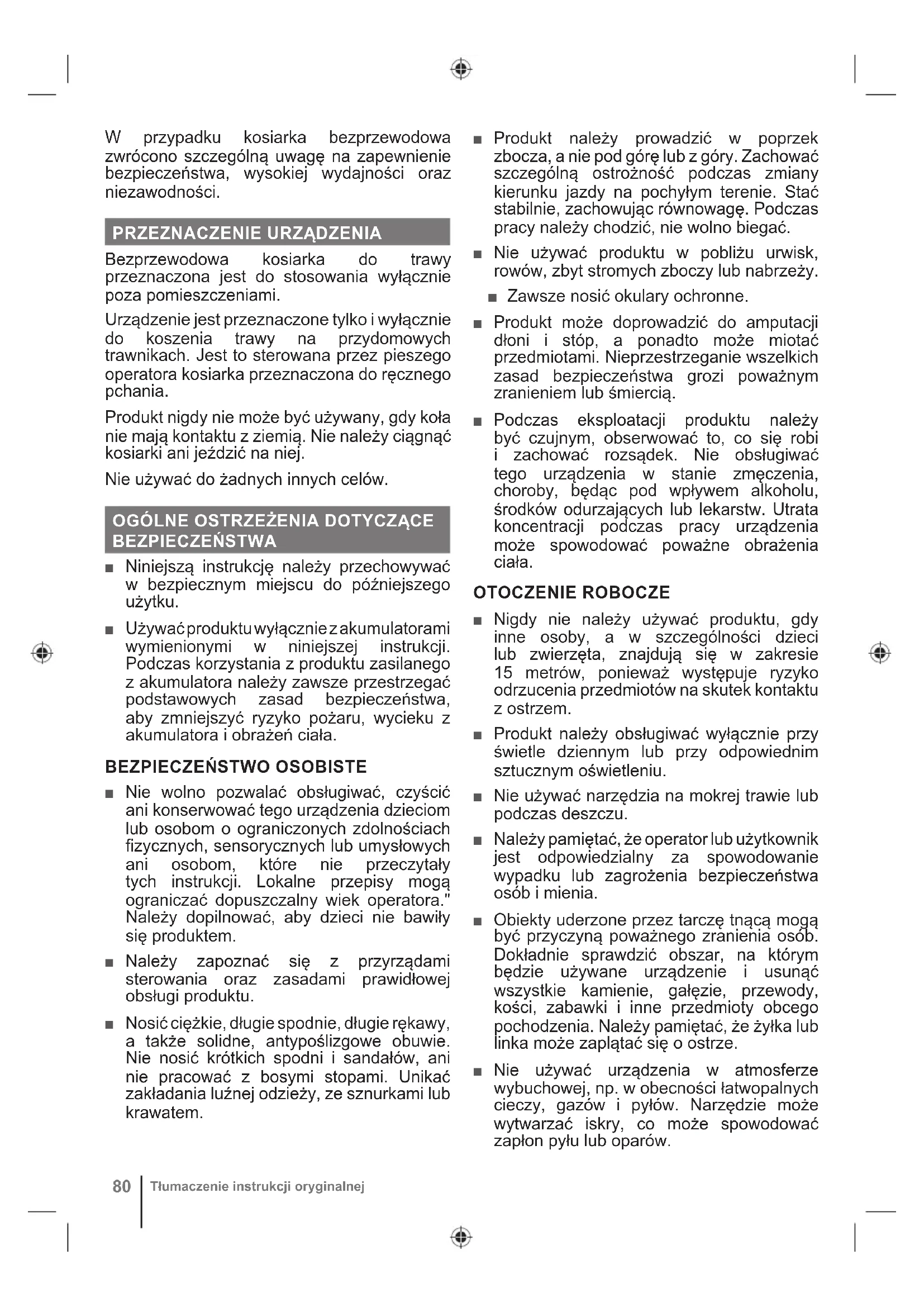 Tłumaczenie instrukcji oryginalnej W przypadku kosiarka bezprzewodowa zwrócono szczególną uwagę na zapewnienie bezpieczeństwa, wysokiej wydajności oraz niezawodności.