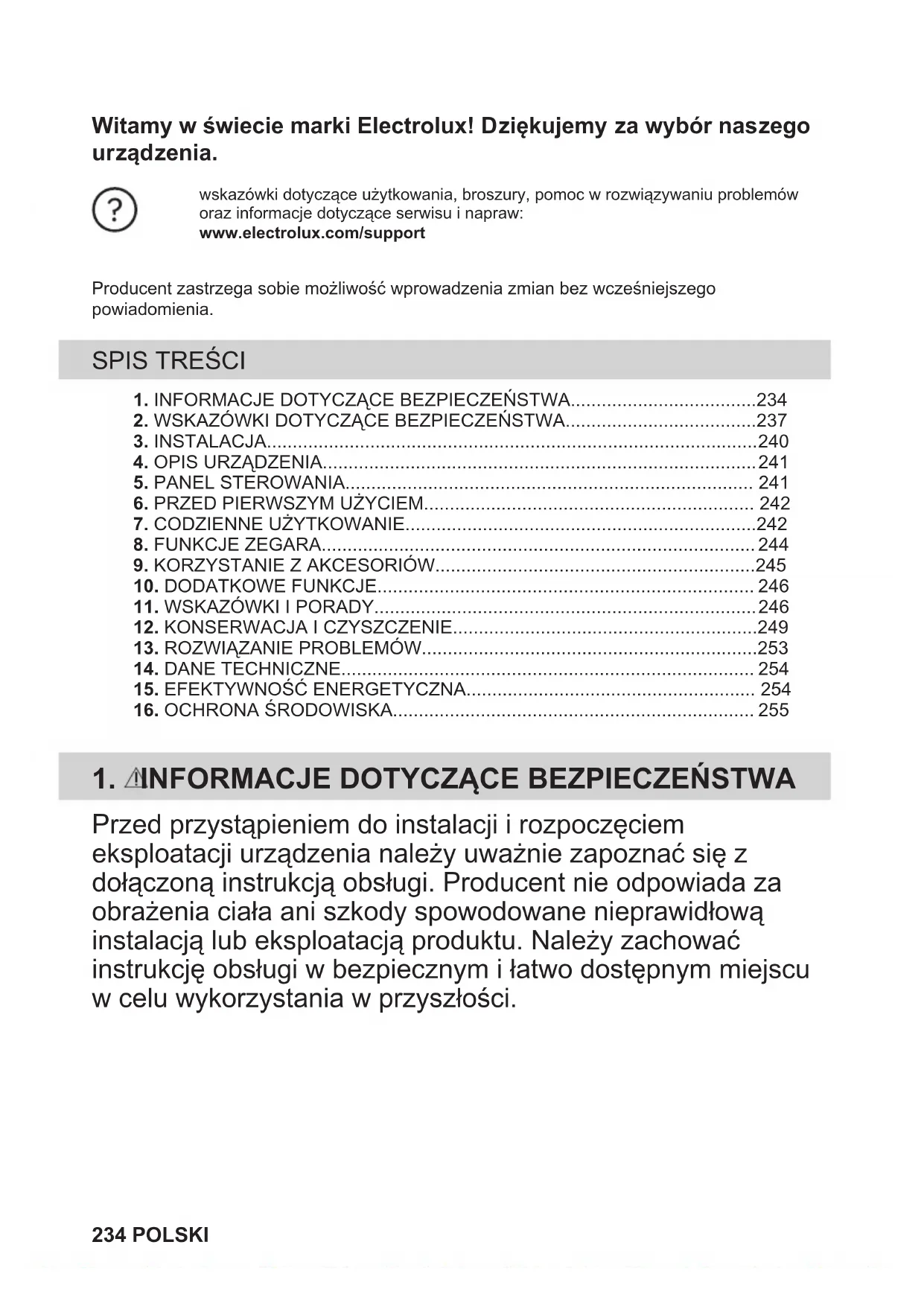 Materiały oznaczone symbolem należy poddać utylizacji. Opakowanie urządzenia włożyć do odpowiedniego pojemnika w celu przeprowadzenia recyklingu. Należy zadbać o ponowne przetwarzanie odpadów urządzeń elektrycznych i elektronicznych, aby chronić środowisko naturalne oraz ludzkie zdrowie. Nie wolno wyrzucać urządzeń oznaczonych symbolem razem z odpadami domowymi. Należy zwrócić produkt do miejscowego punktu ponownego przetwarzania lub skontaktować się z odpowiednimi władzami miejskimi. POLSKI 255Bine aţi venit la Electrolux! Vă mulțumim pentru că ați ales produsul nostru. A găsi sfaturi privind utilizarea, broșuri, informații pentru depanare, service și reparații:www.electrolux.com/supportNe rezervãm dreptul asupra efectuãrii de modificãri. CUPRINS