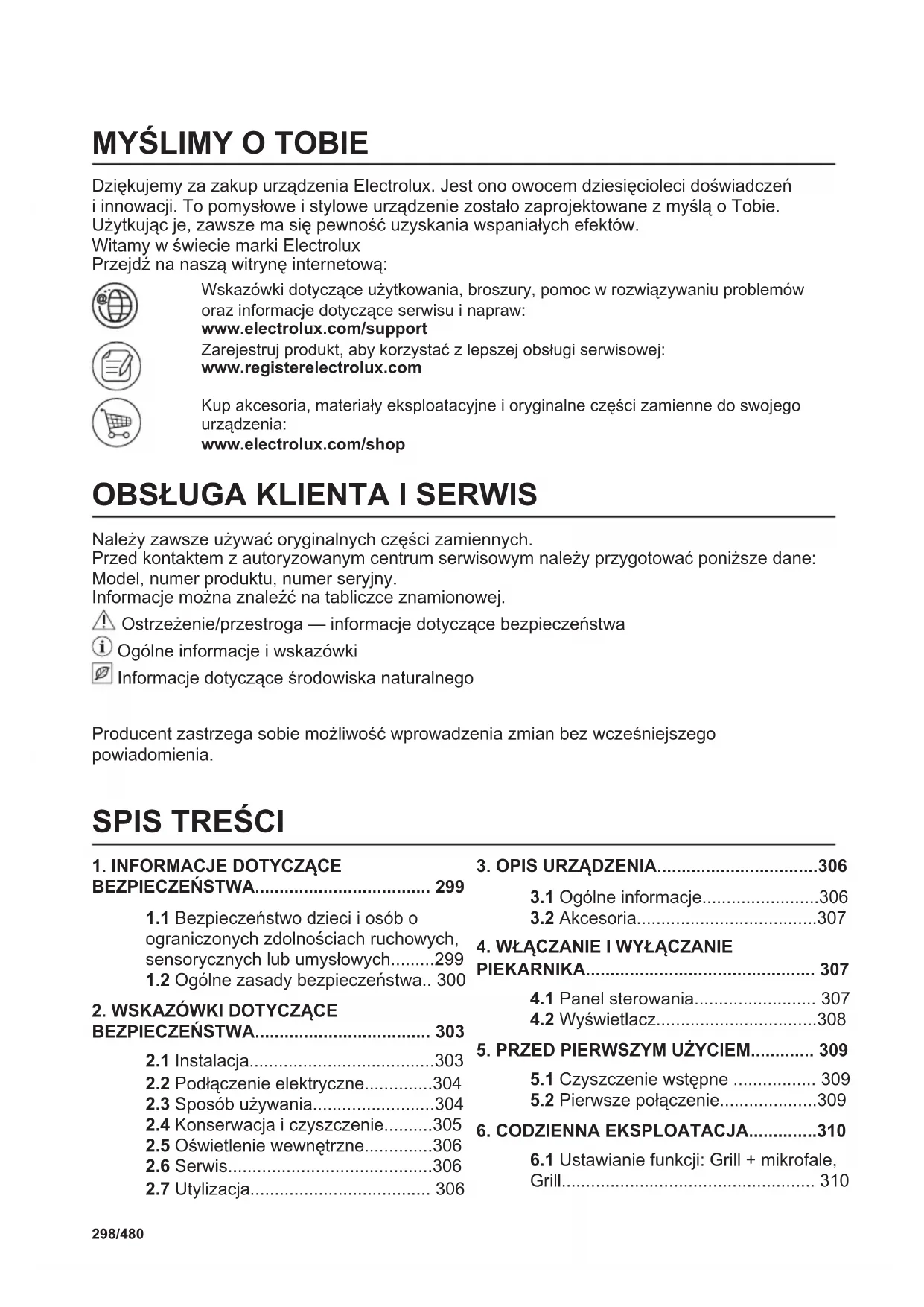 Dziękujemy za zakup urządzenia Electrolux. Jest ono owocem dziesięcioleci doświadczeń i innowacji. To pomysłowe i stylowe urządzenie zostało zaprojektowane z myślą o Tobie. Użytkując je, zawsze ma się pewność uzyskania wspaniałych efektów. Witamy w świecie marki Electrolux Przejdź na naszą witrynę internetową: Wskazówki dotyczące użytkowania, broszury, pomoc w rozwiązywaniu problemów oraz informacje dotyczące serwisu i napraw: www.electrolux.com/support Zarejestruj produkt, aby korzystać z lepszej obsługi serwisowej: www.registerelectrolux.com Kup akcesoria, materiały eksploatacyjne i oryginalne części zamienne do swojego urządzenia: www.electrolux.com/shop