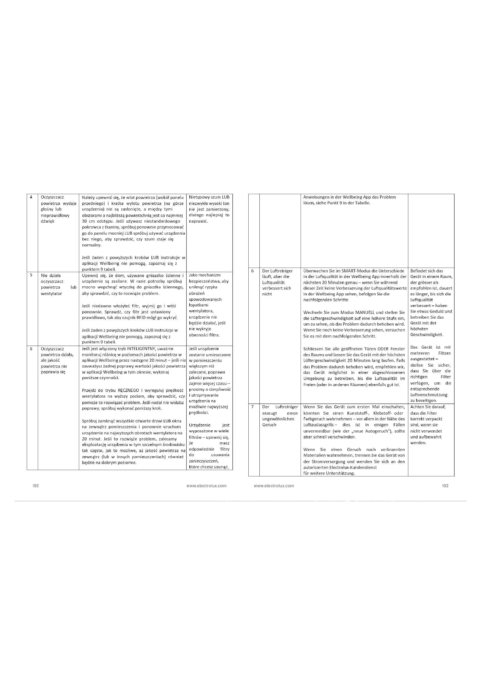 Jeśli żaden z powyższych kroków LUB instrukcje w aplikacji Wellbeing nie pomogą, zapoznaj się z punktem 9 tabeli. Urządzenie zostało zaprojektowane w taki sposób, że gdy kończy się okres eksploatacji filtra, w trybie INTELIGENTNYM podczas użytkowania do momentu wymiany filtra urządzenie ogranicza prędkość wentylatora, aby wprowadzać wychwyconych cząstek stałych ponownie do powietrza. www.electrolux.com