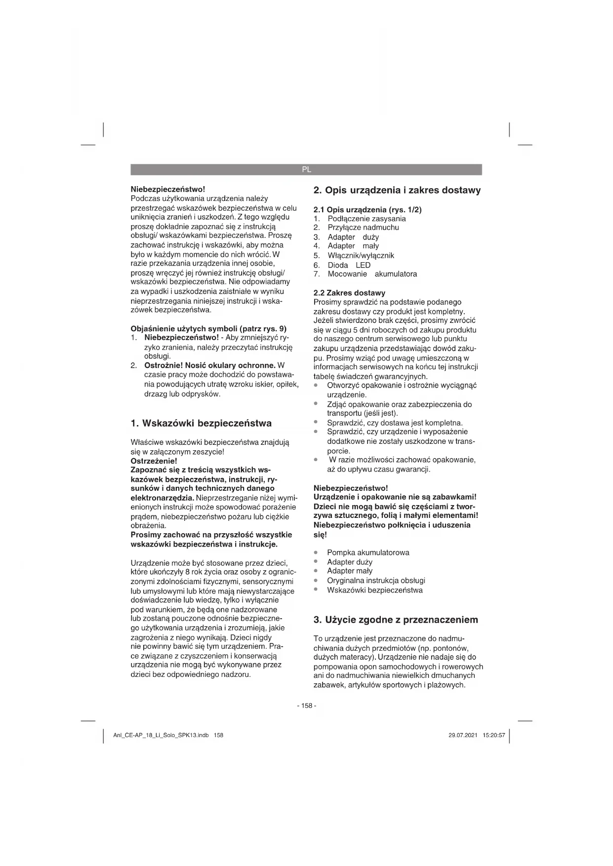 To urządzenie jest przeznaczone do nadmu- chiwania dużych przedmiotów (np. pontonów, dużych materacy). Urządzenie nie nadaje się do pompowania opon samochodowych i rowerowych ani do nadmuchiwania niewielkich dmuchanych zabawek, artykułów sportowych i plażowych. Anl_CE-AP_18_Li_Solo_SPK13.indb 158Anl_CE-AP_18_Li_Solo_SPK13.indb 158 29.07.2021 15:20:5729.07.2021 15:20:57PL