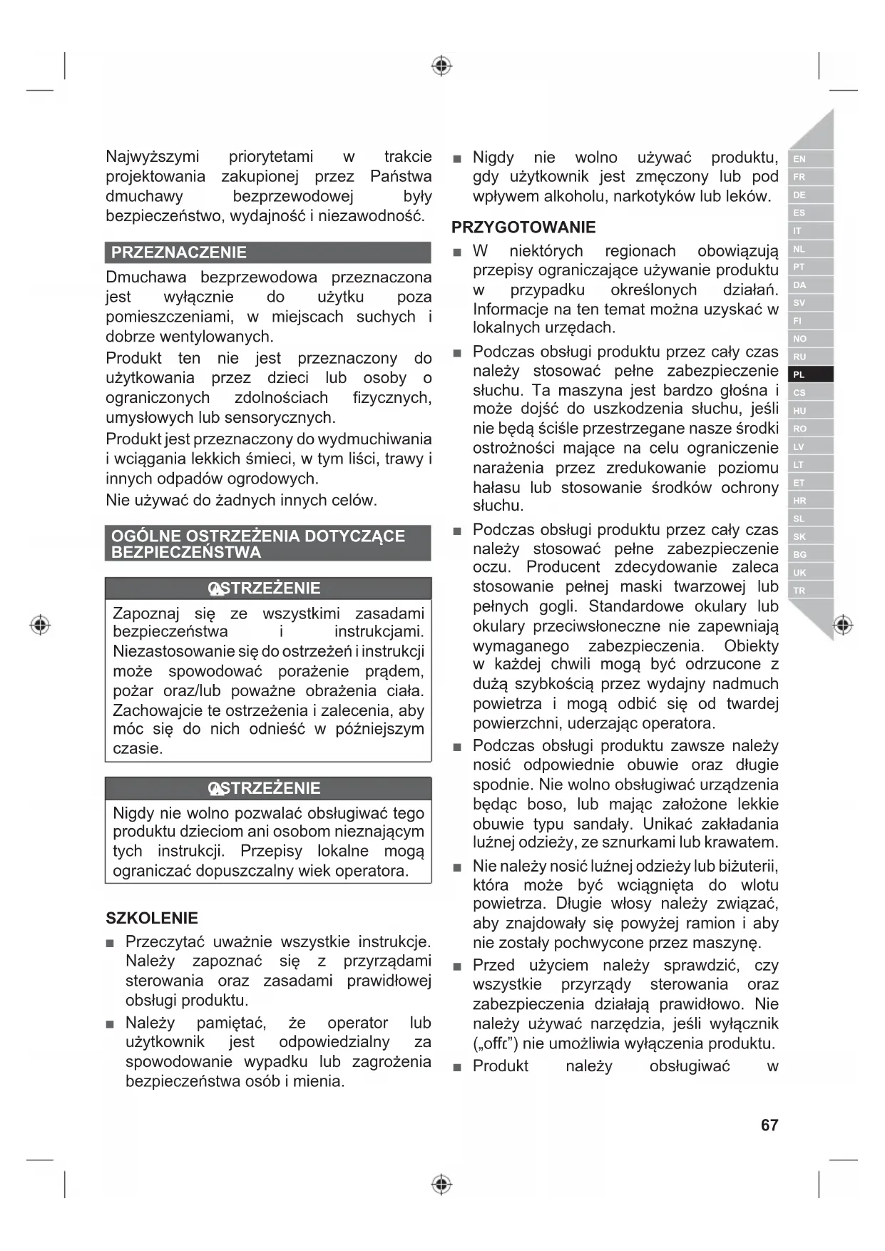 Najwyższymi priorytetami w trakcie projektowania zakupionej przez Państwa dmuchawy bezprzewodowej były bezpieczeństwo, wydajność i niezawodność. PRZEZNACZENIE Dmuchawa bezprzewodowa przeznaczona jest wyłącznie do użytku poza pomieszczeniami, w miejscach suchych i dobrze wentylowanych. Produkt ten nie jest przeznaczony do użytkowania przez dzieci lub osoby o ograniczonych zdolnościach fi zycznych, umysłowych lub sensorycznych. Produkt jest przeznaczony do wydmuchiwania i wciągania lekkich śmieci, w tym liści, trawy i innych odpadów ogrodowych. Nie używać do żadnych innych celów.
