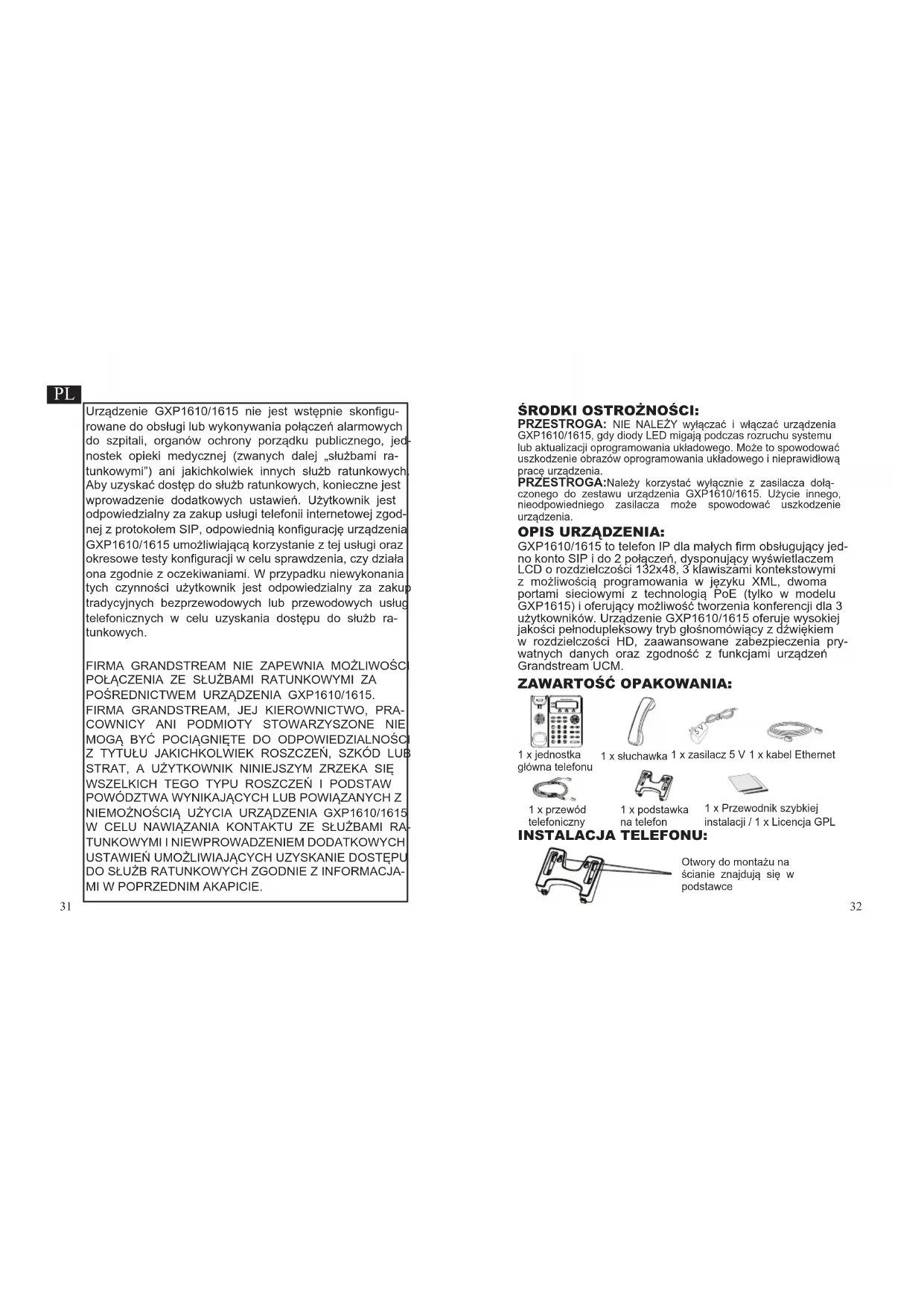 Urządzenie GXP1610/1615 nie jest wstępnie skonfigu- rowane do obsługi lub wykonywania połączeń alarmowych do szpitali, organów ochrony porządku publicznego, jed- nostek opieki medycznej (zwanych dalej „służbami ra- tunkowymi”) ani jakichkolwiek innych służb ratunkowych. Aby uzyskać dostęp do służb ratunkowych, konieczne jest wprowadzenie dodatkowych ustawień. Użytkownik jest odpowiedzialny za zakup usługi telefonii internetowej zgod- nej z protokołem SIP, odpowiednią konfigurację urządzenia GXP1610/1615 umożliwiającą korzystanie z tej usługi oraz okresowe testy konfiguracji w celu sprawdzenia, czy działa ona zgodnie z oczekiwaniami. W przypadku niewykonania tych czynności użytkownik jest odpowiedzialny za zakup tradycyjnych bezprzewodowych lub przewodowych usług telefonicznych w celu uzyskania dostępu do służb ra- tunkowych. FIRMA GRANDSTREAM NIE ZAPEWNIA MOŻLIWOŚCI POŁĄCZENIA ZE SŁUŻBAMI RATUNKOWYMI ZA POŚREDNICTWEM URZĄDZENIA GXP1610/1615.