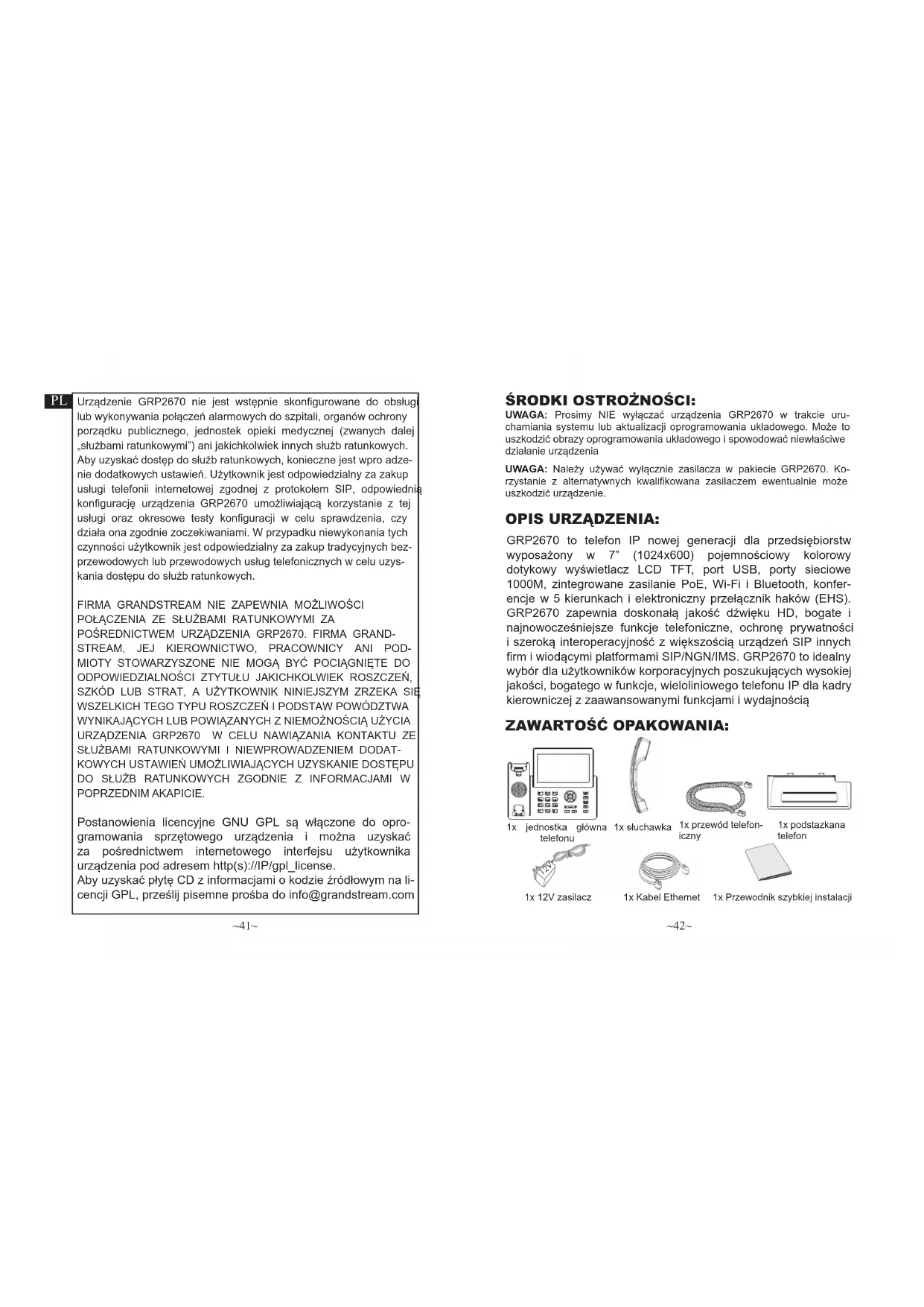 MIOTY STOWARZYSZONE NIE MOGĄ BYĆ POCIĄGNIĘTE DO ODPOWIEDZIALNOŚCI ZTYTUŁU JAKICHKOLWIEK ROSZCZEŃ, SZKÓD LUB STRAT, A UŻYTKOWNIK NINIEJSZYM ZRZEKA SIĘ WSZELKICH TEGO TYPU ROSZCZEŃ I PODSTAW POWÓDZTWA WYNIKAJĄCYCH LUB POWIĄZANYCH Z NIEMOŻNOŚCIĄ UŻYCIA URZĄDZENIA GRP2670 W CELU NAWIĄZANIA KONTAKTU ZE SŁUŻBAMI RATUNKOWYMI I NIEWPROWADZENIEM DODAT- KOWYCH USTAWIEŃ UMOŻLIWIAJĄCYCH UZYSKANIE DOSTĘPU DO SŁUŻB RATUNKOWYCH ZGODNIE Z INFORMACJAMI W POPRZEDNIM AKAPICIE. Postanowienia licencyjne GNU GPL są włączone do opro- gramowania sprzętowego urządzenia i można uzyskać za pośrednictwem internetowego interfejsu użytkownika urządzenia pod adresem http(s)://IP/gpl_license. Aby uzyskać płytę CD z informacjami o kodzie źródłowym na li- cencji GPL, prześlij pisemne prośba do info@grandstream.com