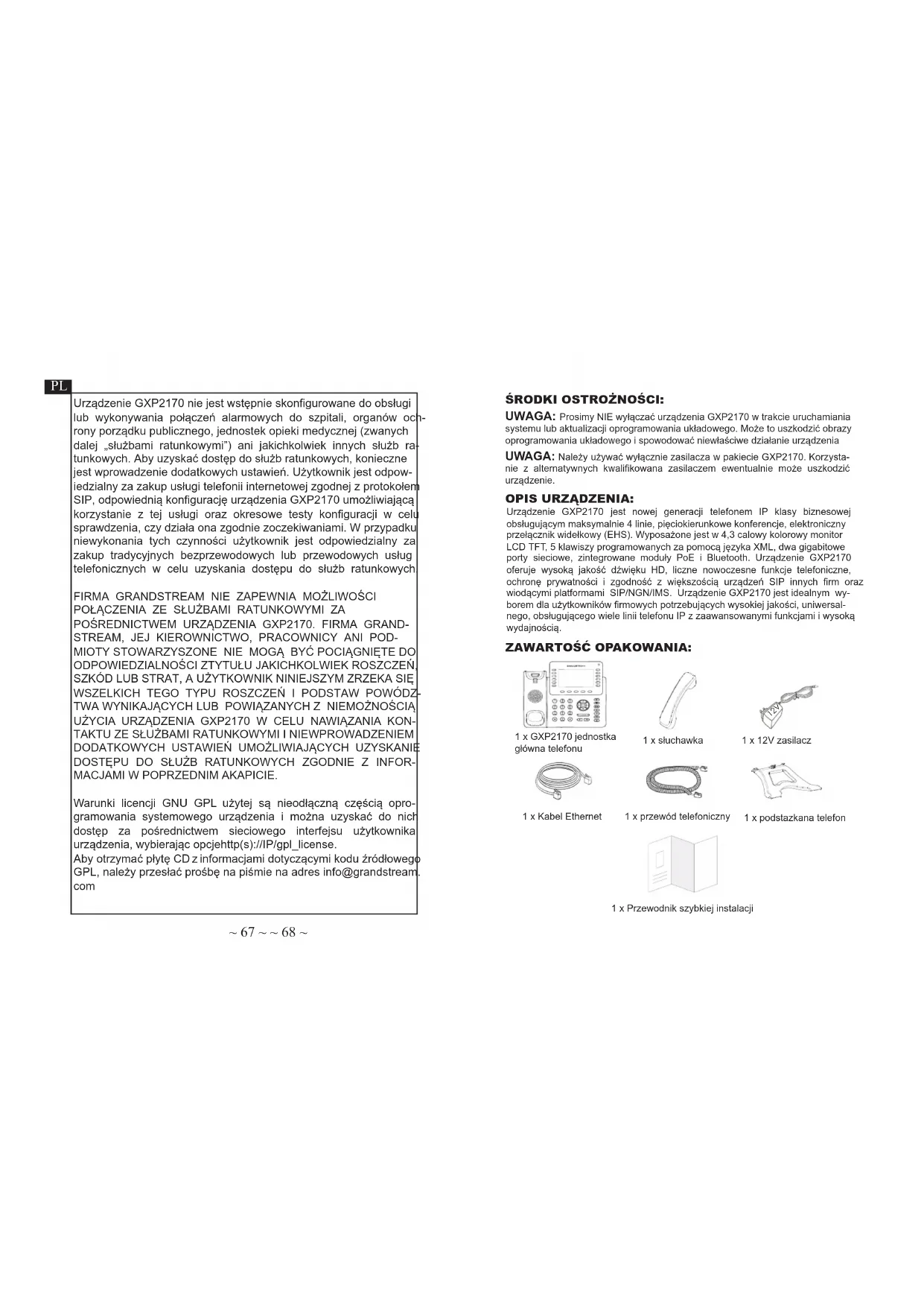 Nota: Para o manual de usuário detalhado, faça o download de: http://www.Grandstream.com/support~ 67 ~ ~ 68 ~ Urządzenie GXP2170 nie jest wstępnie skongurowane do obsługi lub wykonywania połączeń alarmowych do szpitali, organów och- rony porządku publicznego, jednostek opieki medycznej (zwanych dalej „służbami ratunkowymi”) ani jakichkolwiek innych służb ra- tunkowych. Aby uzyskać dostęp do służb ratunkowych, konieczne jest wprowadzenie dodatkowych ustawień. Użytkownik jest odpow- iedzialny za zakup usługi telefonii internetowej zgodnej z protokołem SIP, odpowiednią kongurację urządzenia GXP2170 umożliwiającą korzystanie z tej usługi oraz okresowe testy konguracji w celu sprawdzenia, czy działa ona zgodnie zoczekiwaniami. W przypadku niewykonania tych czynności użytkownik jest odpowiedzialny za zakup tradycyjnych bezprzewodowych lub przewodowych usług telefonicznych w celu uzyskania dostępu do służb ratunkowych. FIRMA GRANDSTREAM NIE ZAPEWNIA MOŻLIWOŚCI POŁĄCZENIA ZE SŁUŻBAMI RATUNKOWYMI ZA POŚREDNICTWEM URZĄDZENIA GXP2170. FIRMA GRAND-