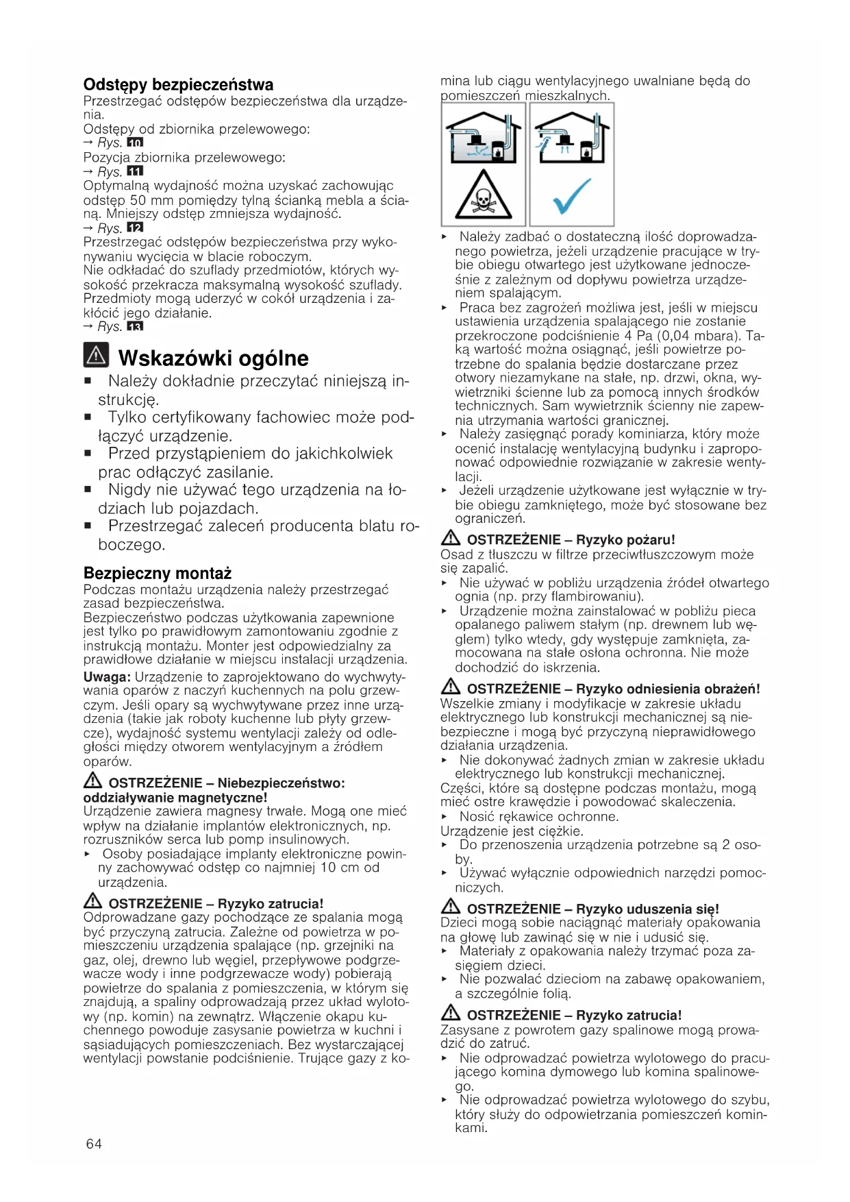 Wskazówki ogólne ¡ Należy dokładnie przeczytać niniejszą in- strukcję. ¡ Tylko certyfikowany fachowiec może pod- łączyć urządzenie. ¡ Przed przystąpieniem do jakichkolwiek prac odłączyć zasilanie. ¡ Nigdy nie używać tego urządzenia na ło- dziach lub pojazdach. ¡ Przestrzegać zaleceń producenta blatu ro- boczego. Bezpieczny montaż Podczas montażu urządzenia należy przestrzegać zasad bezpieczeństwa. Bezpieczeństwo podczas użytkowania zapewnione jest tylko po prawidłowym zamontowaniu zgodnie z instrukcją montażu. Monter jest odpowiedzialny za prawidłowe działanie w miejscu instalacji urządzenia. Uwaga:Urządzenie to zaprojektowano do wychwyty- wania oparów z naczyń kuchennych na polu grzew- czym. Jeśli opary są wychwytywane przez inne urzą- dzenia (takie jak roboty kuchenne lub płyty grzew- cze), wydajność systemu wentylacji zależy od odle- głości między otworem wentylacyjnym a źródłem oparów. OSTRZEŻENIE‒Niebezpieczeństwo: oddziaływanie magnetyczne! Urządzenie zawiera magnesy trwałe. Mogą one mieć wpływ na działanie implantów elektronicznych, np. rozruszników serca lub pomp insulinowych. ▶ Osoby posiadające implanty elektroniczne powin- ny zachowywać odstęp co najmniej 10cm od urządzenia. OSTRZEŻENIE‒Ryzyko zatrucia! Odprowadzane gazy pochodzące ze spalania mogą być przyczyną zatrucia. Zależne od powietrza w po- mieszczeniu urządzenia spalające (np. grzejniki na gaz, olej, drewno lub węgiel, przepływowe podgrze- wacze wody i inne podgrzewacze wody) pobierają powietrze do spalania z pomieszczenia, w którym się znajdują, a spaliny odprowadzają przez układ wyloto- wy (np. komin) na zewnątrz. Włączenie okapu ku- chennego powoduje zasysanie powietrza w kuchni i sąsiadujących pomieszczeniach. Bez wystarczającej wentylacji powstanie podciśnienie. Trujące gazy z ko- mina lub ciągu wentylacyjnego uwalniane będą do pomieszczeń mieszkalnych. ▶ Należy zadbać o dostateczną ilość doprowadza- nego powietrza, jeżeli urządzenie pracujące w try- bie obiegu otwartego jest użytkowane jednocze- śnie z zależnym od dopływu powietrza urządze- niem spalającym. ▶ Praca bez zagrożeń możliwa jest, jeśli w miejscu ustawienia urządzenia spalającego nie zostanie przekroczone podciśnienie 4 Pa (0,04 mbara). Ta- ką wartość można osiągnąć, jeśli powietrze po- trzebne do spalania będzie dostarczane przez otwory niezamykane na stałe, np. drzwi, okna, wy- wietrzniki ścienne lub za pomocą innych środków technicznych. Sam wywietrznik ścienny nie zapew- nia utrzymania wartości granicznej. ▶ Należy zasięgnąć porady kominiarza, który może ocenić instalację wentylacyjną budynku i zapropo- nować odpowiednie rozwiązanie w zakresie wenty- lacji. ▶ Jeżeli urządzenie użytkowane jest wyłącznie w try- bie obiegu zamkniętego, może być stosowane bez ograniczeń. OSTRZEŻENIE‒Ryzyko pożaru! Osad z tłuszczu w filtrze przeciwtłuszczowym może się zapalić. ▶ Nie używać w pobliżu urządzenia źródeł otwartego ognia (np. przy flambirowaniu). ▶ Urządzenie można zainstalować w pobliżu pieca opalanego paliwem stałym (np. drewnem lub wę- glem) tylko wtedy, gdy występuje zamknięta, za- mocowana na stałe osłona ochronna. Nie może dochodzić do iskrzenia. OSTRZEŻENIE‒Ryzyko odniesienia obrażeń! Wszelkie zmiany i modyfikacje w zakresie układu elektrycznego lub konstrukcji mechanicznej są nie- bezpieczne i mogą być przyczyną nieprawidłowego działania urządzenia. ▶ Nie dokonywać żadnych zmian w zakresie układu elektrycznego lub konstrukcji mechanicznej. Części, które są dostępne podczas montażu, mogą mieć ostre krawędzie i powodować skaleczenia. ▶ Nosić rękawice ochronne. Urządzenie jest ciężkie. ▶ Do przenoszenia urządzenia potrzebne są 2 oso- by. ▶ Używać wyłącznie odpowiednich narzędzi pomoc- niczych. OSTRZEŻENIE‒Ryzyko uduszenia się! Dzieci mogą sobie naciągnąć materiały opakowania na głowę lub zawinąć się w nie i udusić się. ▶ Materiały z opakowania należy trzymać poza za- sięgiem dzieci. ▶ Nie pozwalać dzieciom na zabawę opakowaniem, aszczególnie folią. OSTRZEŻENIE‒Ryzyko zatrucia! Zasysane z powrotem gazy spalinowe mogą prowa- dzić do zatruć. ▶ Nie odprowadzać powietrza wylotowego do pracu- jącego komina dymowego lub komina spalinowe- go. ▶ Nie odprowadzać powietrza wylotowego do szybu, który służy do odpowietrzania pomieszczeń komin- kami.65 ▶ Jeżeli powietrze wylotowe ma być odprowadzane do komina dymowego lub komina spalinowego, który nie pracuje, trzeba mieć na to zgodę od od- powiedniego mistrza kominiarskiego. Odprowadzane gazy pochodzące ze spalania mogą być przyczyną zatrucia. ▶ Jeżeli okap kuchenny jest zainstalowany z komin- kiem zależnym od powietrza w pomieszczeniu, za- silanie elektryczne okapu kuchennego musi być wyposażone w odpowiedni obwód zabezpieczają- cy. Wskazówki dotyczące przyłącza elektrycznego Aby móc bezpiecznie podłączyć urządzenie do sieci elektrycznej, należy przestrzegać poniższych wskazó- wek. OSTRZEŻENIE‒Ryzyko porażenia prądem! Odłączenie urządzenia od zasilania musi być możli- we w każdej chwili. Urządzenie można podłączyć wy- łącznie do gniazda zainstalowanego zgodnie z prze- pisami. ▶ Jeśli nie jest to możliwe, w stałej instalacji elek- trycznej należy zamontować rozłącznik wielobiegu- nowy zgodnie z warunkami kategorii przepięciowej III i przepisami instalacyjnymi. ▶ Jedynie osoba z uprawnieniami elektryka może wykonać stałą instalację elektryczną. Zalecamy za- instalowanie wyłącznika różnicowo-prądowego (wyłącznik RP) w obwodzie elektrycznym zasilania urządzenia. ¡ Nie zaginać ani nie zaciskać przewodu przyłącze- niowego i trzymać go z dala od ostrych krawędzi. ¡ Ułożyć kabel przyłączeniowy tak, aby nie dotykał gorącej obudowy urządzenia. 