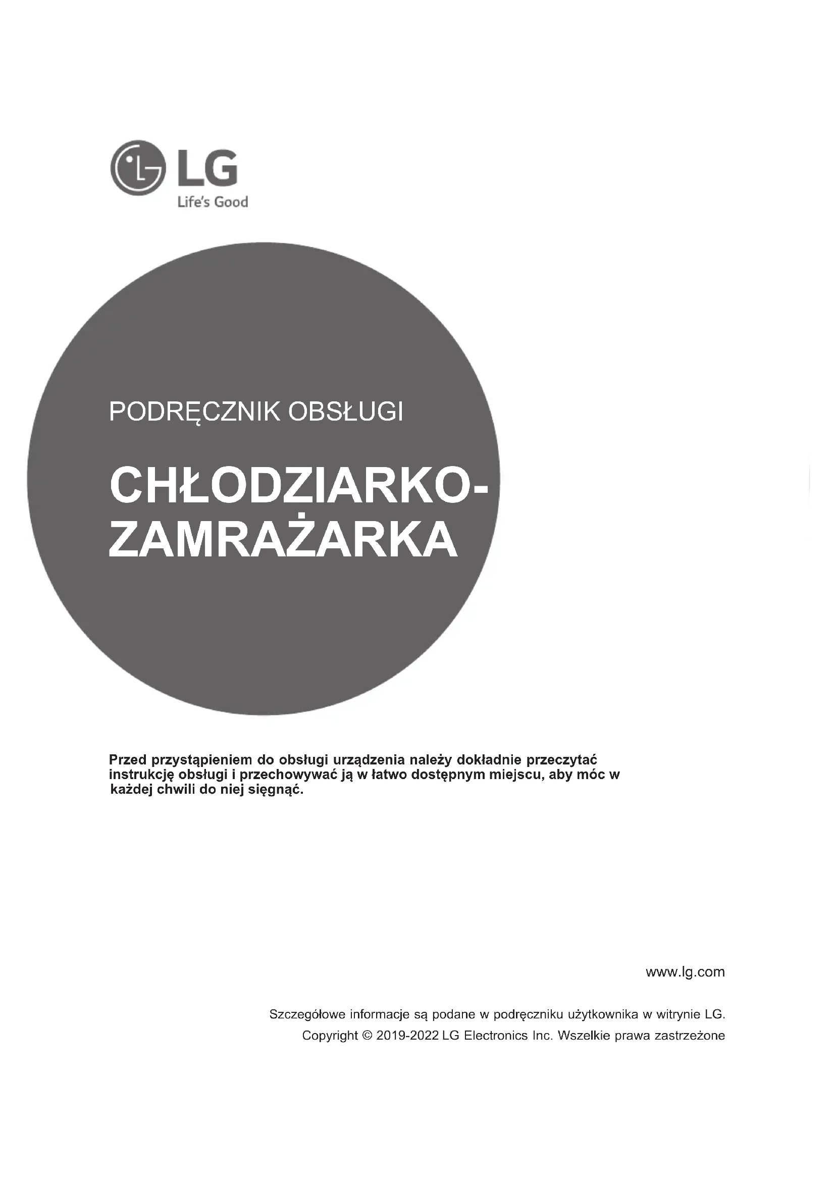 - Minimum garantiperiode for dette kjøleapparatet er 24 måneder.www.lg.com CHŁODZIARKO- ZAMRAŻARKA Przed przystąpieniem do obsługi urządzenia należy dokładnie przeczytać instrukcję obsługi i przechowywać ją w łatwo dostępnym miejscu, aby móc w każdej chwili do niej sięgnąć. Szczegółowe informacje są podane w podręczniku użytkownika w witrynie LG. Copyright © 2019-2022 LG Electronics Inc. Wszelkie prawa zastrzeżone