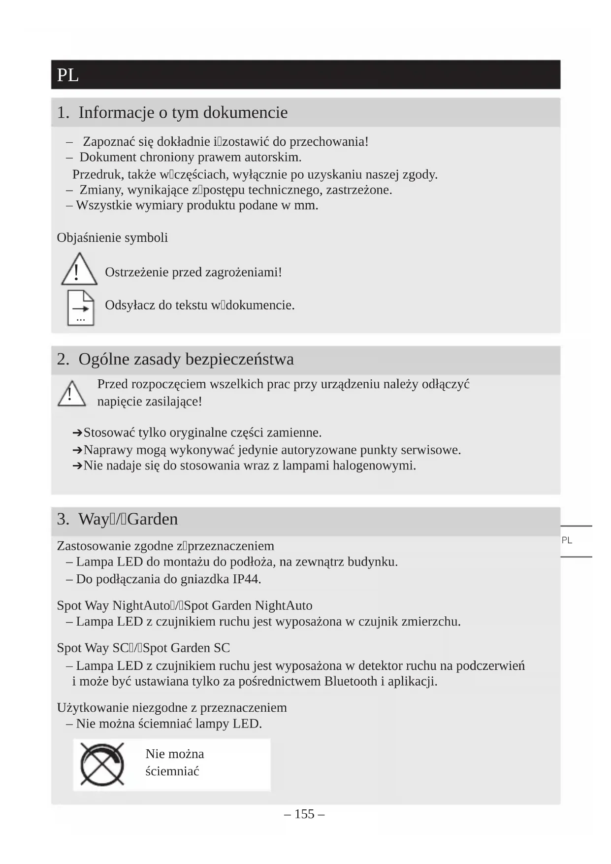 Zastosowanie zgodne zprzeznaczeniem – Lampa LED do montażu do podłoża, na zewnątrz budynku. – Do podłączania do gniazdka IP44. Spot Way NightAuto/Spot Garden NightAuto – Lampa LED z czujnikiem ruchu jest wyposażona w czujnik zmierzchu. Spot Way SC/Spot Garden SC – Lampa LED z czujnikiem ruchu jest wyposażona w detektor ruchu na podczerwień i może być ustawiana tylko za pośrednictwem Bluetooth i aplikacji. Użytkowanie niezgodne z przeznaczeniem – Nie można ściemniać lampy LED. Nie można ściemniać PL– 156 – Zakres dostawy Spot Way (Rys. 3.1) – Lampa wraz ze słupkiem, stopką i kablem podłączeniowym z wtyczką – Trzy śruby – Trzy kołki Zakres dostawy Spot Garden (Rys. 3.2) – Lampa wraz z kablem podłączeniowym z wtyczką – Słupek ziemny – Dwie śruby Wymiary produktu Spot Way (Rys.3.3) Wymiary produktu Spot Garden (Rys.3.4) Przegląd produktu (Rys. 3.5 – 3.10) A Oprawa lampy B Czujnik ruchu (tylko Spot Way/Garden SC) C Czujnik jasności (tylko Spot Way/Garden NightAuto) D Ustawianie progu czułości zmierzchowej (tylko Spot Way/Garden NightAuto) E Słupek ze stopką (tylko Spot Way) F Słupek ziemny (tylko Spot Garden) G Kabel sieciowy z wtyczką Obszar wykrywania Spot Way/Garden SC (Rys. 3.11 – 3.16) Rozkład natężenia światła (Rys. 3.17)