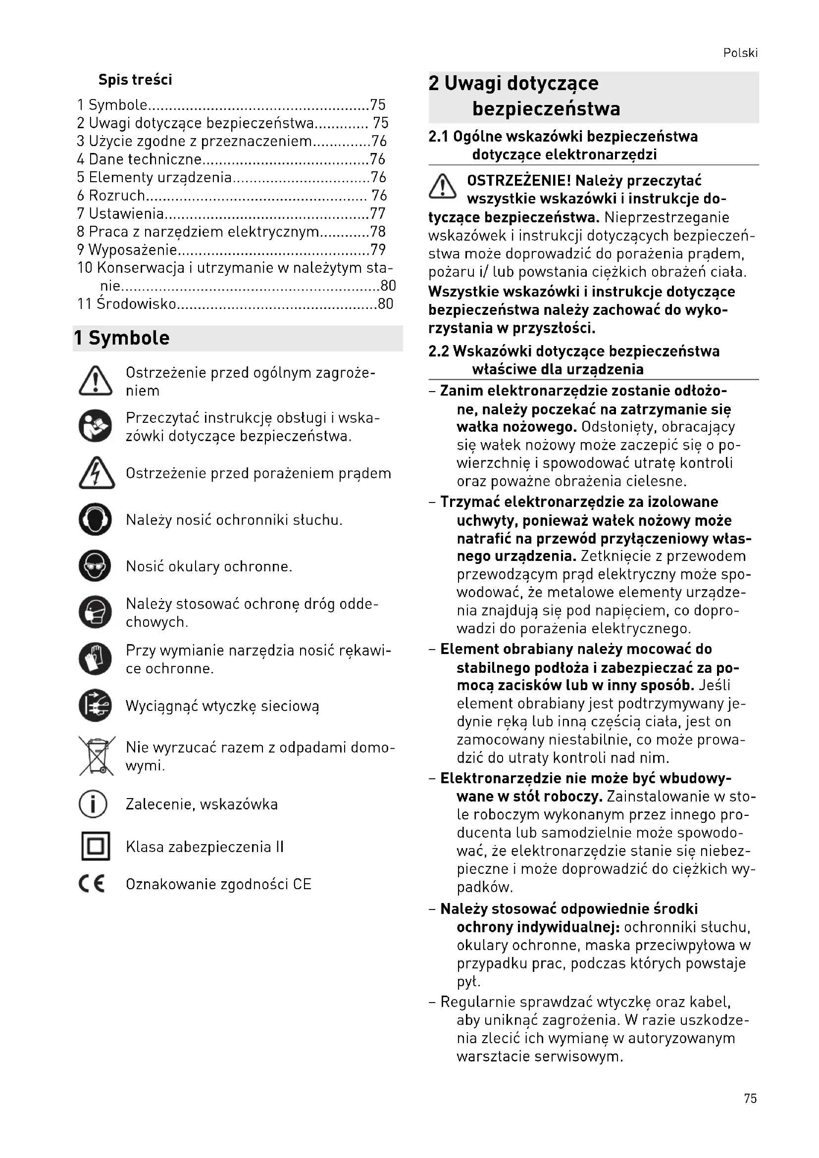 właściwe dla urządzenia – Zanim elektronarzędzie zostanie odłożo ne, należy poczekać na zatrzymanie się wałka nożowego. Odsłonięty, obracający się wałek nożowy może zaczepić się o po wierzchnię i spowodować utratę kontroli oraz poważne obrażenia cielesne. – Trzymać elektronarzędzie za izolowane uchwyty, ponieważ wałek nożowy może natrafić na przewód przyłączeniowy włas nego urządzenia. Zetknięcie z przewodem przewodzącym prąd elektryczny może spo wodować, że metalowe elementy urządze nia znajdują się pod napięciem, co dopro wadzi do porażenia elektrycznego. – Element obrabiany należy mocować do stabilnego podłoża i zabezpieczać za po mocą zacisków lub w inny sposób. Jeśli element obrabiany jest podtrzymywany je dynie ręką lub inną częścią ciała, jest on zamocowany niestabilnie, co może prowa dzić do utraty kontroli nad nim. – Elektronarzędzie nie może być wbudowy wane w stół roboczy. Zainstalowanie w sto le roboczym wykonanym przez innego pro ducenta lub samodzielnie może spowodo wać, że elektronarzędzie stanie się niebez pieczne i może doprowadzić do ciężkich wy padków. – Należy stosować odpowiednie środki ochrony indywidualnej: ochronniki słuchu, okulary ochronne, maska przeciwpyłowa w przypadku prac, podczas których powstaje pył. – Regularnie sprawdzać wtyczkę oraz kabel, aby uniknąć zagrożenia. W razie uszkodze nia zlecić ich wymianę w autoryzowanym warsztacie serwisowym. Polski