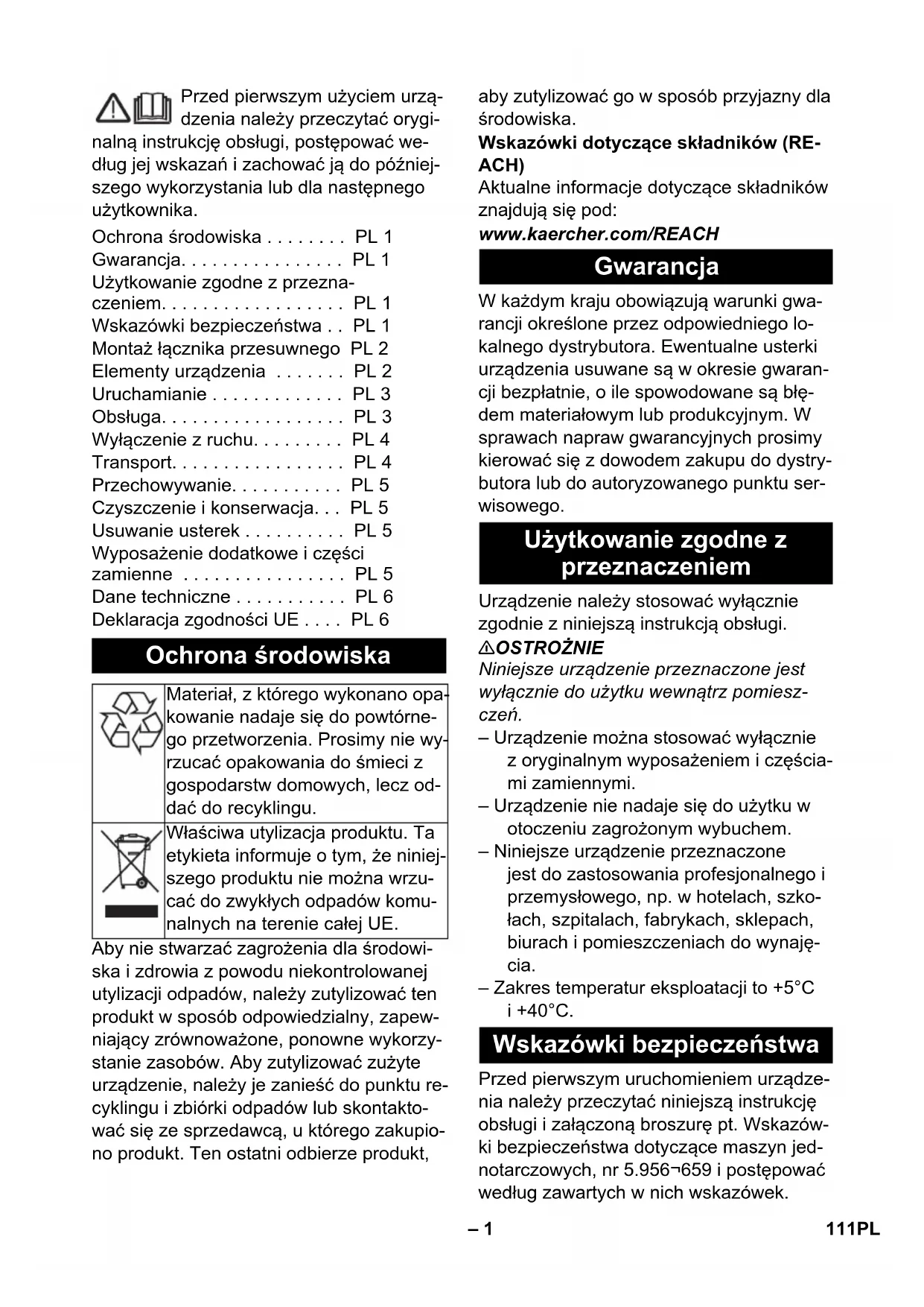 Chairman of the Board of Management Director Regulatory Affairs & Certification 110 SL– 1 Przed pierwszym użyciem urzą- dzenia należy przeczytać orygi- nalną instrukcję obsługi, postępować we- dług jej wskazań i zachować ją do później- szego wykorzystania lub dla następnego użytkownika. Aby nie stwarzać zagrożenia dla środowi- ska i zdrowia z powodu niekontrolowanej utylizacji odpadów, należy zutylizować ten produkt w sposób odpowiedzialny, zapew- niający zrównoważone, ponowne wykorzy- stanie zasobów. Aby zutylizować zużyte urządzenie, należy je zanieść do punktu re- cyklingu i zbiórki odpadów lub skontakto- wać się ze sprzedawcą, u którego zakupio- no produkt. Ten ostatni odbierze produkt, aby zutylizować go w sposób przyjazny dla środowiska. Wskazówki dotyczące składników (RE- ACH) Aktualne informacje dotyczące składników znajdują się pod: www.kaercher.com/REACH W każdym kraju obowiązują warunki gwa- rancji określone przez odpowiedniego lo- kalnego dystrybutora. Ewentualne usterki urządzenia usuwane są w okresie gwaran- cji bezpłatnie, o ile spowodowane są błę- dem materiałowym lub produkcyjnym. W sprawach napraw gwarancyjnych prosimy kierować się z dowodem zakupu do dystry- butora lub do autoryzowanego punktu ser- wisowego. Urządzenie należy stosować wyłącznie zgodnie z niniejszą instrukcją obsługi. 몇 OSTROŻNIE Niniejsze urządzenie przeznaczone jest wyłącznie do użytku wewnątrz pomiesz- czeń. – Urządzenie można stosować wyłącznie z oryginalnym wyposażeniem i częścia- mi zamiennymi. – Urządzenie nie nadaje się do użytku w otoczeniu zagrożonym wybuchem. – Niniejsze urządzenie przeznaczone jest do zastosowania profesjonalnego i przemysłowego, np. w hotelach, szko- łach, szpitalach, fabrykach, sklepach, biurach i pomieszczeniach do wynaję- cia. – Zakres temperatur eksploatacji to +5°C i +40°C. Przed pierwszym uruchomieniem urządze- nia należy przeczytać niniejszą instrukcję obsługi i załączoną broszurę pt. Wskazów- ki bezpieczeństwa dotyczące maszyn jed- notarczowych, nr 5.956¬659 i postępować według zawartych w nich wskazówek. Ochrona środowiska . . . . . . . . PL 1 Gwarancja. . . . . . . . . . . . . . . . PL 1 Użytkowanie zgodne z przezna- czeniem. . . . . . . . . . . . . . . . . . PL 1 Wskazówki bezpieczeństwa . . PL 1 Montaż łącznika przesuwnego PL 2 Elementy urządzenia . . . . . . . PL 2 Uruchamianie . . . . . . . . . . . . . PL 3 Obsługa. . . . . . . . . . . . . . . . . . PL 3 Wyłączenie z ruchu. . . . . . . . . PL 4 Transport. . . . . . . . . . . . . . . . . PL 4 Przechowywanie. . . . . . . . . . . PL 5 Czyszczenie i konserwacja. . . PL 5 Usuwanie usterek . . . . . . . . . . PL 5 Wyposażenie dodatkowe i części zamienne . . . . . . . . . . . . . . . . PL 5 Dane techniczne . . . . . . . . . . . PL 6 Deklaracja zgodności UE . . . . PL 6 Ochrona środowiska Materiał, z którego wykonano opa- kowanie nadaje się do powtórne- go przetworzenia. Prosimy nie wy- rzucać opakowania do śmieci z gospodarstw domowych, lecz od- dać do recyklingu. Właściwa utylizacja produktu. Ta etykieta informuje o tym, że niniej- szego produktu nie można wrzu- cać do zwykłych odpadów komu- nalnych na terenie całej UE. Gwarancja Użytkowanie zgodne z przeznaczeniem Wskazówki bezpieczeństwa 111PL– 2 NIEBEZPIECZEŃSTWO Wskazówka dot. bezpośredniego zagroże- nia, prowadzącego do ciężkich obrażeń ciała lub do śmierci. 몇 OSTRZEŻENIE Wskazówka dot. możliwie niebezpiecznej sytuacji, mogącej prowadzić do ciężkich obrażeń ciała lub śmierci. 몇 OSTROŻNIE Wskazówka dot. możliwie niebezpiecznej sytuacji, która może prowadzić do lekkich zranień. UWAGA Wskazówka dot. możliwie niebezpiecznej sytuacji, która może prowadzić do szkód materialnych. Zabezpieczenia chronią użytkownika i dla- tego nie wolno ich usuwać, wyłączać ani obchodzić ich działania. Zapobiega to niezamierzonemu włączeniu urządzenia. W celu włączenia urządzenia należy nacisnąć przycisk odblokowujący, a następnie włącznik / wyłącznik. Przed uruchomieniem należy zamontować łącznik przesuwny we wskazany sposób i ustanowić połączenie elektryczne z urzą- dzeniem. Rysunek patrz Strona okładki Na rysunku przedstawiono urządzenie BDS 43/150 C Classic. Urządzenie BDS 43/Duo C nieco się od niego różni. 1 Zabierak, szczotka tarczowa / talerz na- pędowy 2 Płytka napędu szczotki / pada 3 Dźwignia dozująca roztworu środka czyszczącego (opcja) 4 Włącznik / wyłącznik 5 Hak kablowy 6 przycisk odblokowujący 7 Uchwyt 8 Dźwignia regulacji przechyłu 9 Bezpiecznik napędu szczotek 10 Gniazdko na akcesoria 11 Zbiornik środka czyszczącego (opcja) 12 Głowica odkurzacza silnika 13 Przełącznik prędkości obrotowej szczo- tek (tylko BDS 43/Duo C) ** elementy nie objęte zakresem dostawy Stopnie zagrożenia Zabezpieczenia Blokada Montaż łącznika przesuwnego Elementy urządzenia