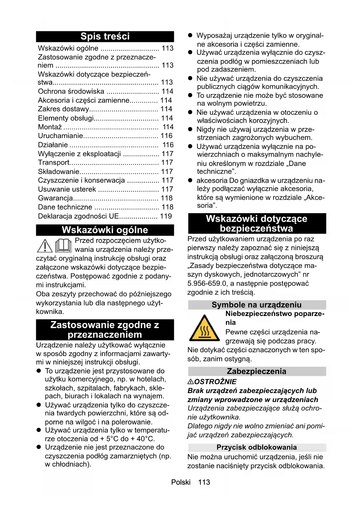 - 67,1 71,5Polski 113 Spis treści Wskazówki ogólne Przed rozpoczęciem użytko- wania urządzenia należy prze- czytać oryginalną instrukcję obsługi oraz załączone wskazówki dotyczące bezpie- czeństwa. Postępować zgodnie z podany- mi instrukcjami. Oba zeszyty przechować do późniejszego wykorzystania lub dla następnego użyt- kownika. Zastosowanie zgodne z przeznaczeniem Urządzenie należy użytkować wyłącznie w sposób zgodny z informacjami zawarty- mi w niniejszej instrukcji obsługi. To urządzenie jest przystosowane do użytku komercyjnego, np. w hotelach, szkołach, szpitalach, fabrykach, skle- pach, biurach i lokalach na wynajem. Używać urządzenia tylko do czyszcze- nia twardych powierzchni, które są od- porne na wilgoć i na polerowanie. Używać urządzenia tylko w temperatu- rze otoczenia od + 5°C do + 40°C. Urządzenie nie jest przeznaczone do czyszczenia podłóg zamarzniętych (np. w chłodniach). Wyposażaj urządzenie tylko w oryginal- ne akcesoria i części zamienne. Używać urządzenia wyłącznie do czysz- czenia podłóg w pomieszczeniach lub pod zadaszeniem. Nie używać urządzenia do czyszczenia publicznych ciągów komunikacyjnych. To urządzenie nie może być stosowane na wolnym powietrzu. Nie używać urządzenia w otoczeniu o właściwościach korozyjnych. Nigdy nie używaj urządzenia w prze- strzeniach zagrożonych wybuchem. Używać urządzenia wyłącznie na po- wierzchniach o maksymalnym nachyle- niu określonym w rozdziale „Dane techniczne”. akcesoria Do gniazdka w urządzeniu na- leży podłączać wyłącznie akcesoria, które są wymienione w rozdziale „Akce- soria”. Wskazówki dotyczące bezpieczeństwa Przed użytkowaniem urządzenia po raz pierwszy należy zapoznać się z niniejszą instrukcją obsługi oraz załączoną broszurą „Zasady bezpieczeństwa dotyczące ma- szyn dyskowych, jednotarczowych” nr 5.956-659.0, a następnie postępować zgodnie z ich treścią. Symbole na urządzeniu Niebezpieczeństwo poparze- nia Pewne części urządzenia na- grzewają się podczas pracy. Nie dotykać części oznaczonych w ten spo- sób, zanim ostygną. Zabezpieczenia 몇 OSTROŻNIE Brak urządzeń zabezpieczających lub zmiany wprowadzone w urządzeniach Urządzenia zabezpieczające służą ochro- nie użytkownika. Dlatego nigdy nie wolno zmieniać ani pomi- jać urządzeń zabezpieczających. Przycisk odblokowania Nie można uruchomić urządzenia, jeśli nie zostanie naciśnięty przycisk odblokowania. Wskazówki ogólne p. 113